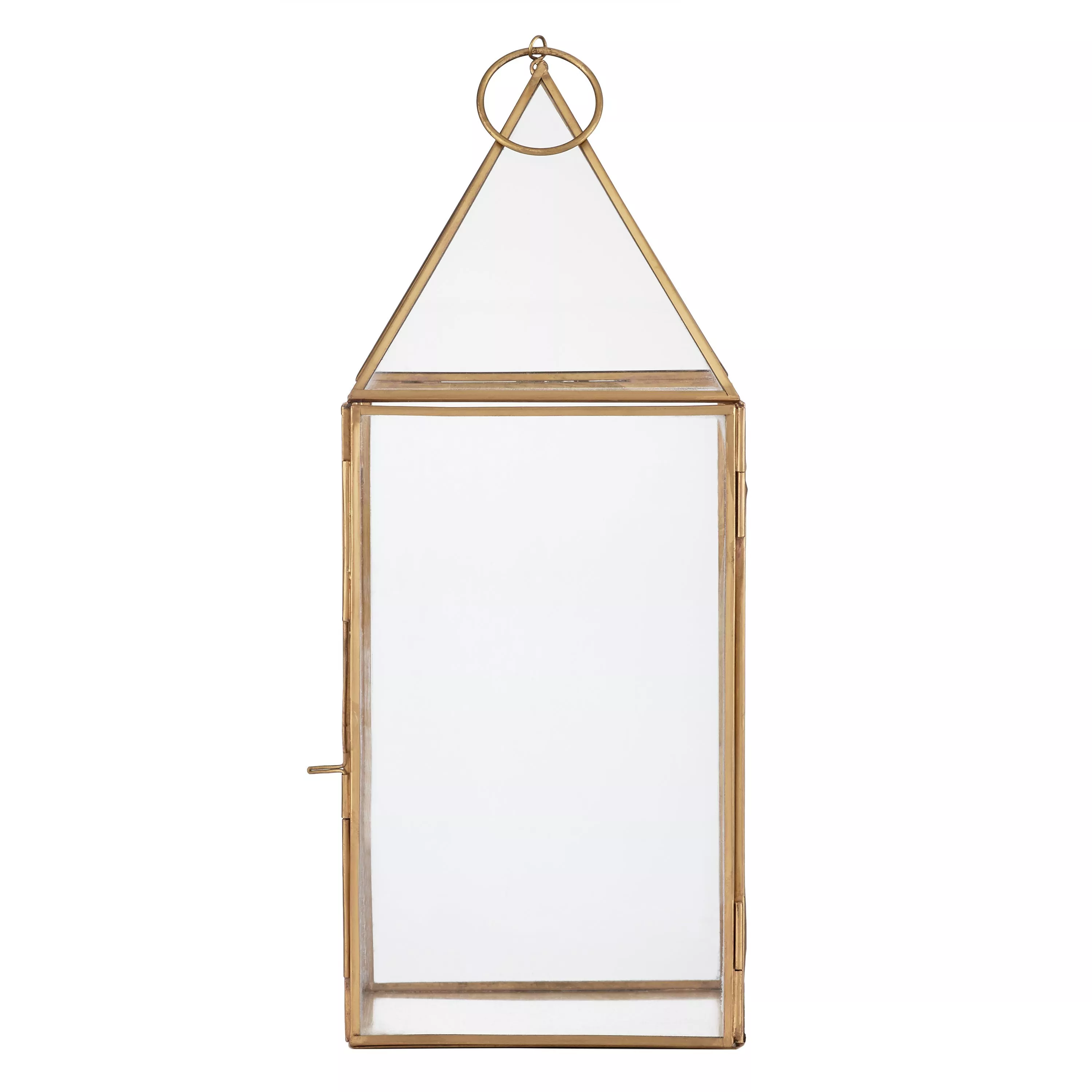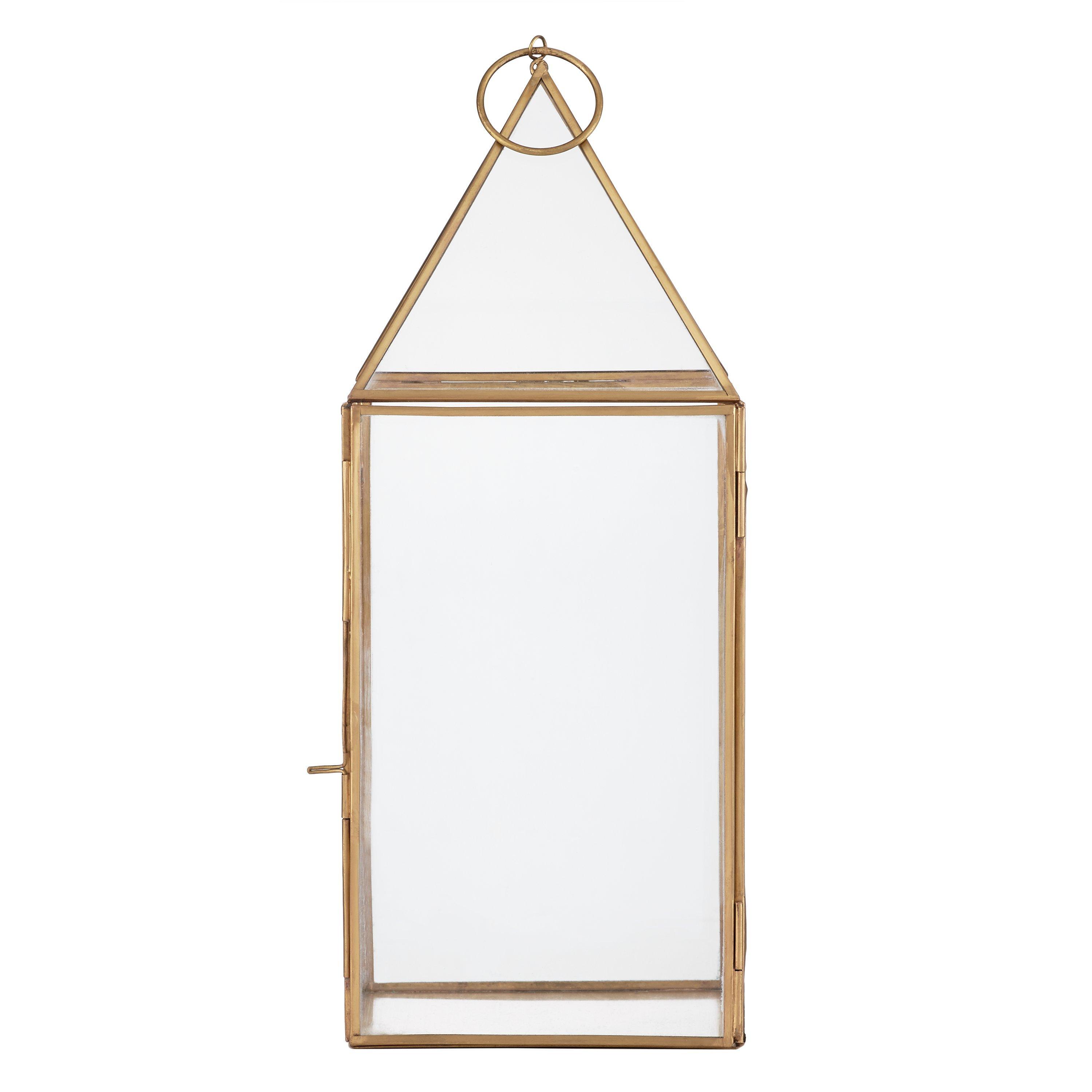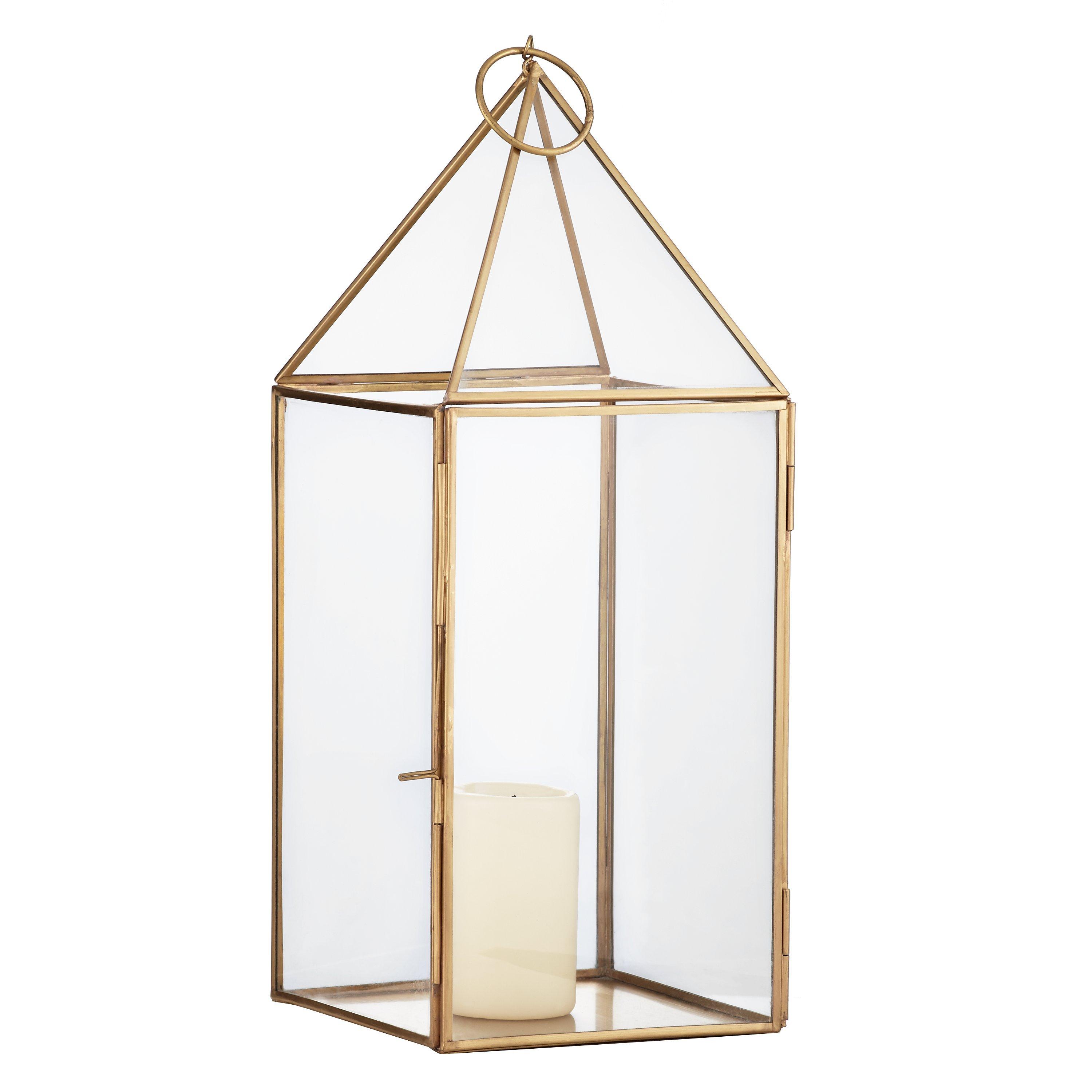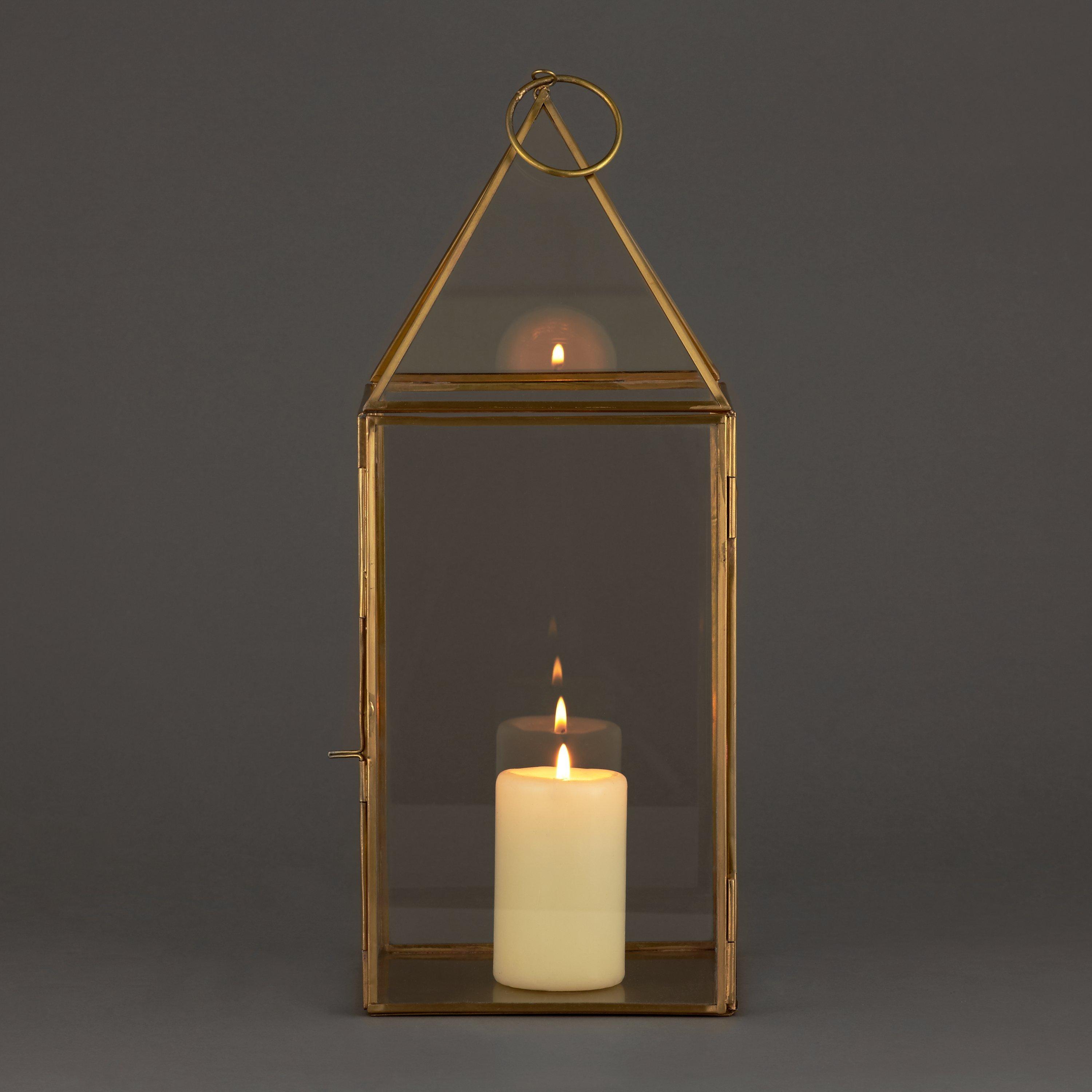 A matte brass effect finish with glass panelled sides and a simple pyramid shaped top allows the light to shine through brilliantly, creating a warm ambience.