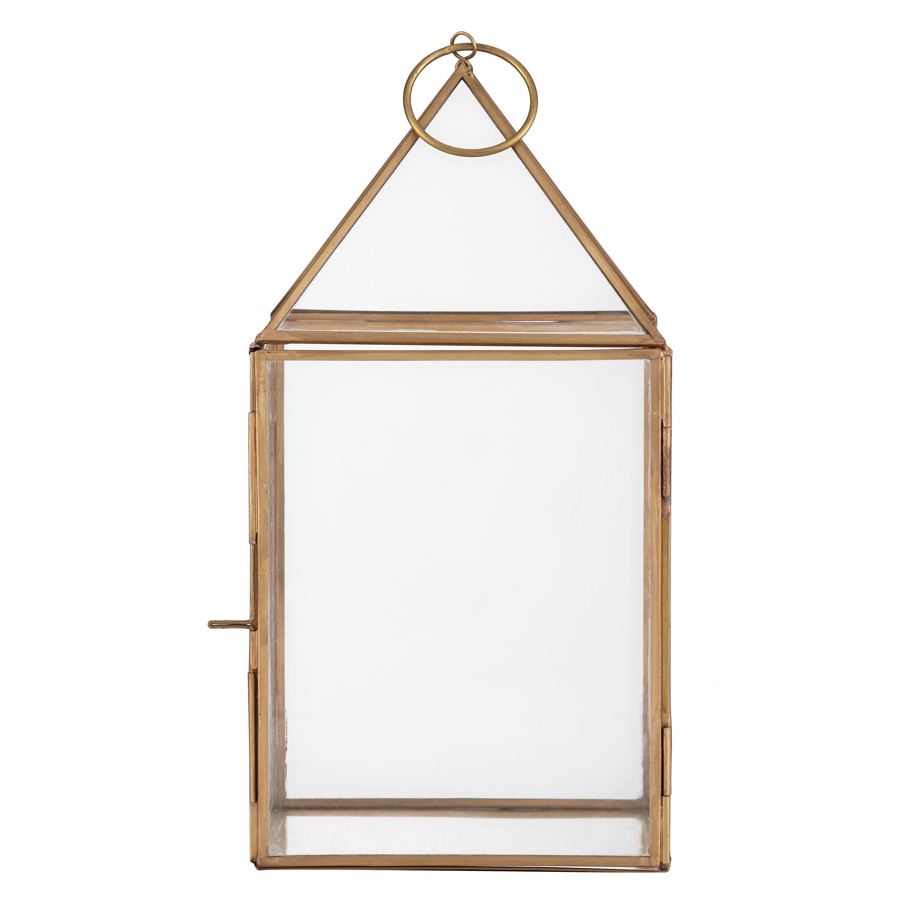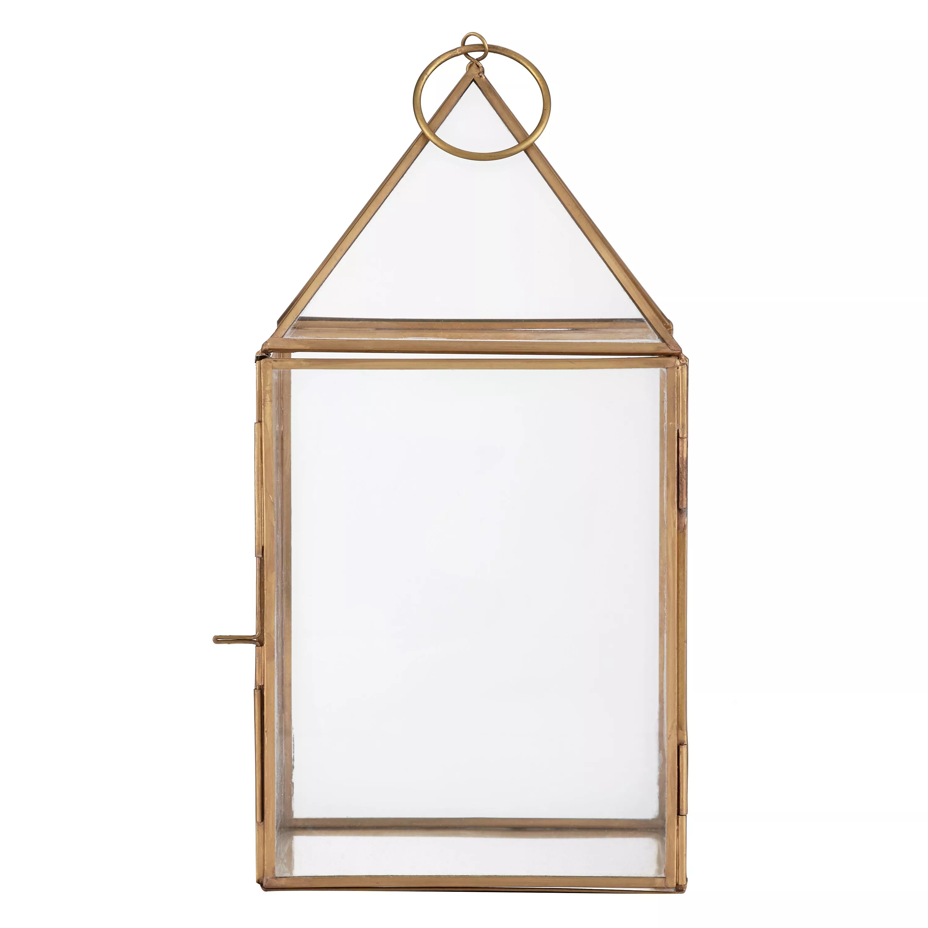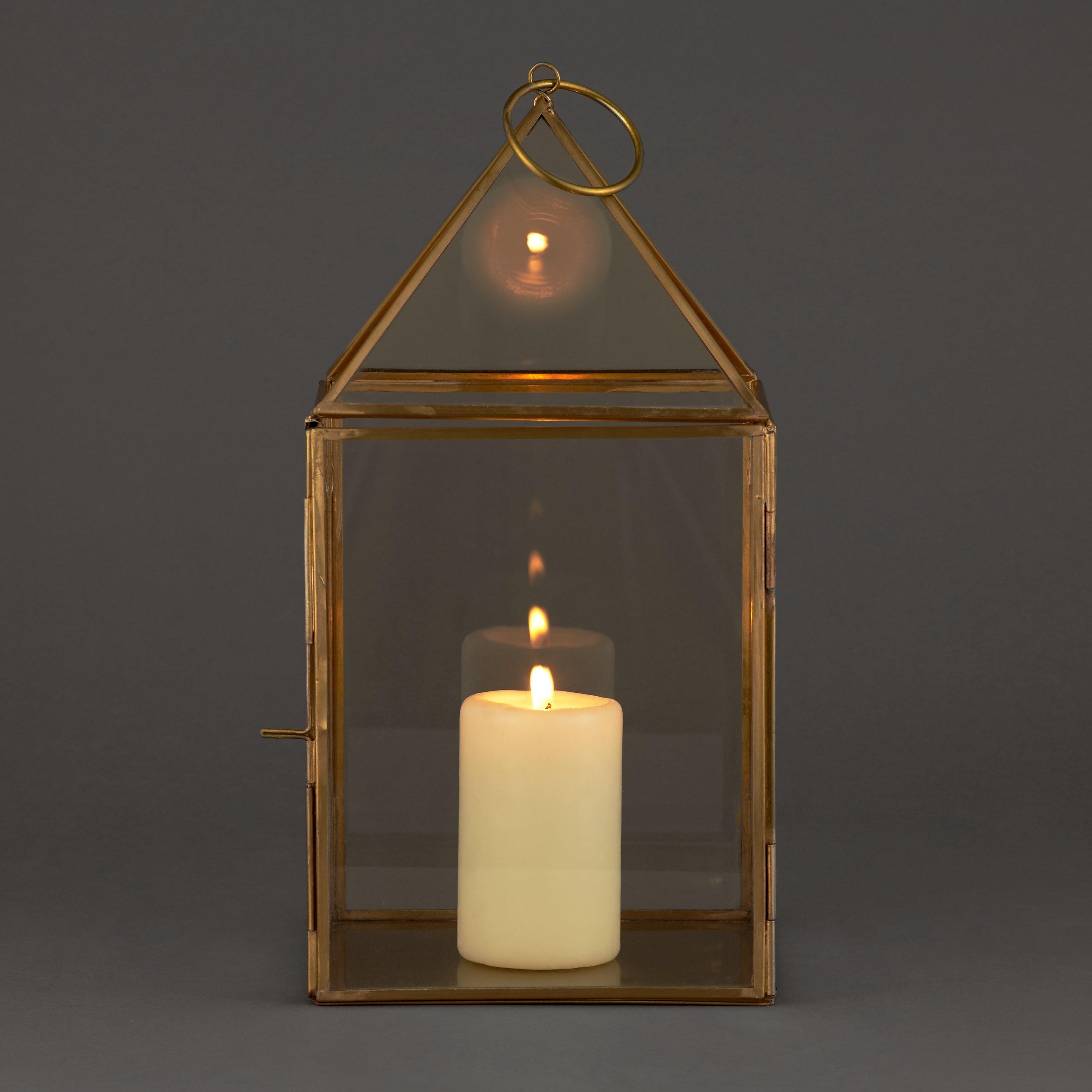 A matte brass effect finish with glass panelled sides and a simple pyramid shaped top allows the light to shine through brilliantly, creating a warm ambience.