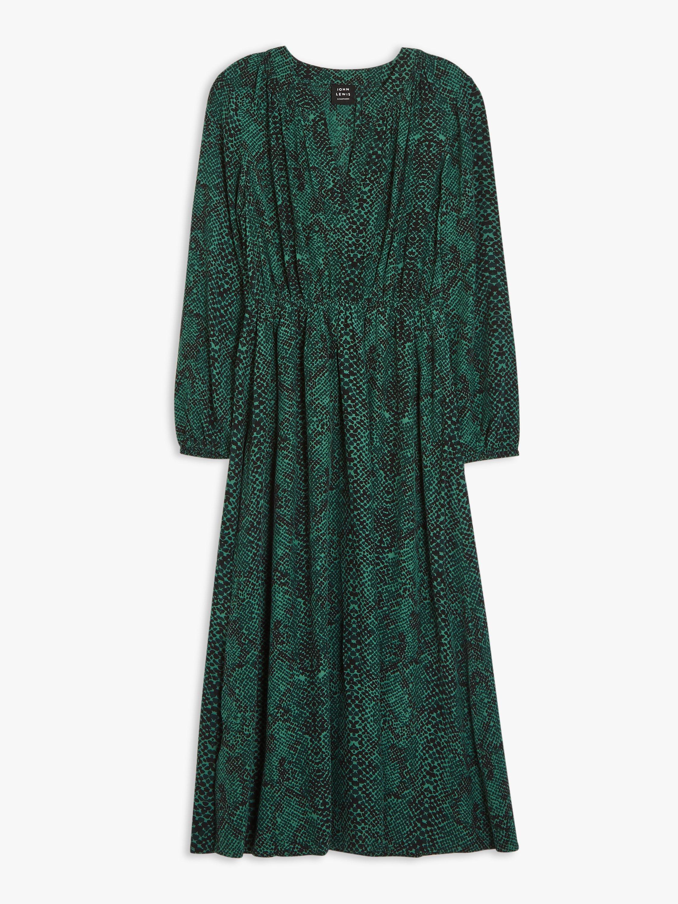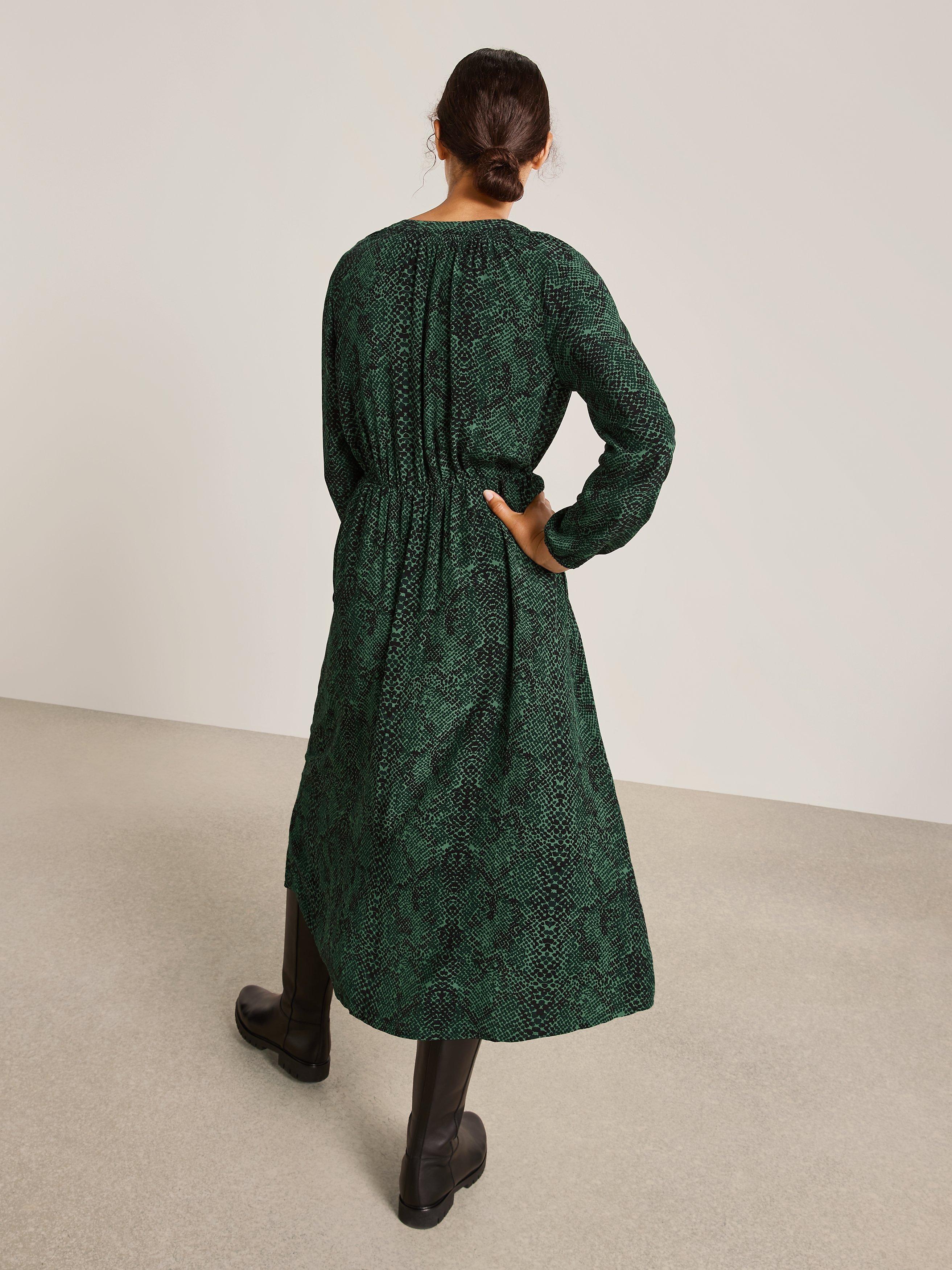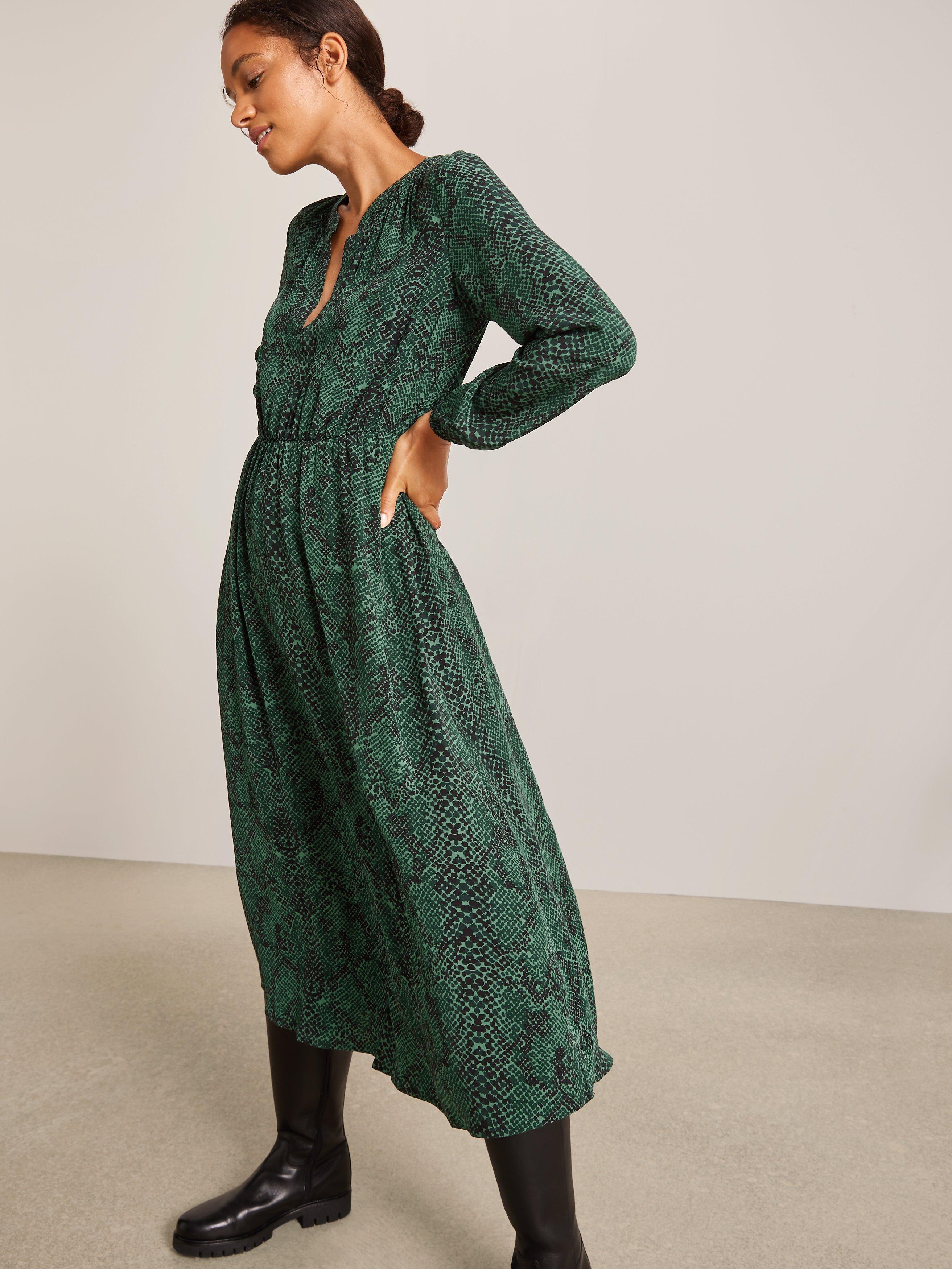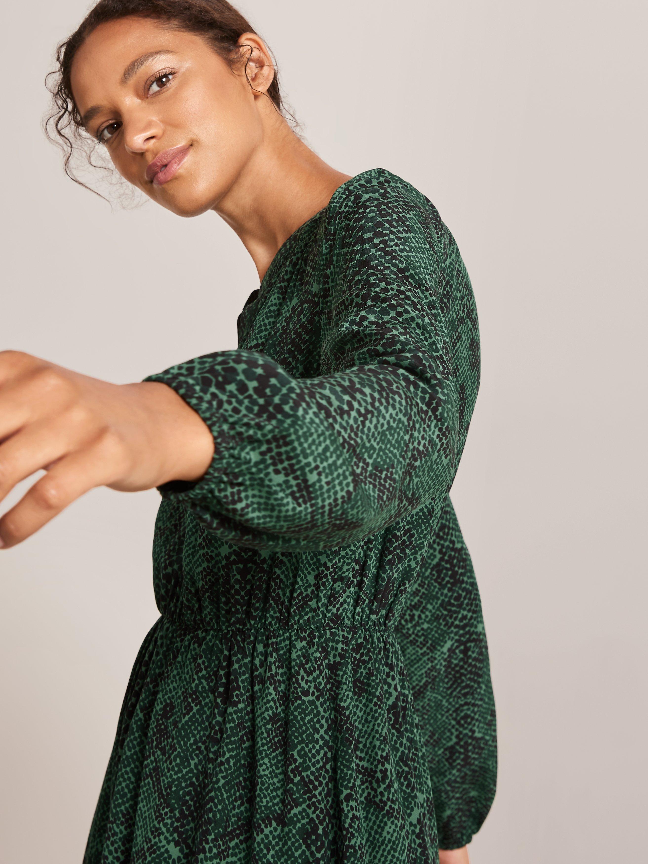 Our easy-fit midi dress is designed in our seasonal python print for maximum impact. It has a notch neck opening that sits close to the body, with gathered shirring detail offering a romantic inspiration to the silhouette. Complete with elasticated waist and cuff openings for easy wear.