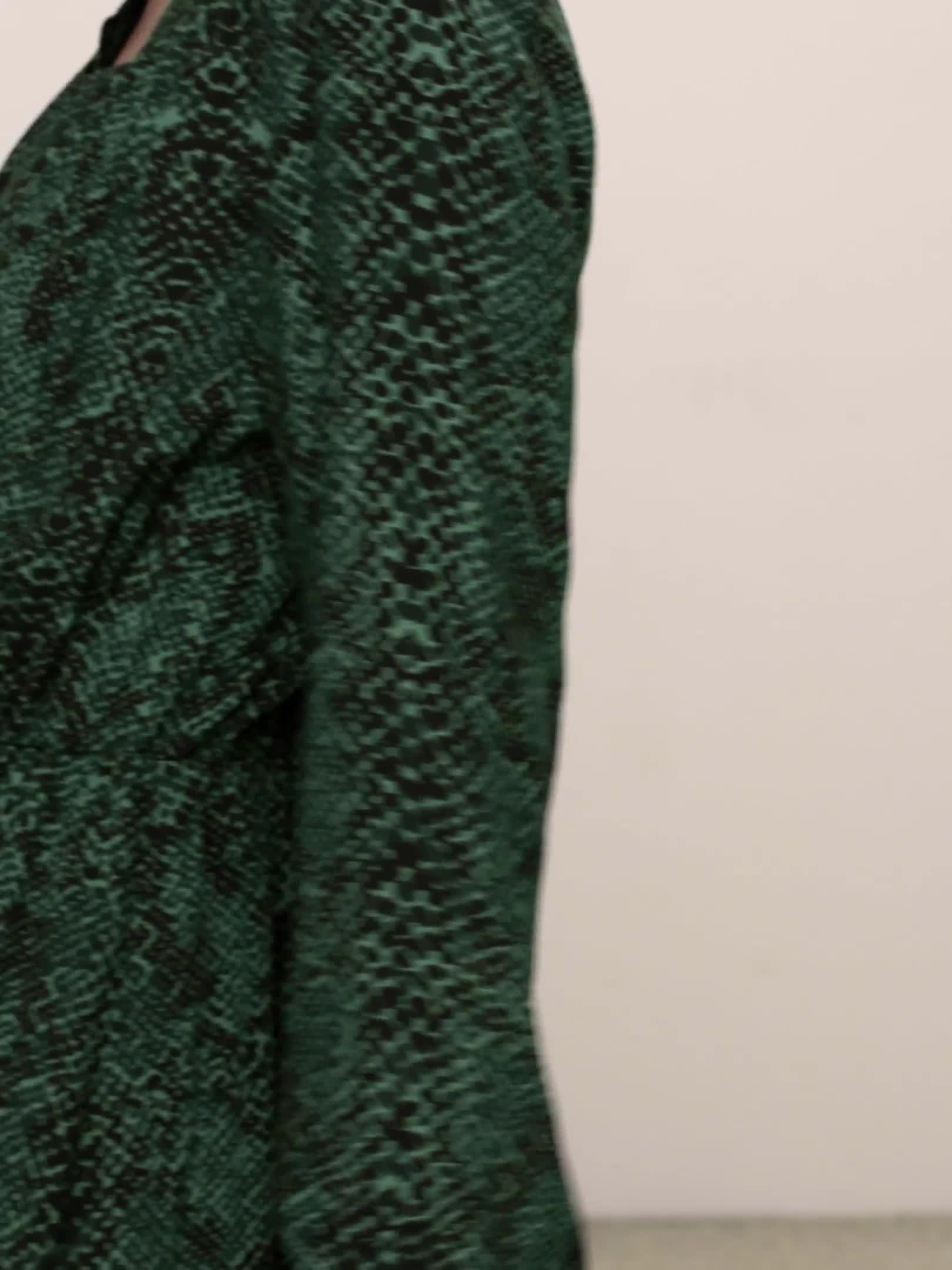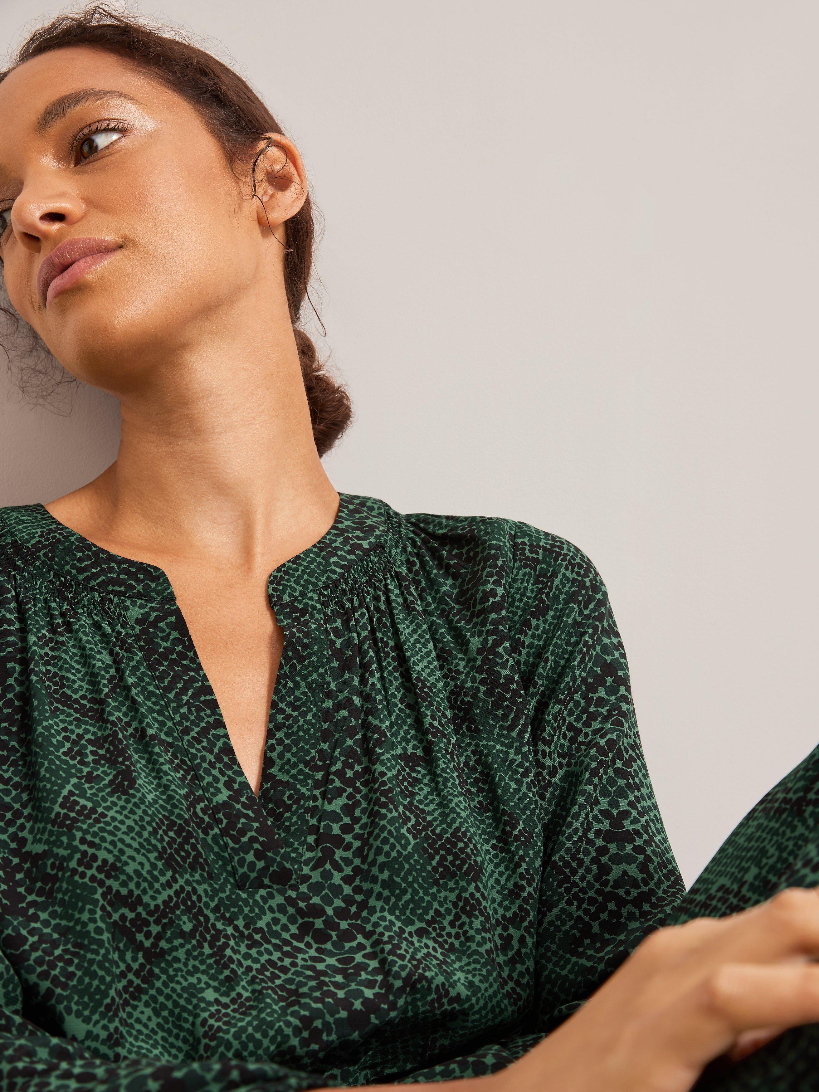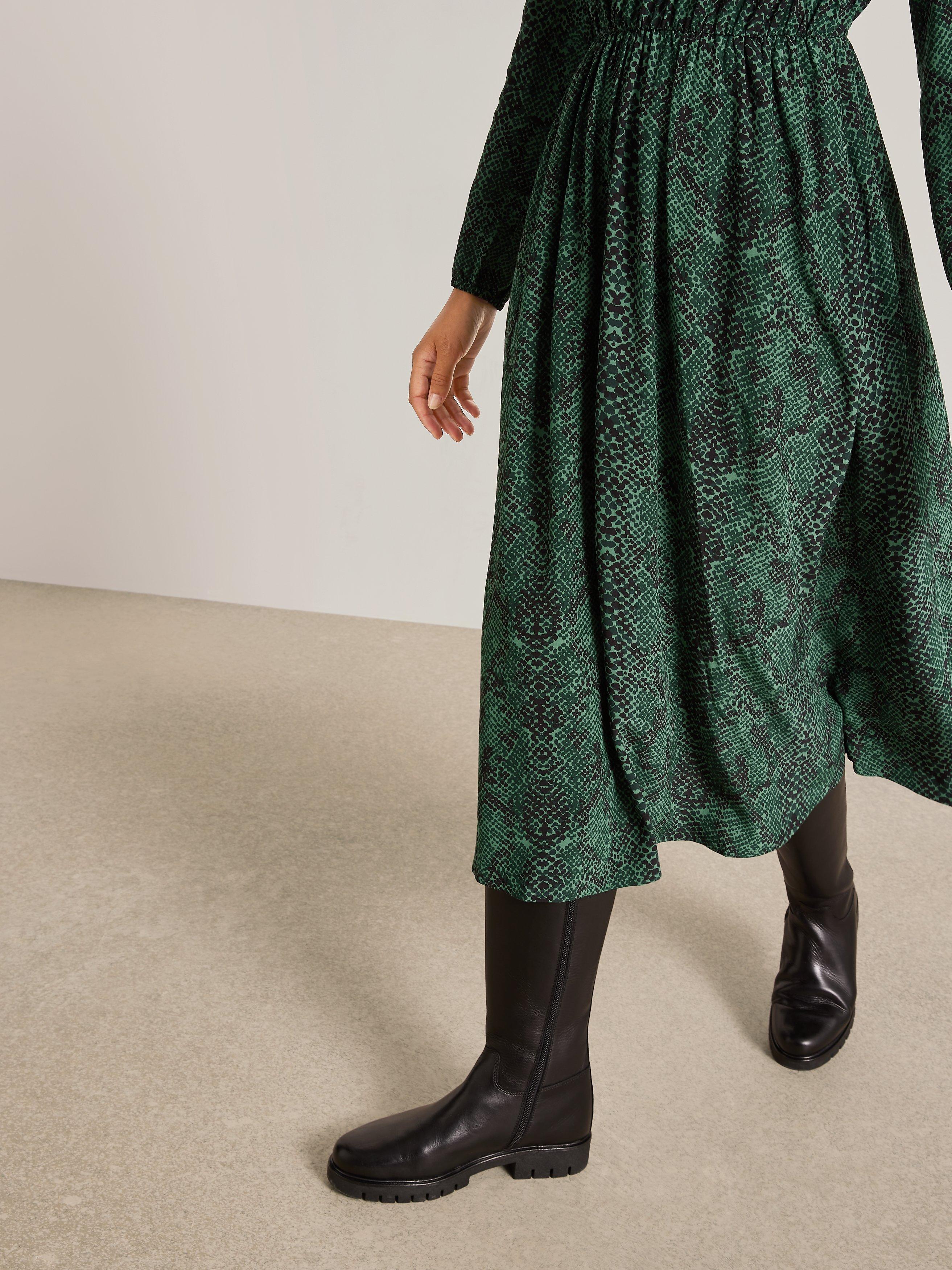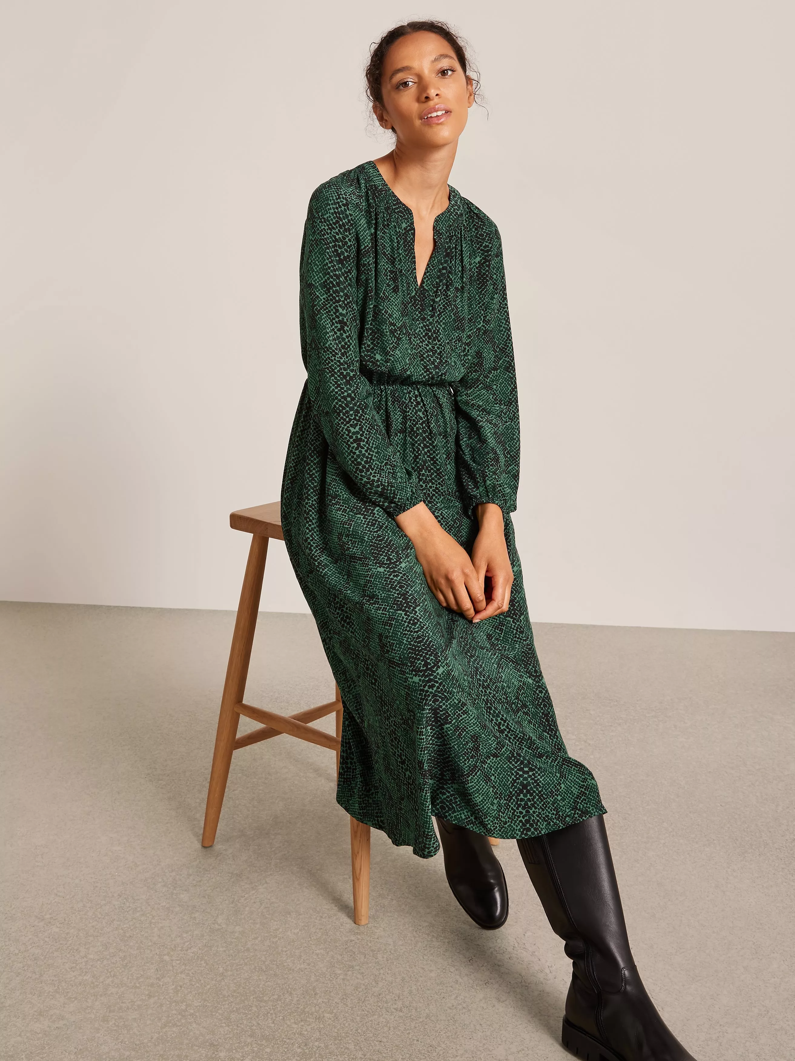 Our easy-fit midi dress is designed in our seasonal python print for maximum impact. It has a notch neck opening that sits close to the body, with gathered shirring detail offering a romantic inspiration to the silhouette. Complete with elasticated waist and cuff openings for easy wear.