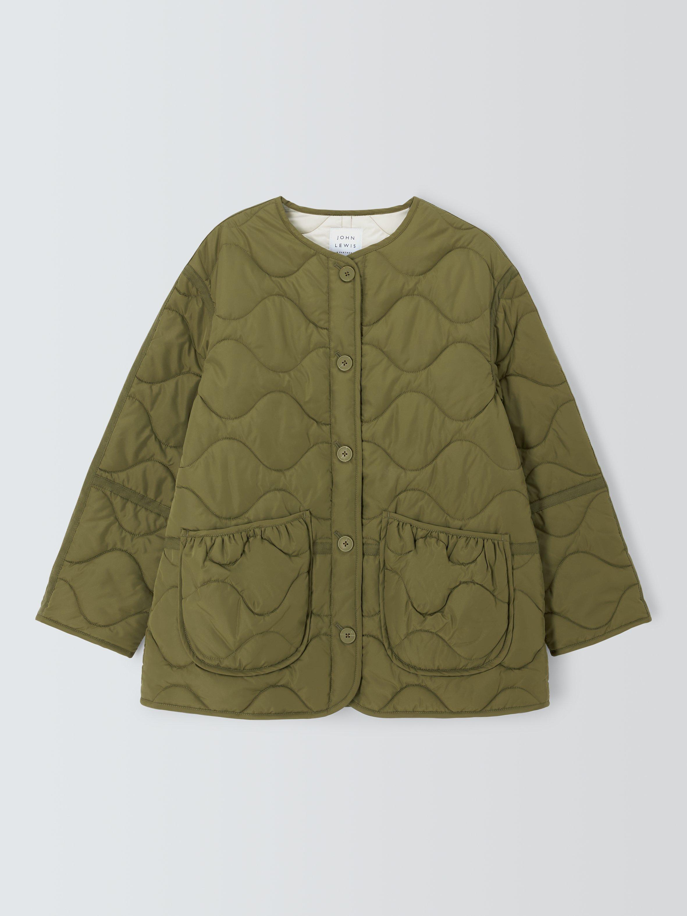 In a classic quilted style, this lightweight jacket features large pockets at the front and is pulled together by tonal button detailing. One for weekend strolls and city and exploring.