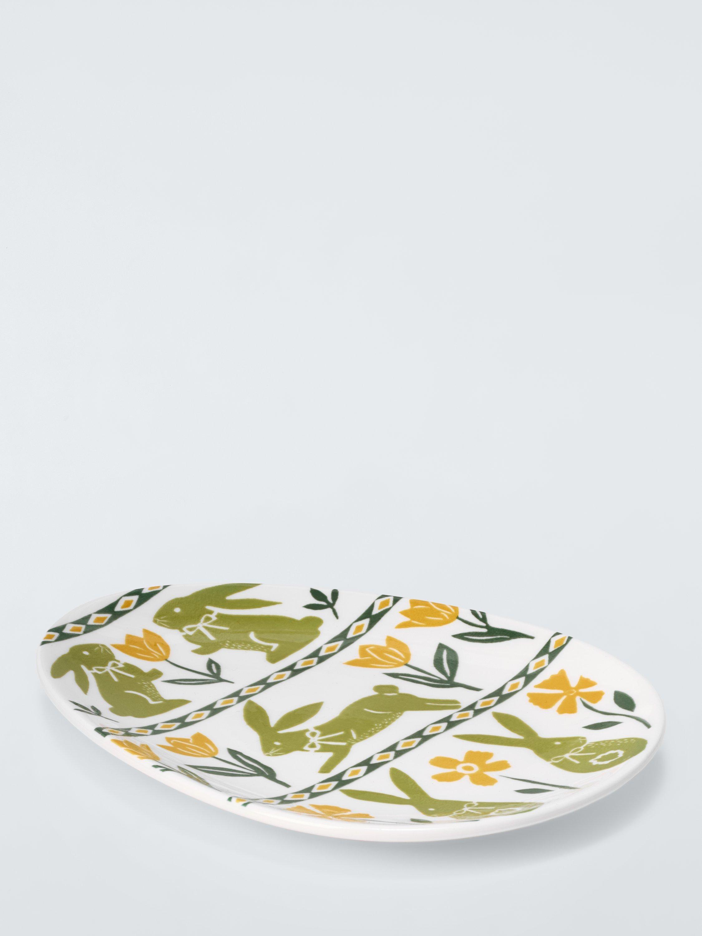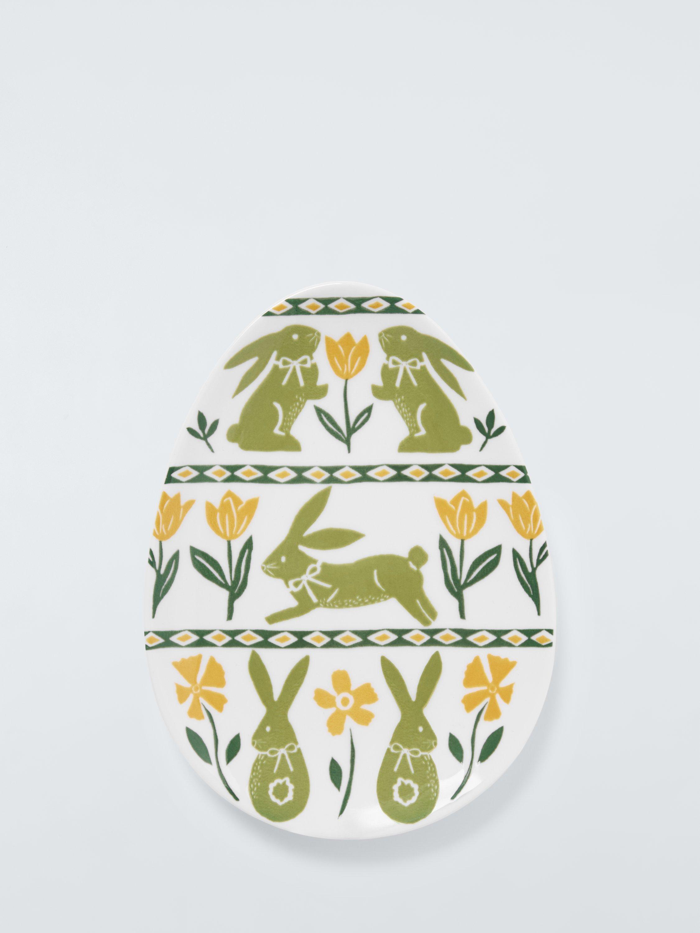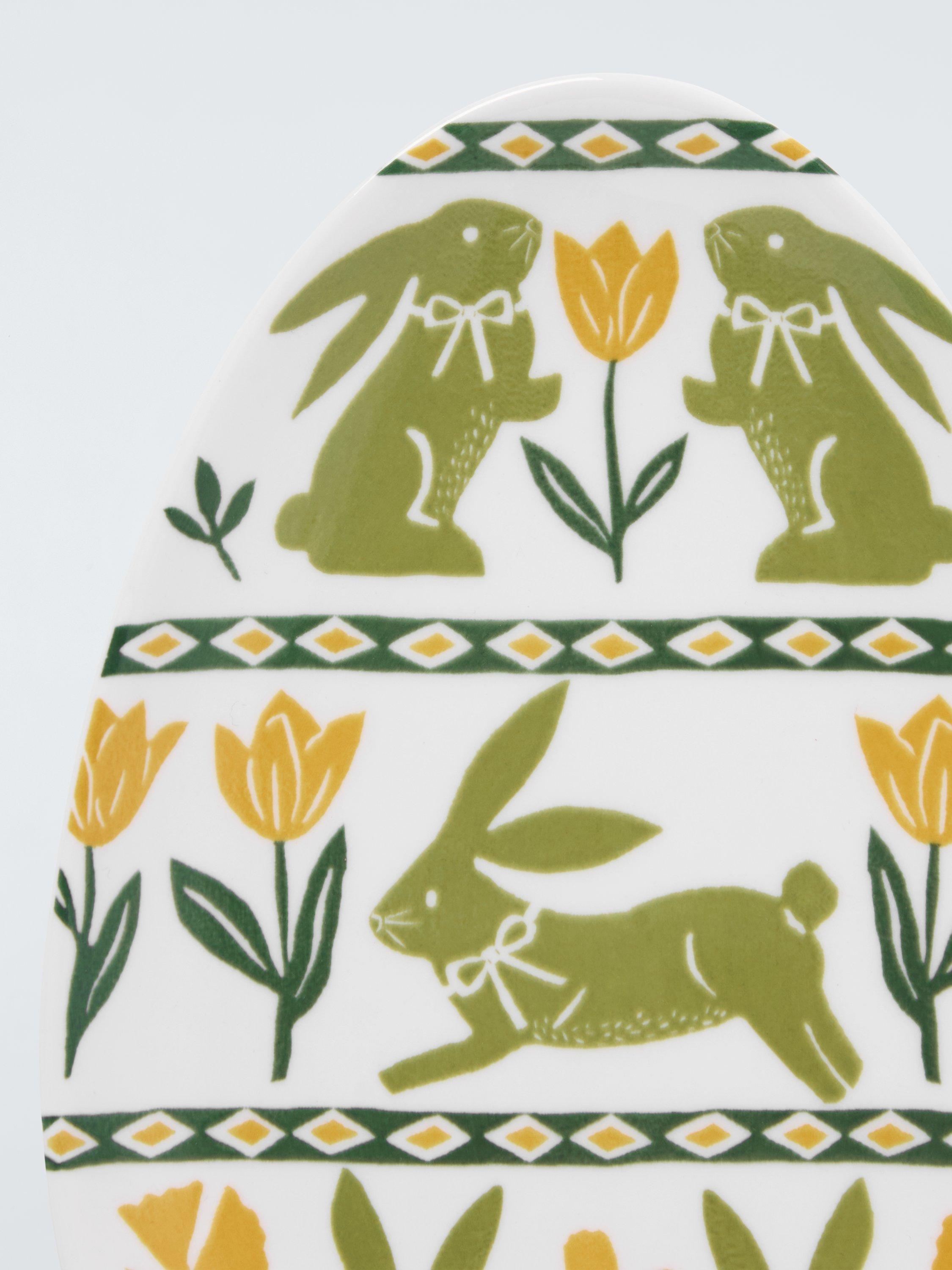 Easter egg-shaped plate with a colourful rabbit and spring flowers design. Made of fine china, it's dishwasher and microwave-safe.