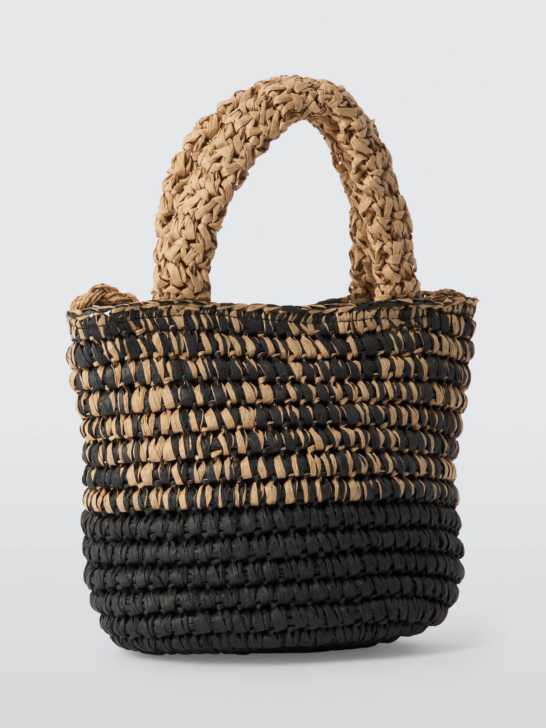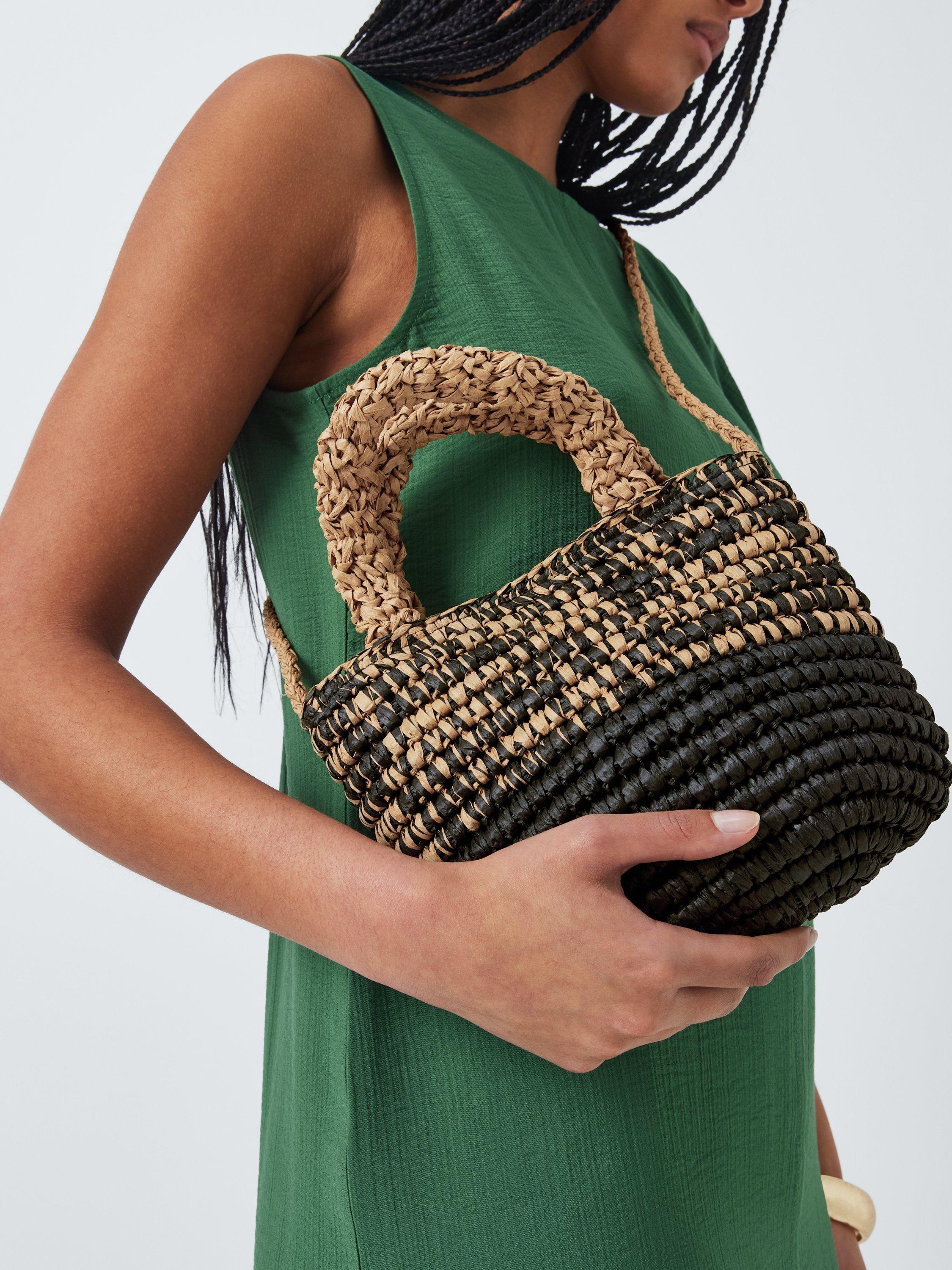 Natural material and modern design combine on this grab bag. Woven raffia creates texture in a two-tone look. Use the top handles or shoulder strap for versatile carrying options. Closes with a press stud fastening.