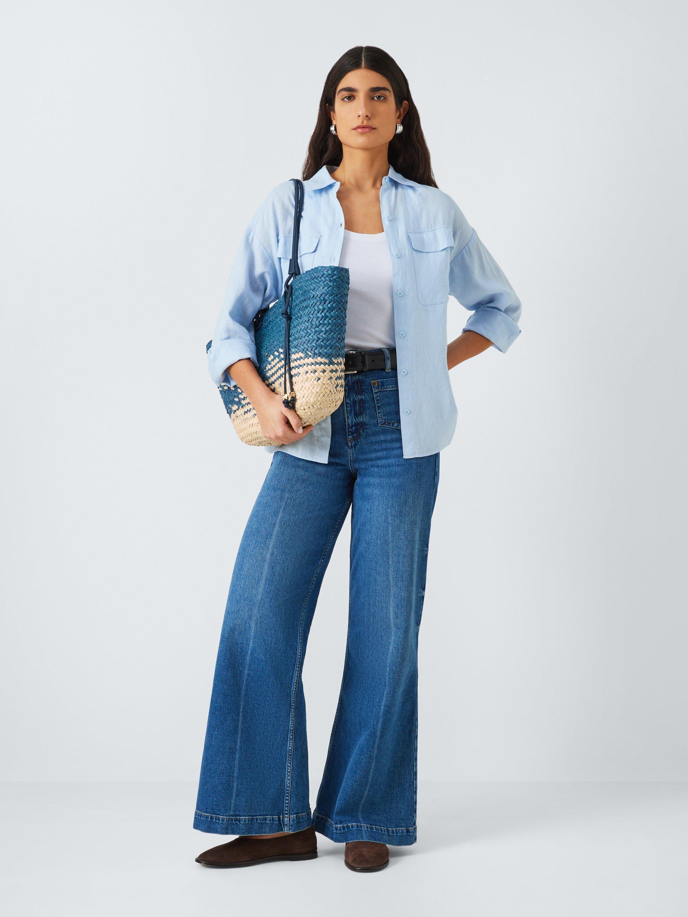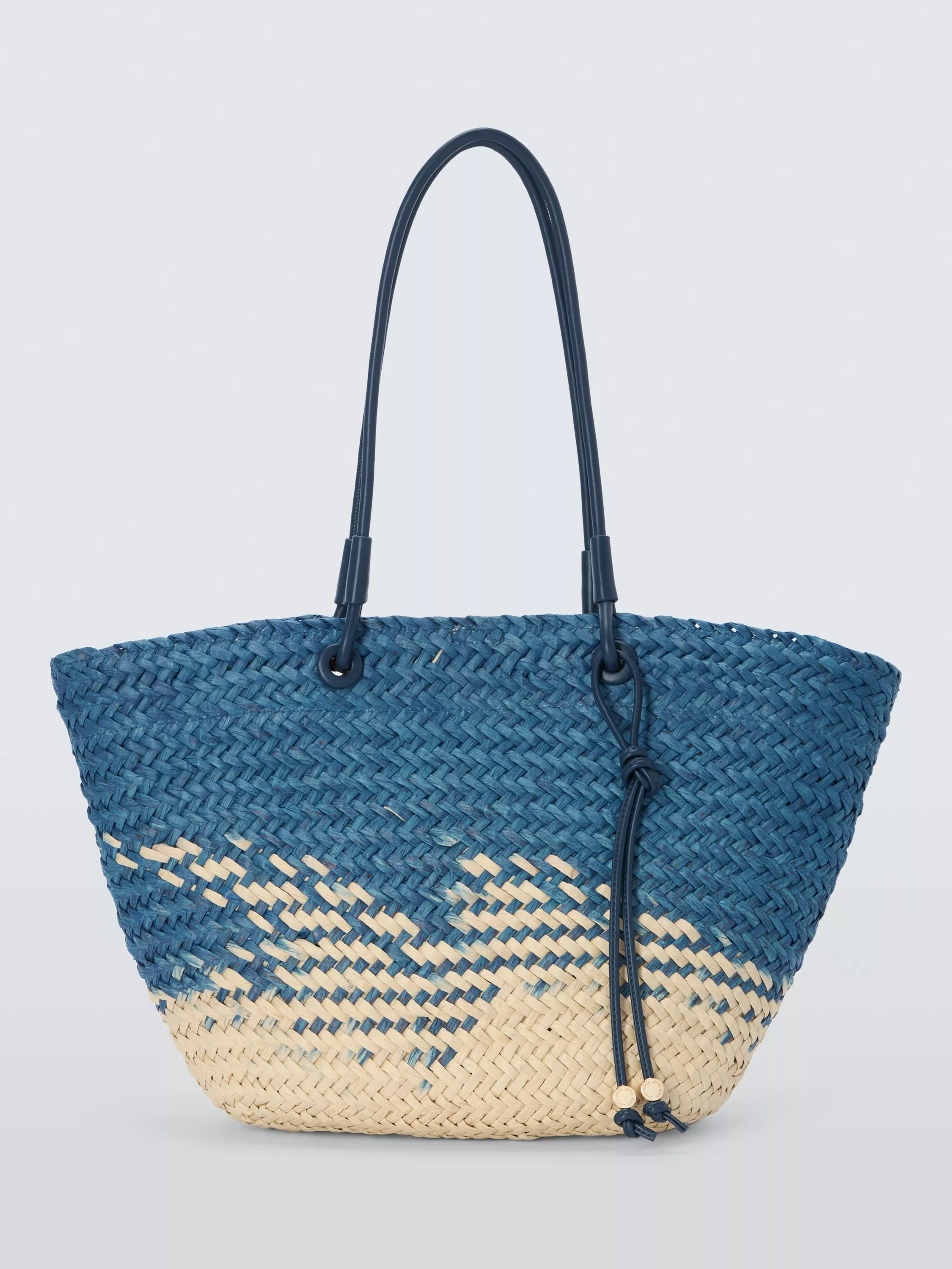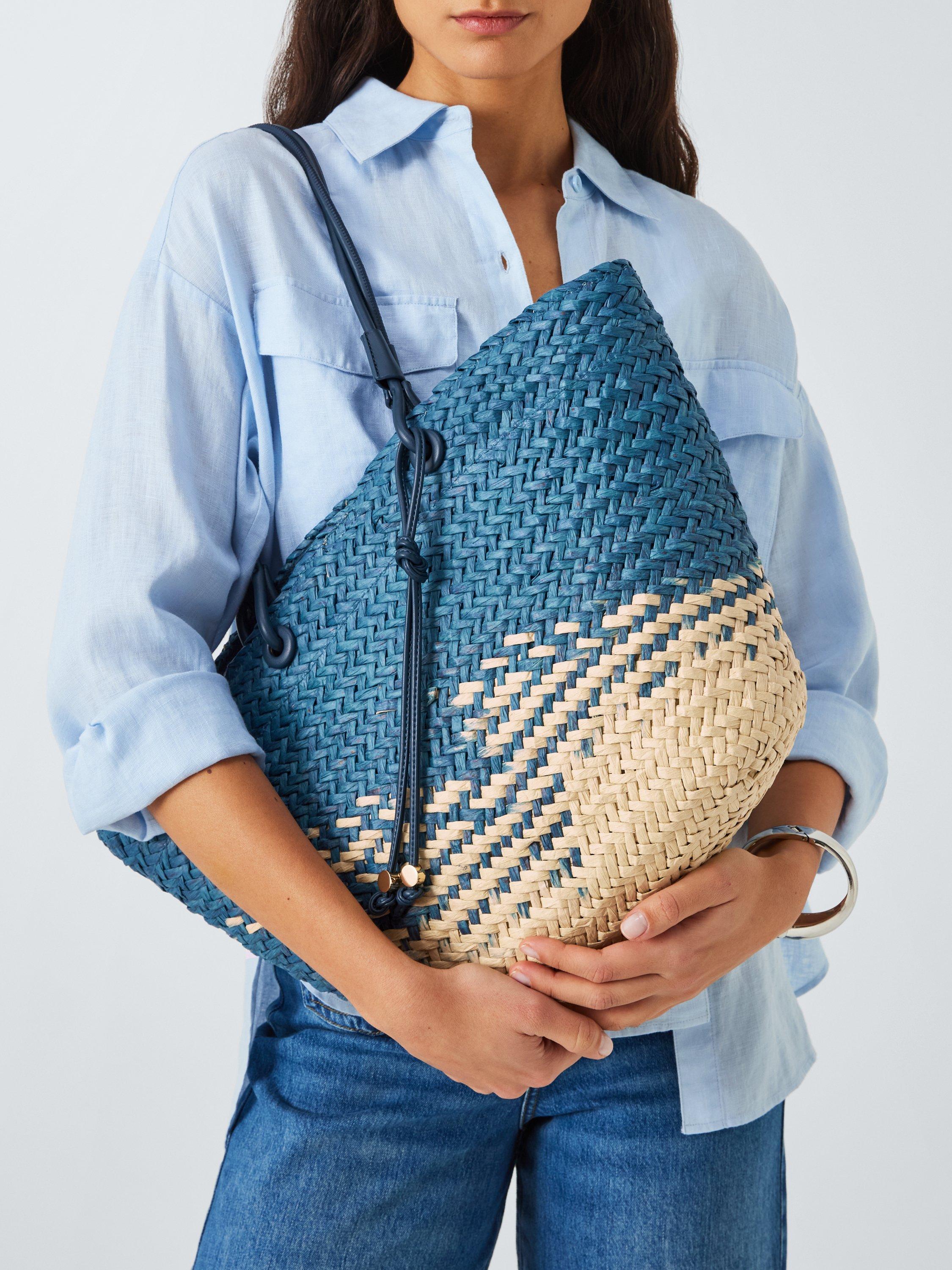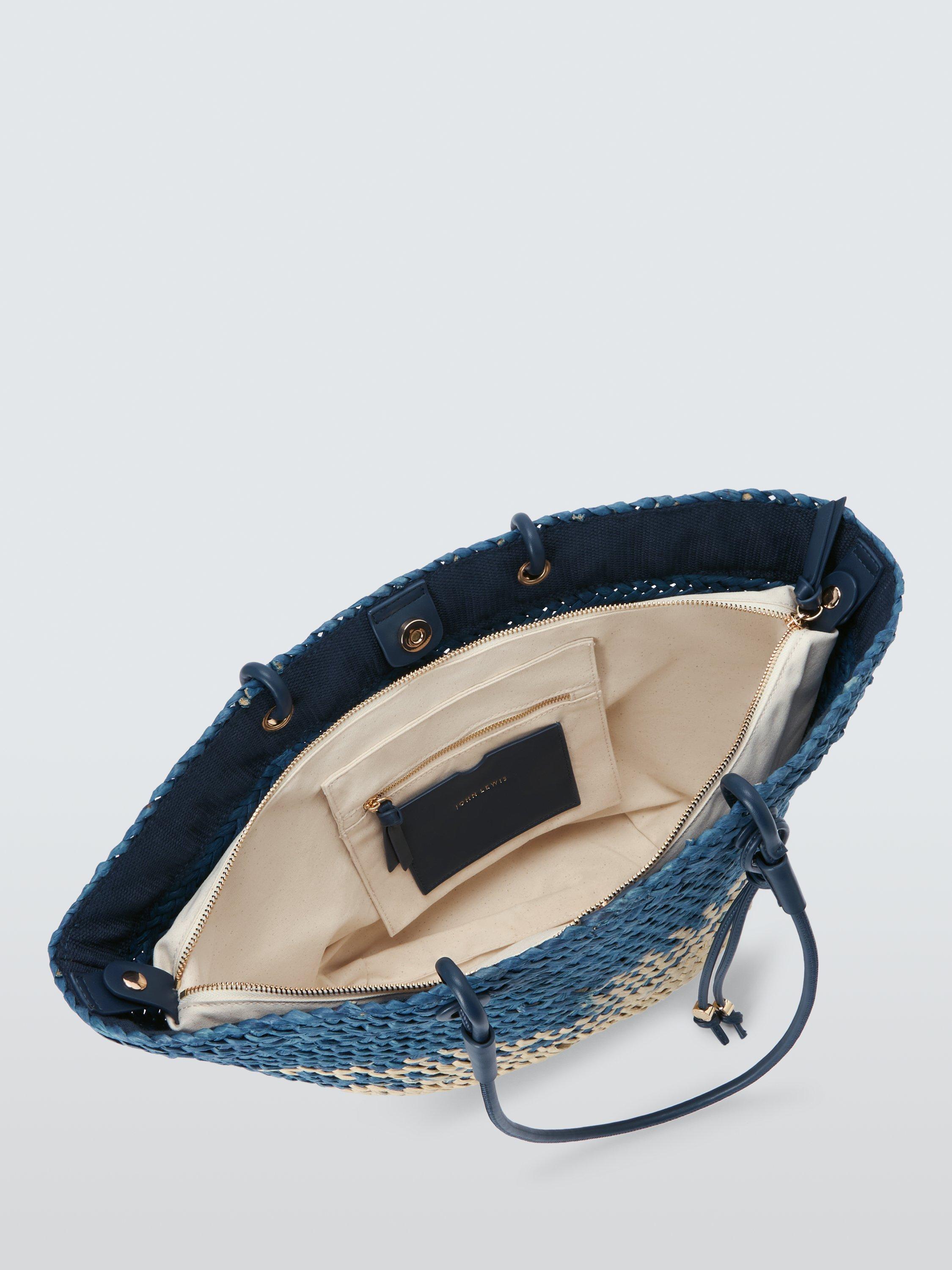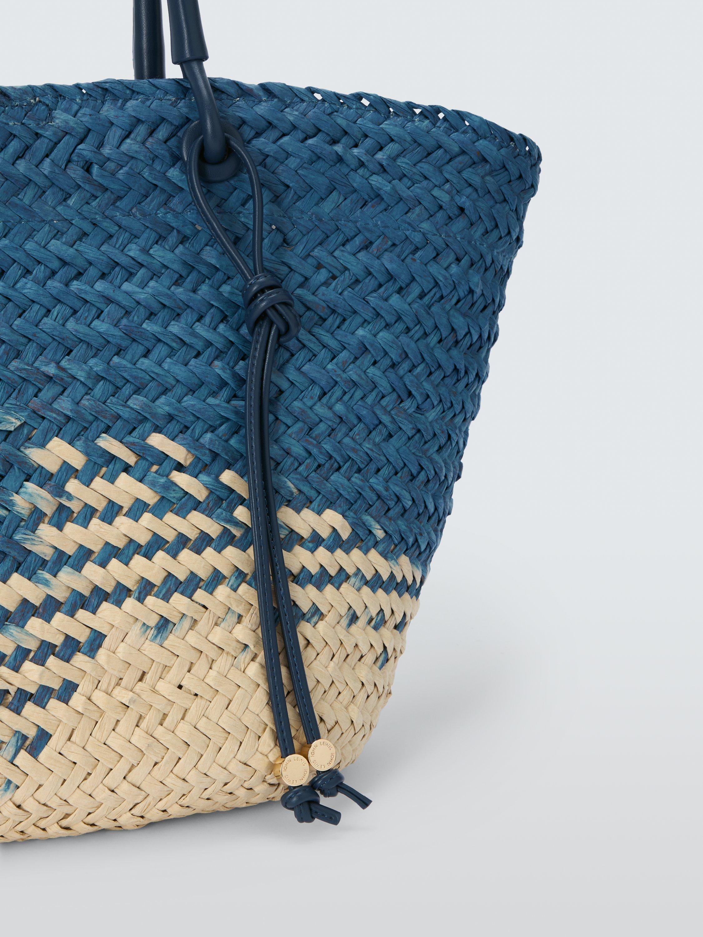 Natural material and modern design combine on our tote bag. Woven raffia creates texture, and the handles offer easy hands-free convenience.