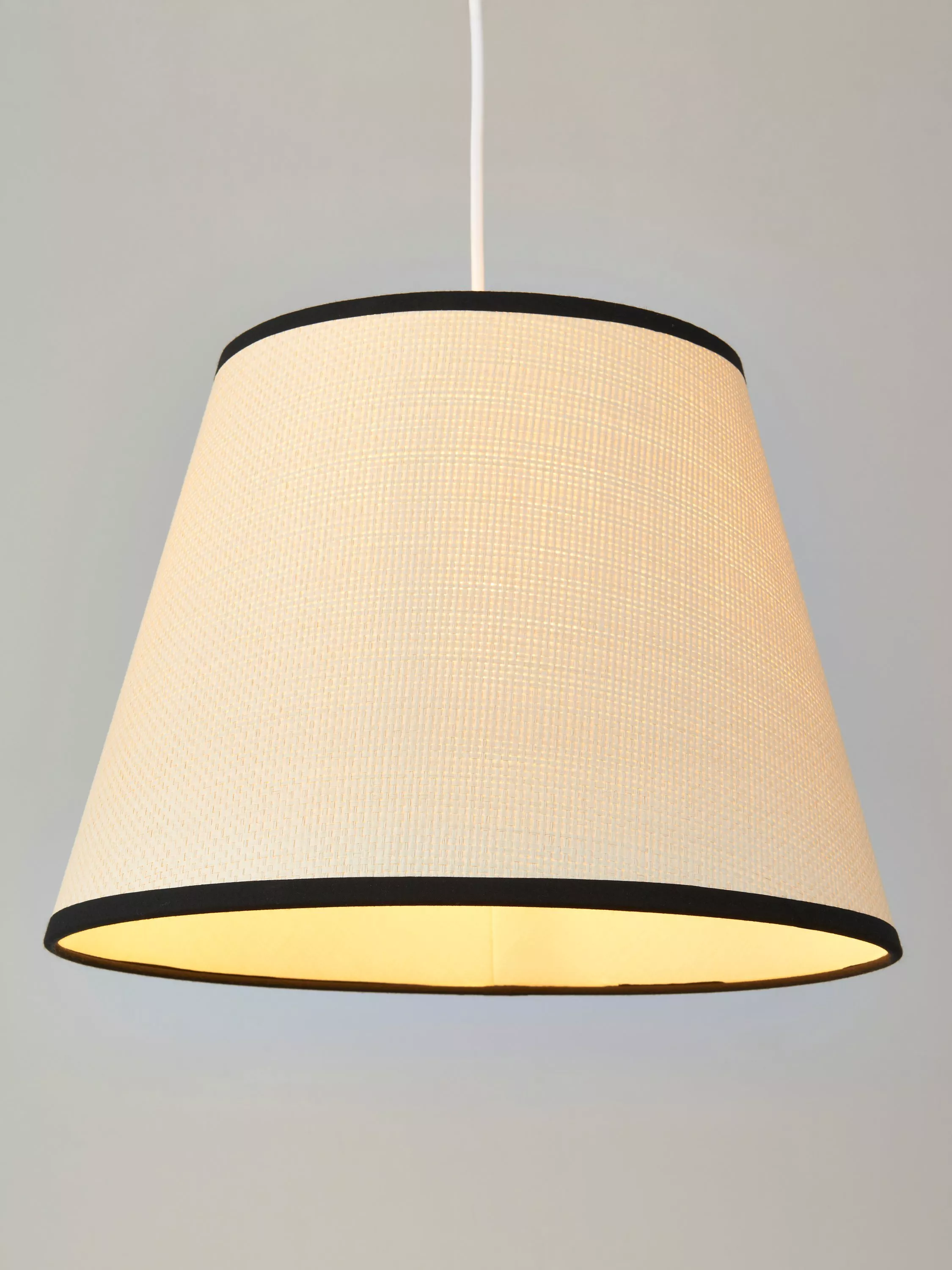 Lampshade with a signature look using a woven raffia twine, complemented with a contrasting colour on the taped edges to highlight the natural material.