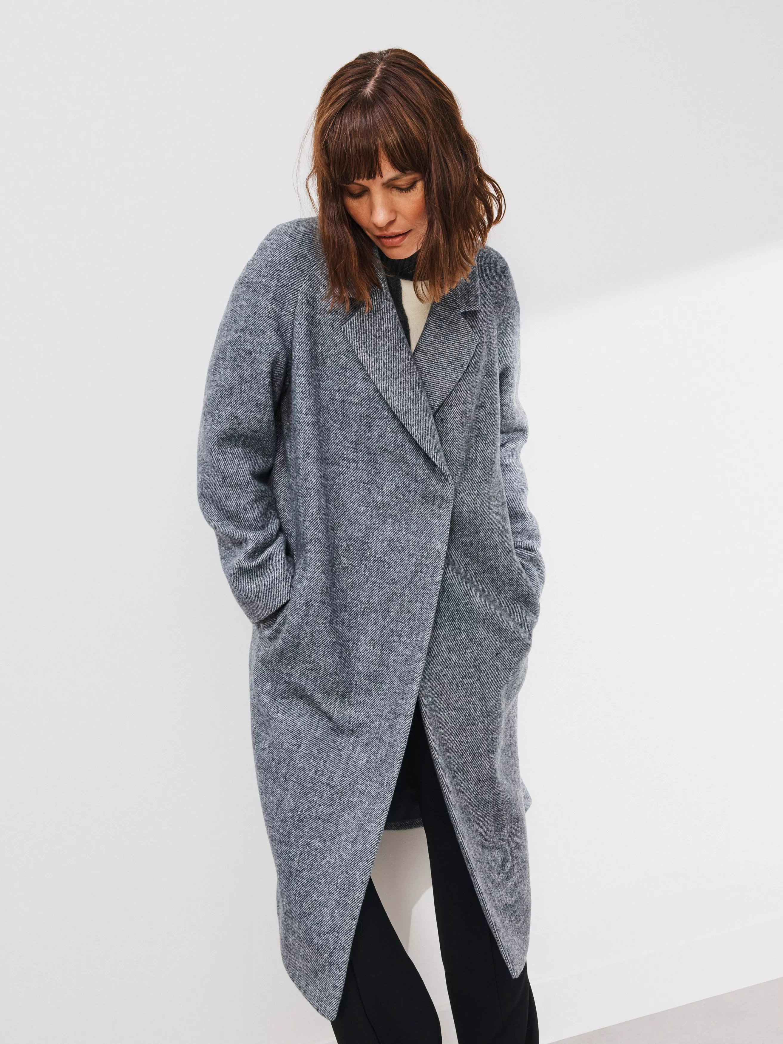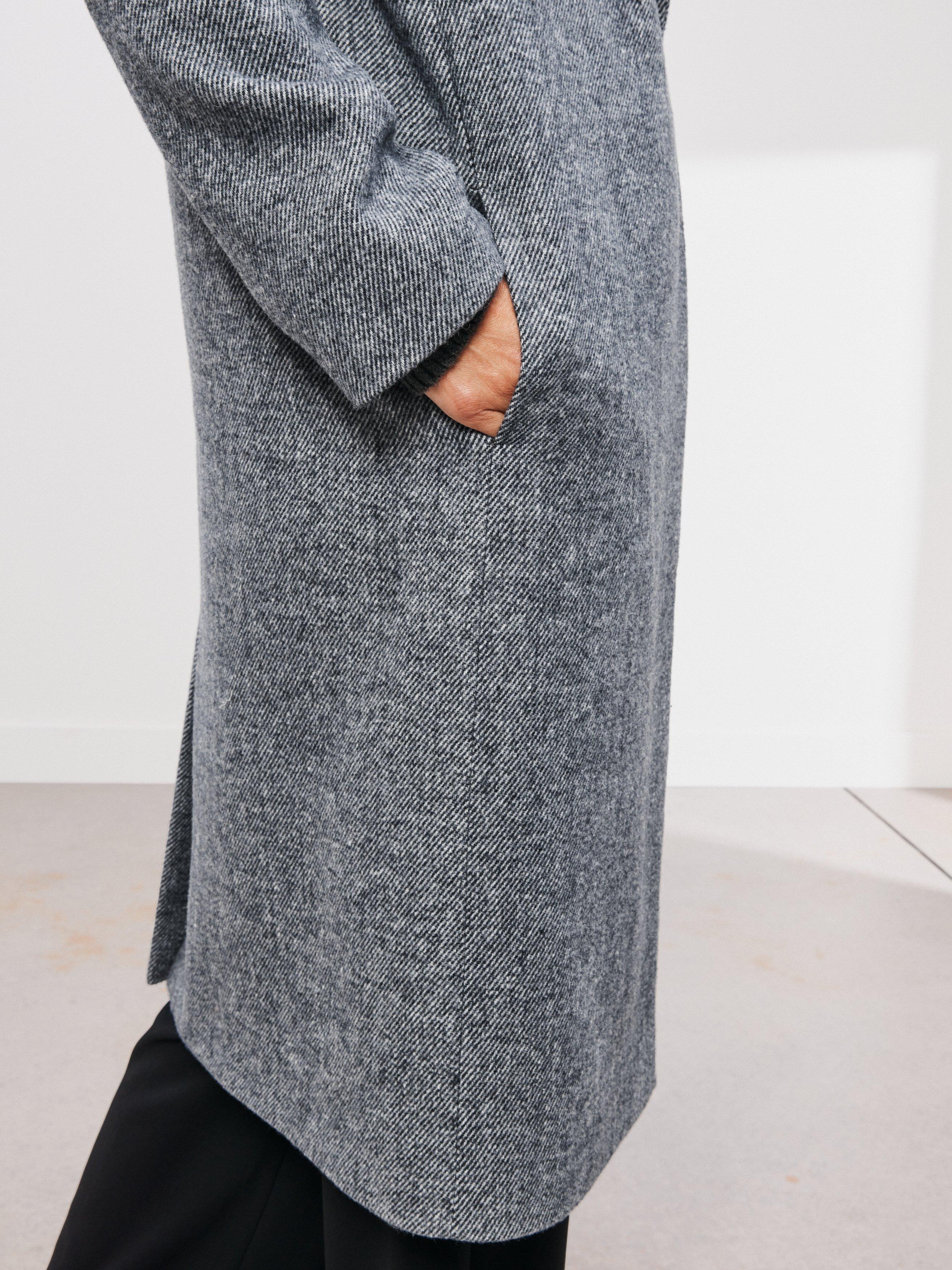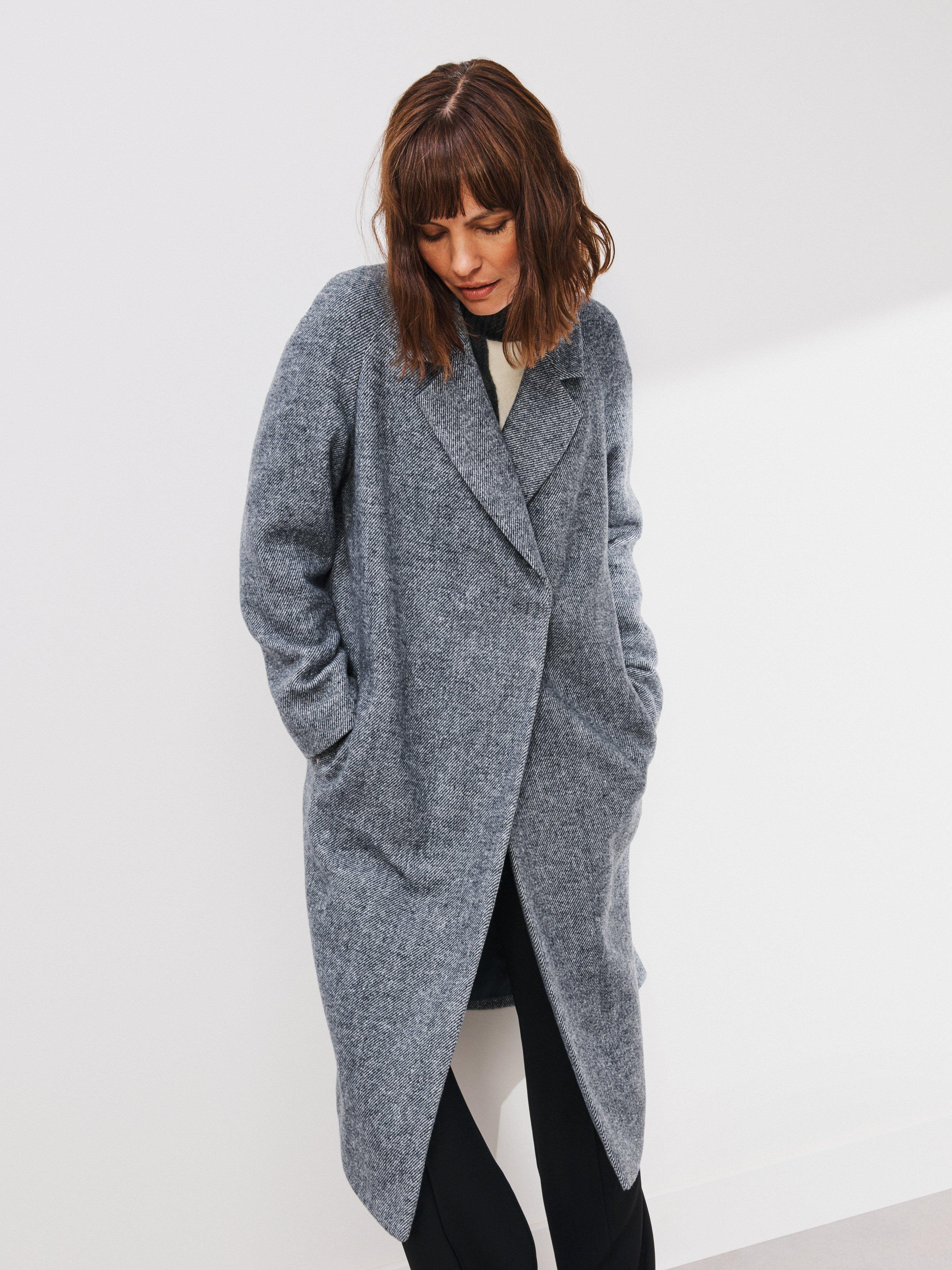 Everyone needs a sweeping long coat for extra coverage through autumn and into the winter. Modern at heart, this coat features a buttonless front for a clean finish and is designed with a neat collar and raglan sleeve framing. Ideal for wintery commutes to coffee shop dashes and everything in between.