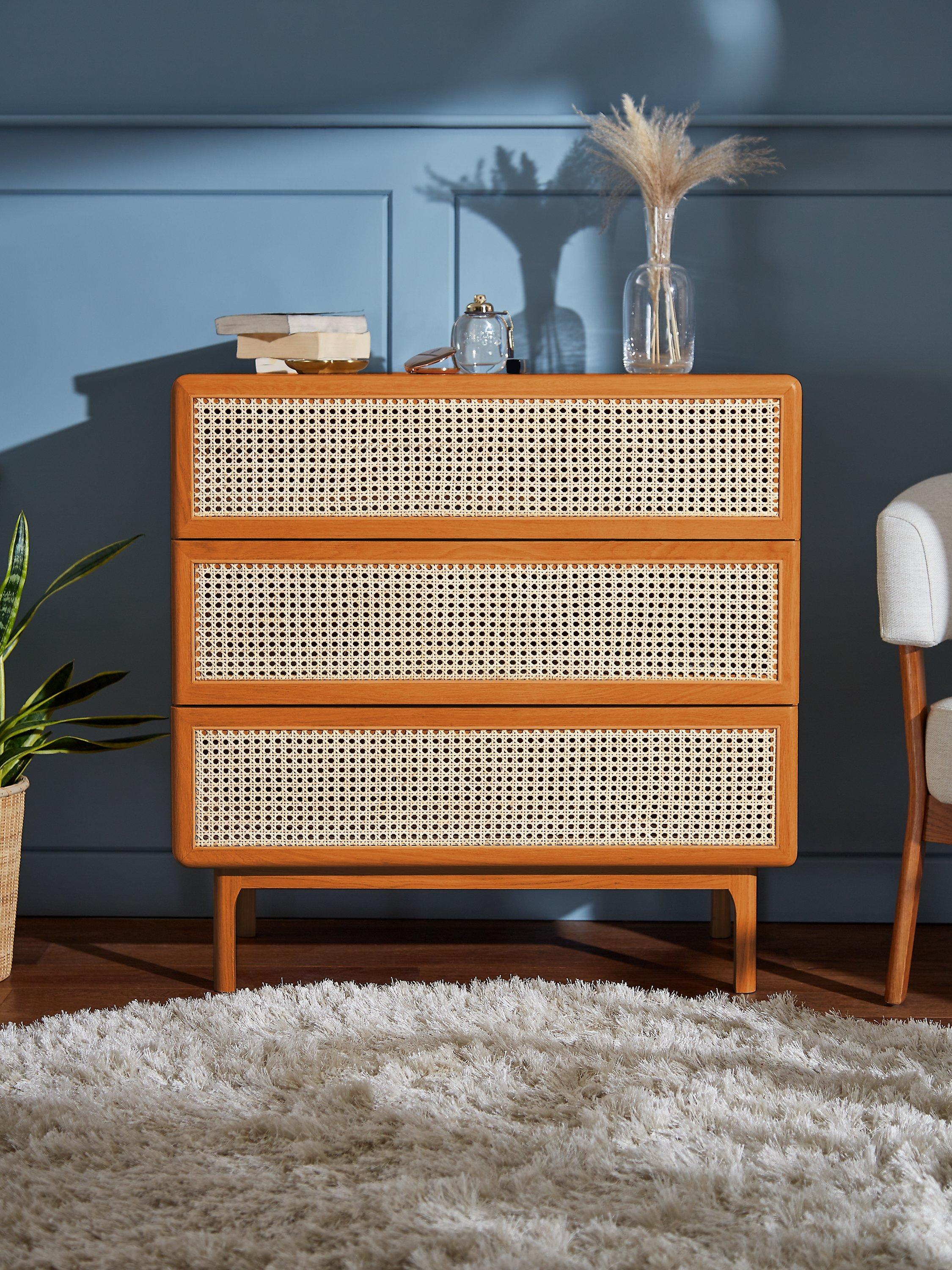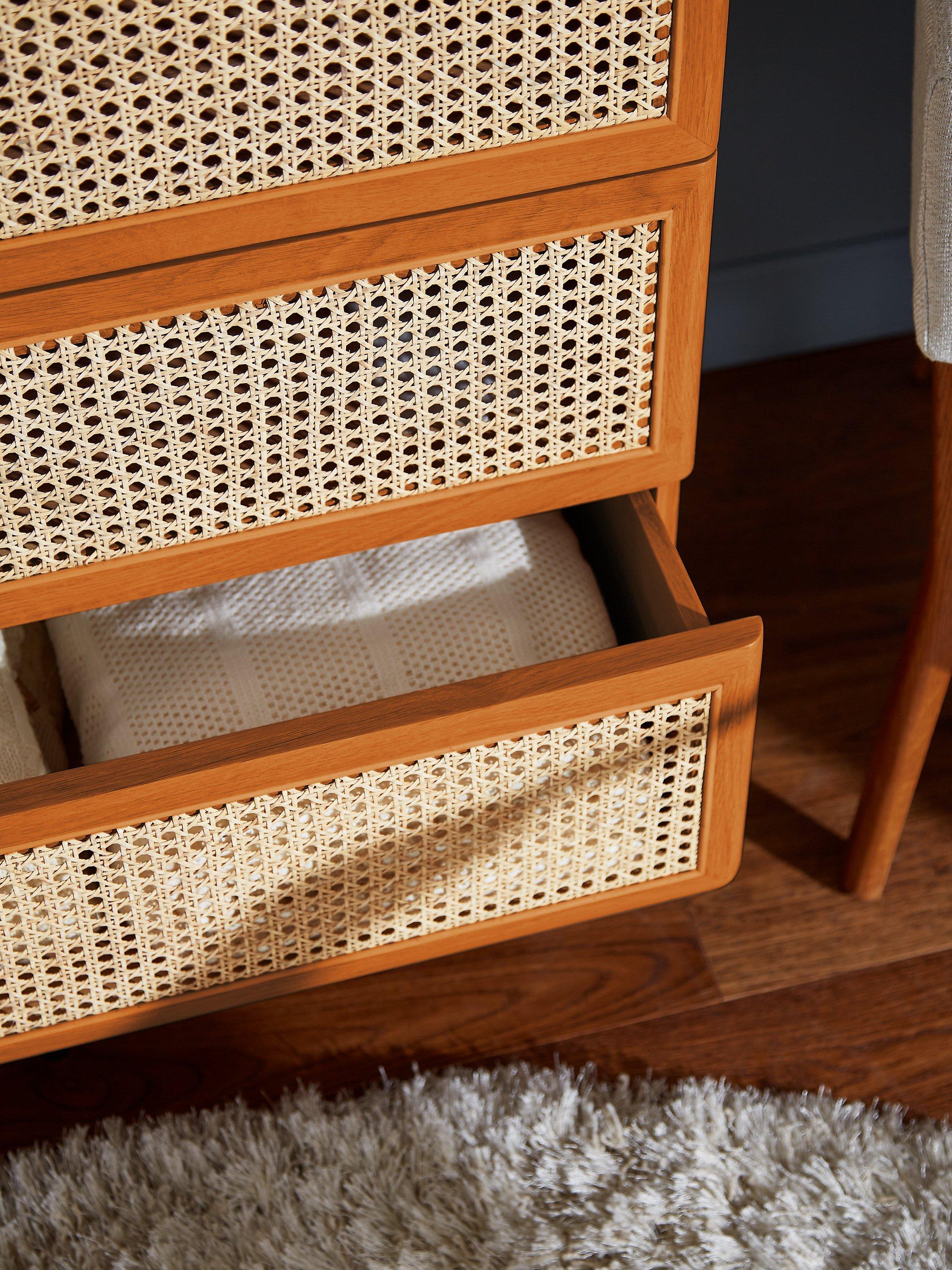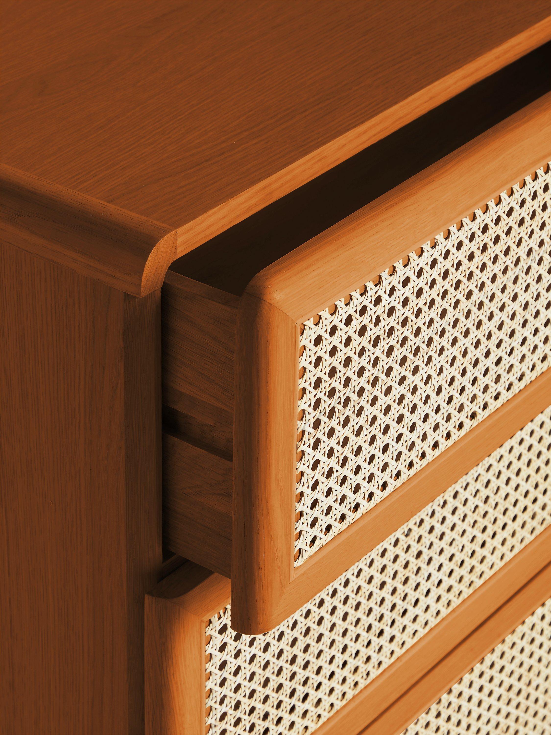 So rattan is having a little revival and we're here for it. See how it breaks up the design and gives the drawers a fresh finish, not to mention the contrast it creates against the solid oak frame. We've made this chest from a combination of solid oak and MDF so it's built-to-last and its rounded edges and gently curved legs give it a softer shape. And with three spacious drawers, we don't think you'll struggle with storage space.