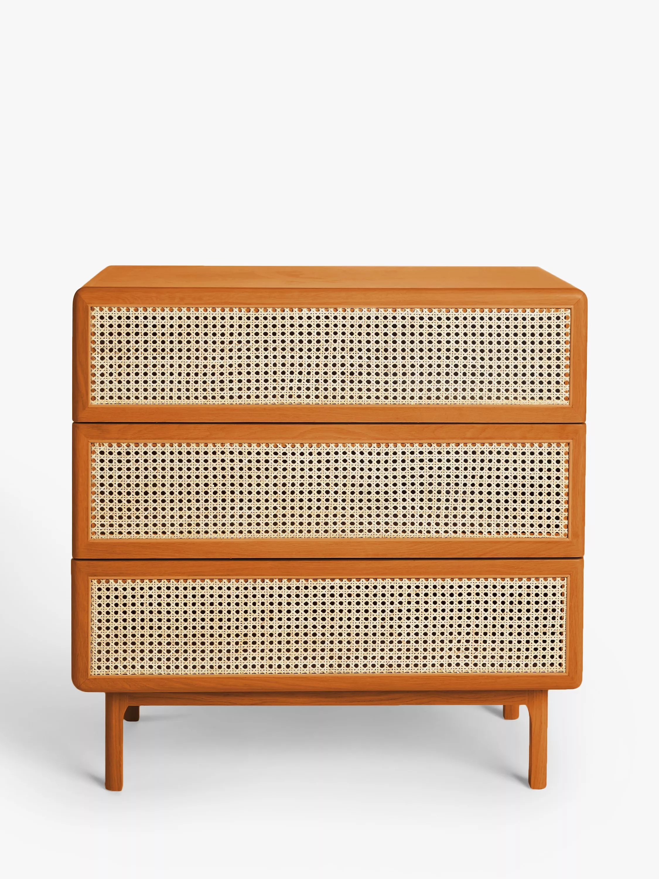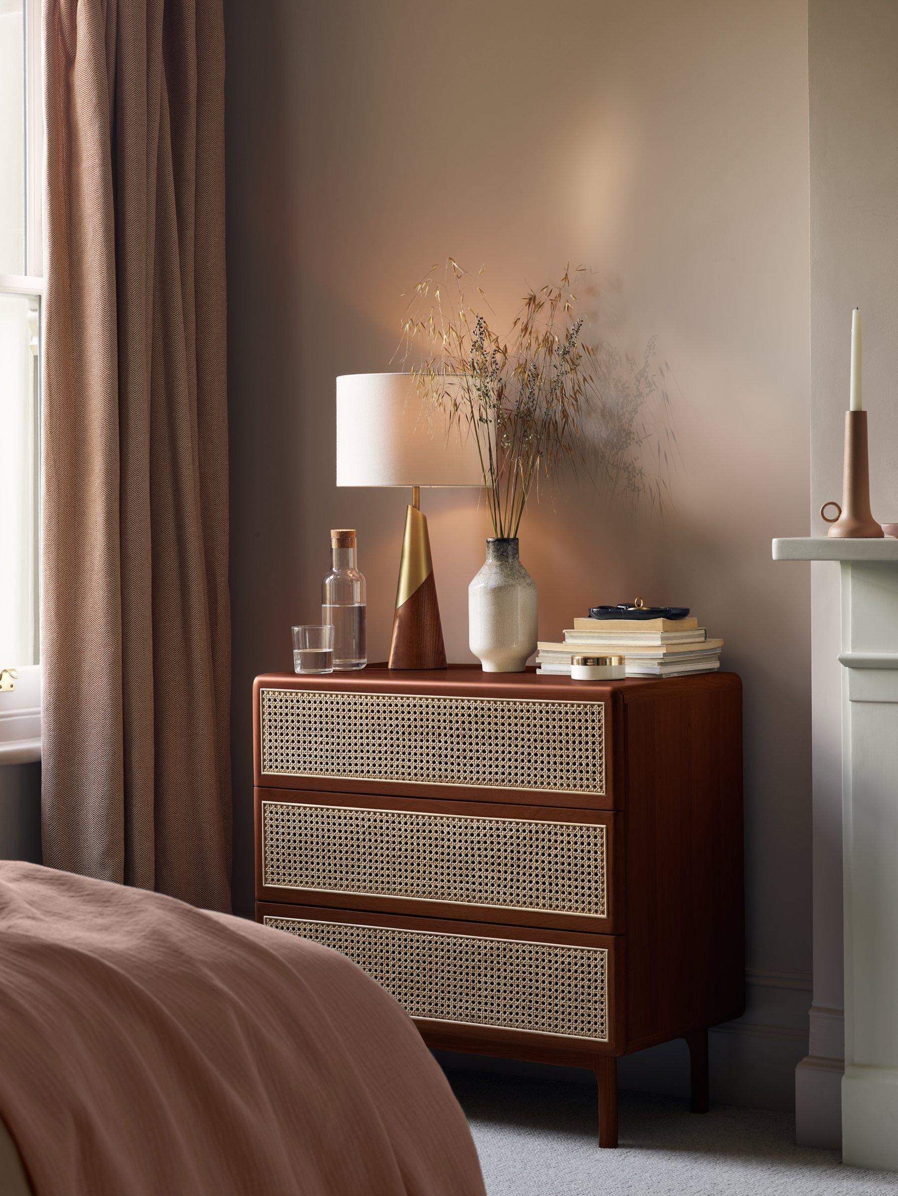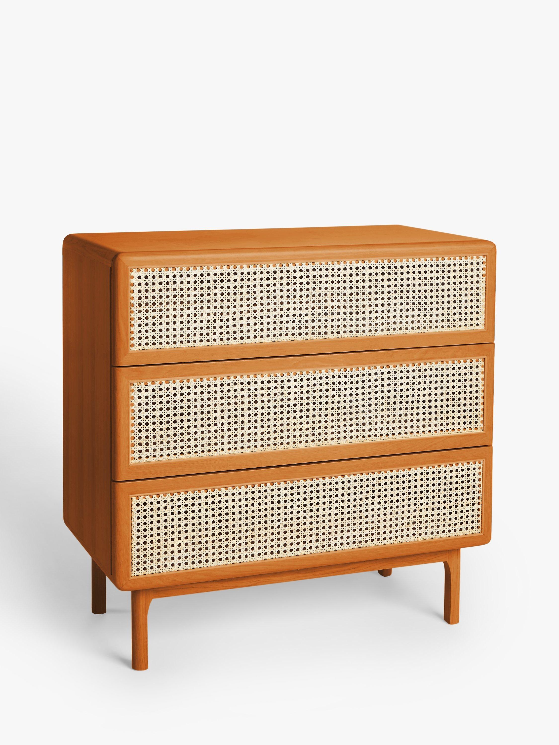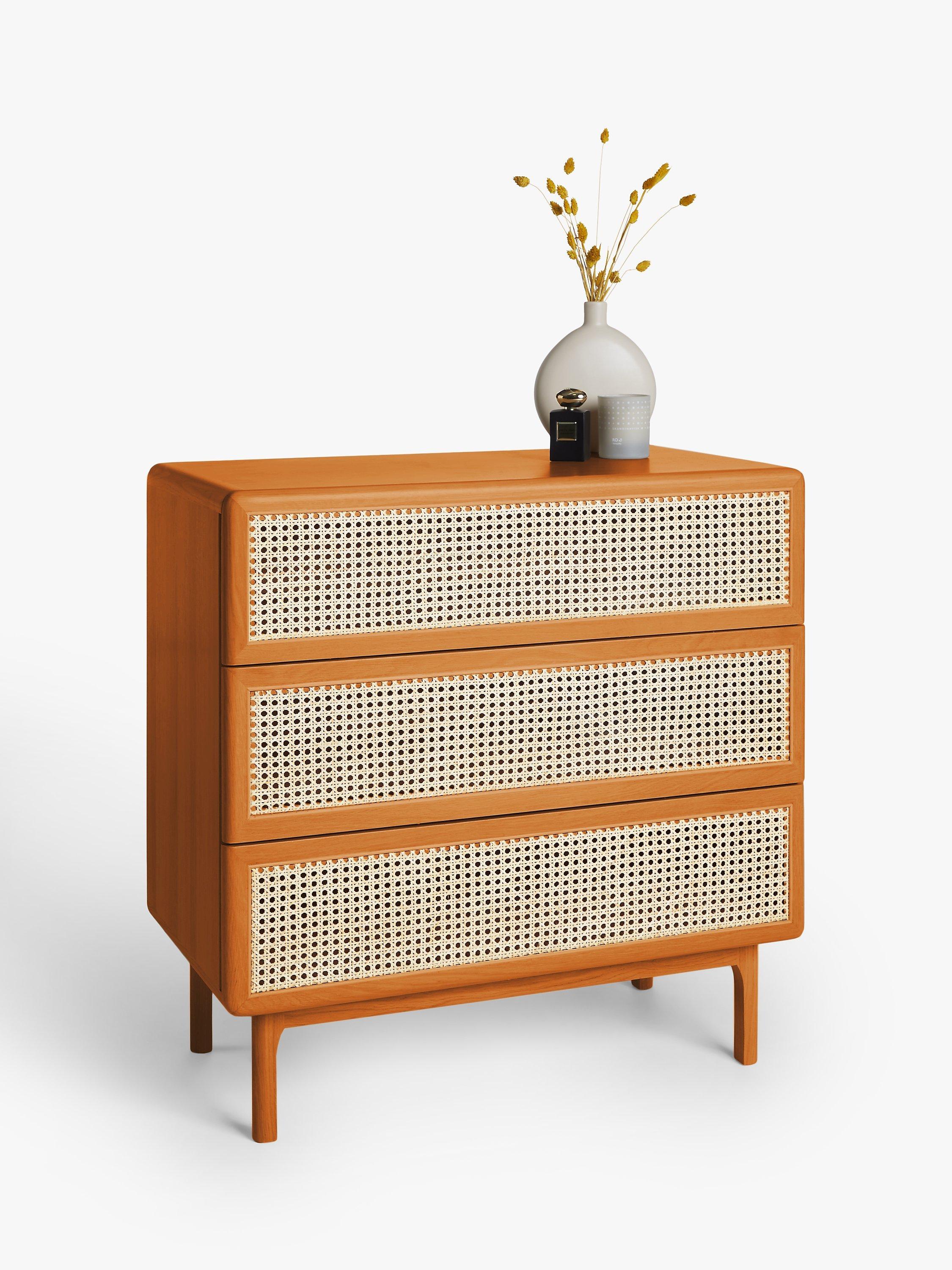 So rattan is having a little revival and we're here for it. See how it breaks up the design and gives the drawers a fresh finish, not to mention the contrast it creates against the solid oak frame. We've made this chest from a combination of solid oak and MDF so it's built-to-last and its rounded edges and gently curved legs give it a softer shape. And with three spacious drawers, we don't think you'll struggle with storage space.