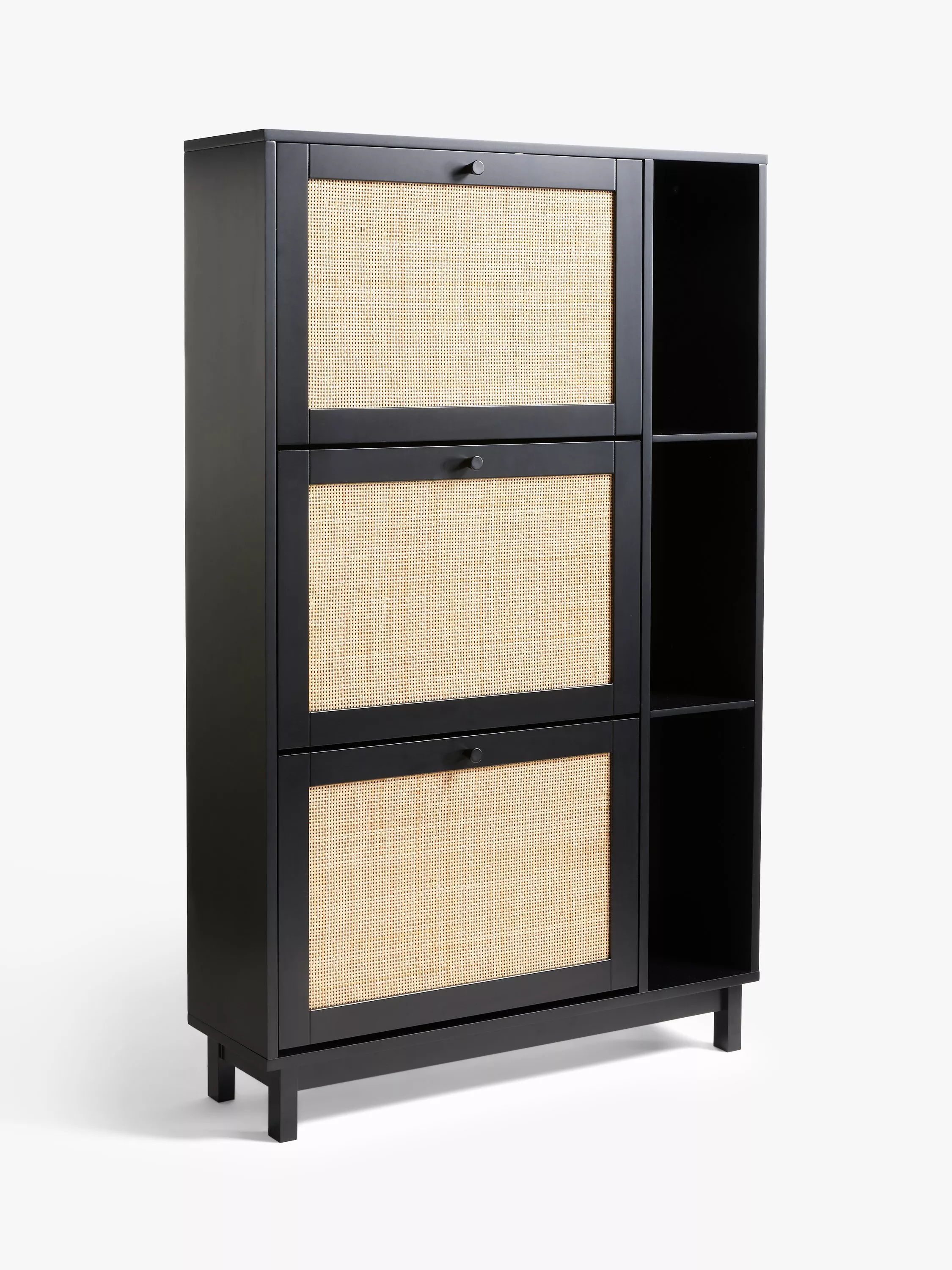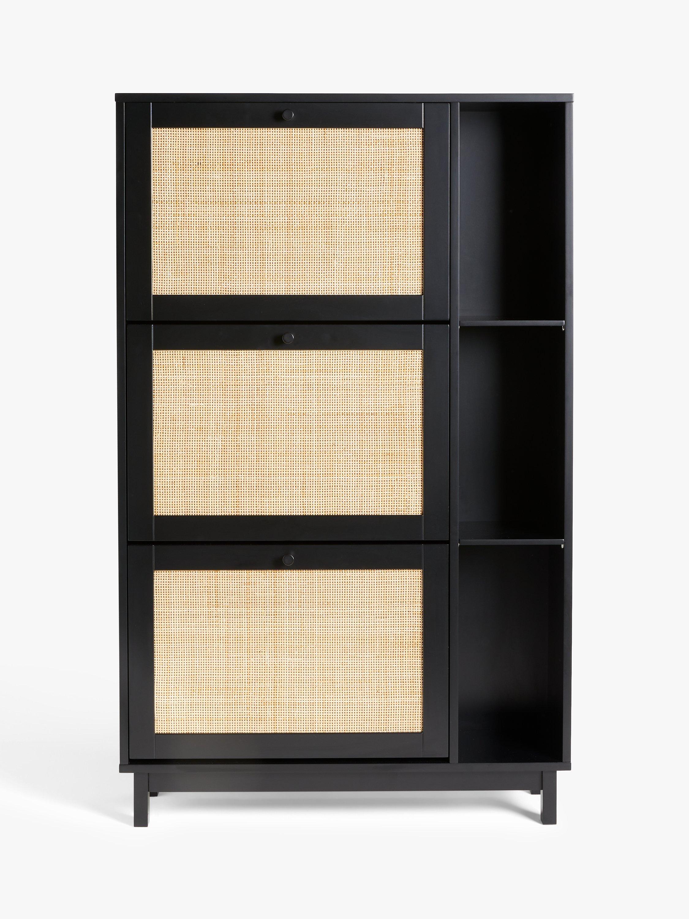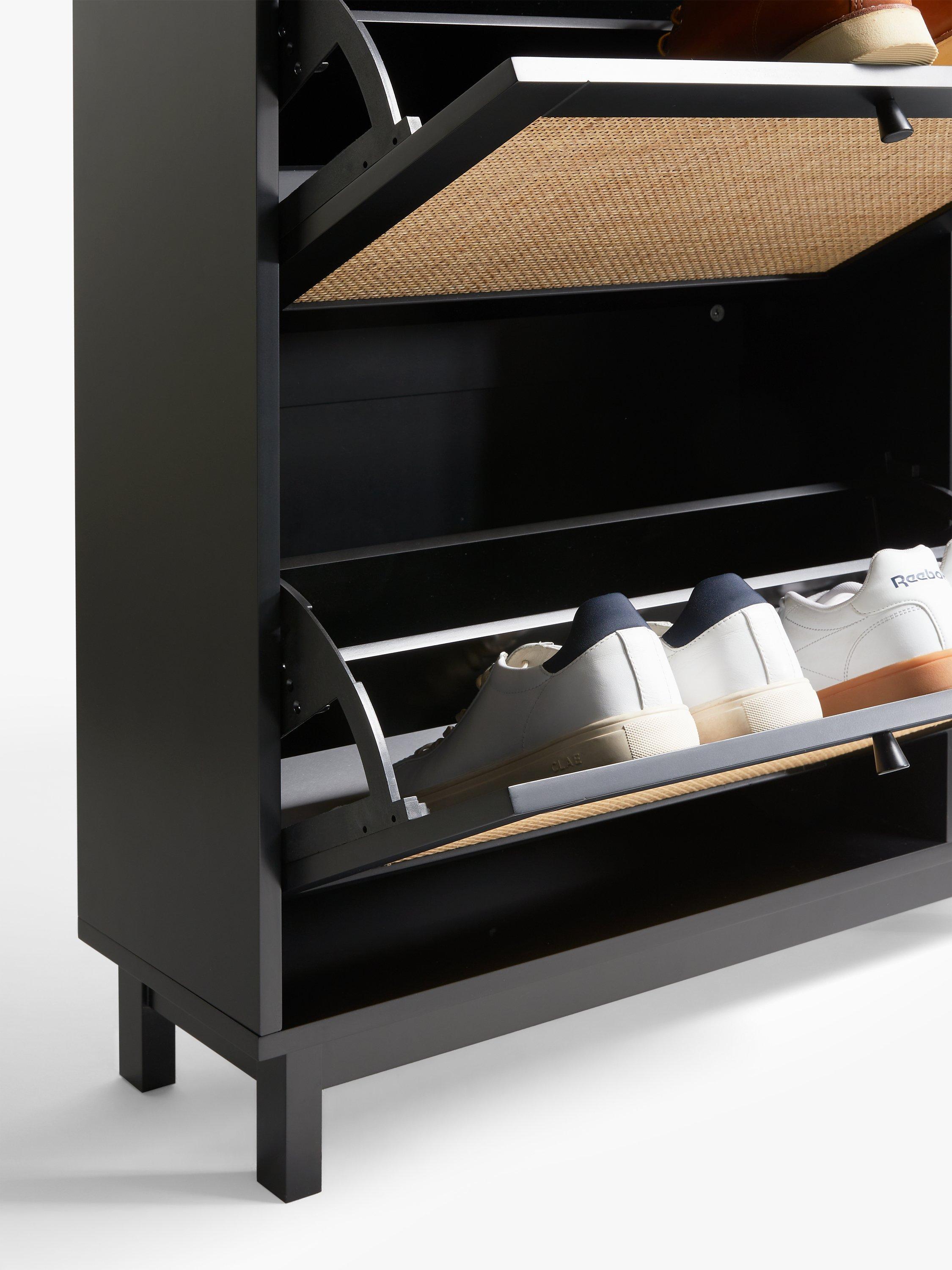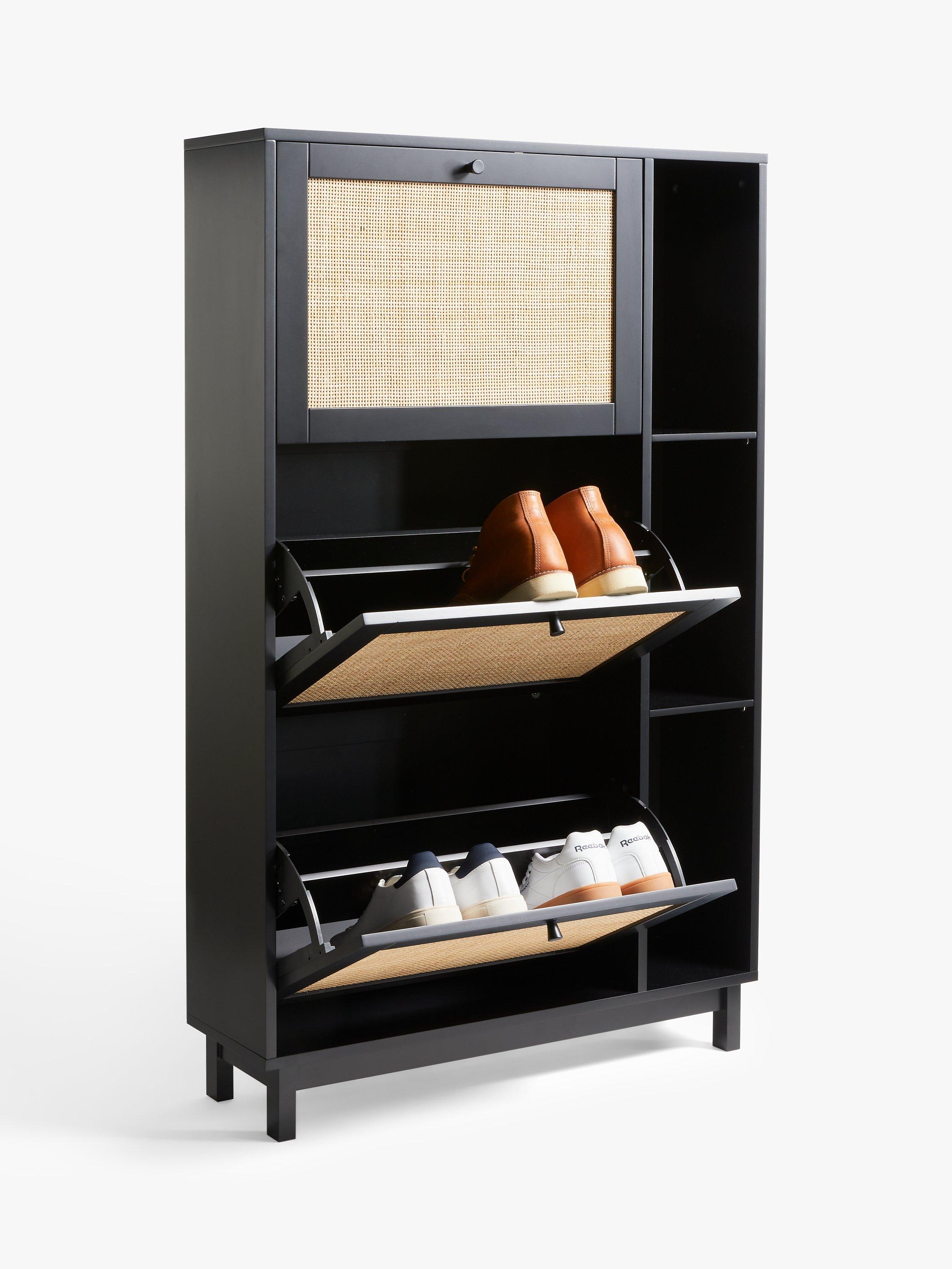 This space-saving shoe rack holds up to 6 pairs of shoes on its rotatable shelves and features real rattan facings for an attractive, natural look.