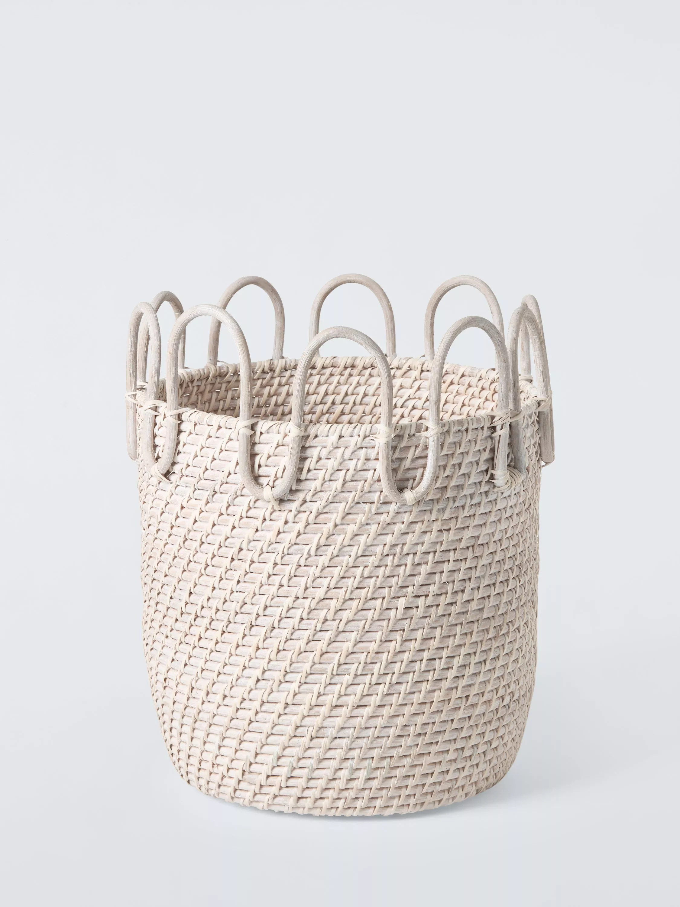 The wavy rope decoration around the lid of this rattan basket doubles as carrying handles.