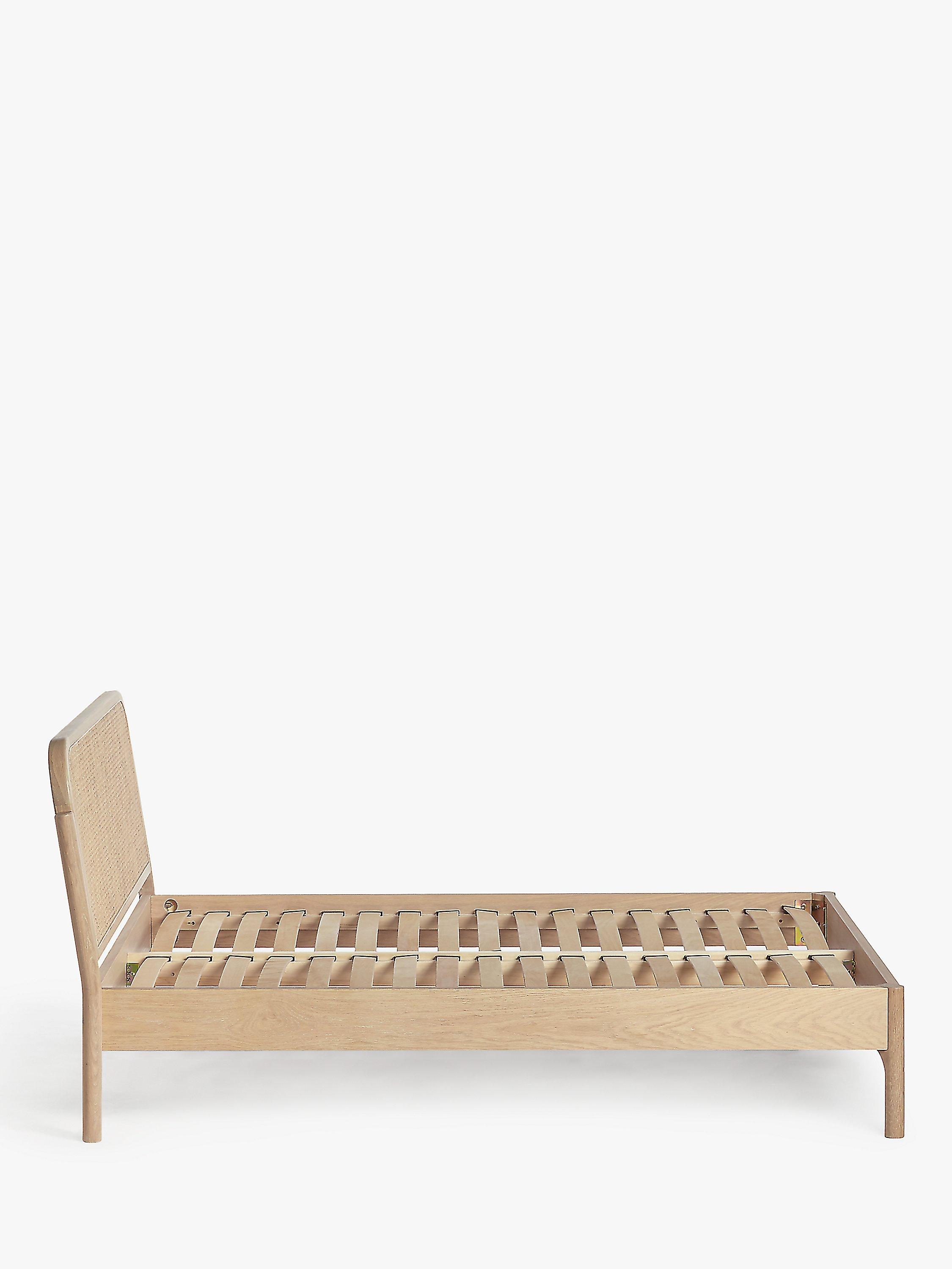 A distinctive design with vintage appeal, our Rattan bed frame is the centrepiece for your traditional, farmhouse-inspired bedroom. Made predominantly from solid European white oak with a touch of robust MDF, its airy, curved cane headboard offers a contrast against the solid, smooth lines of the frame. The Oak version is finished in a matt lacquer for durability, while the Black version has a striking painted finish. An understated, yet sophisticated design, its solid slats provide a firmer base for your mattress.