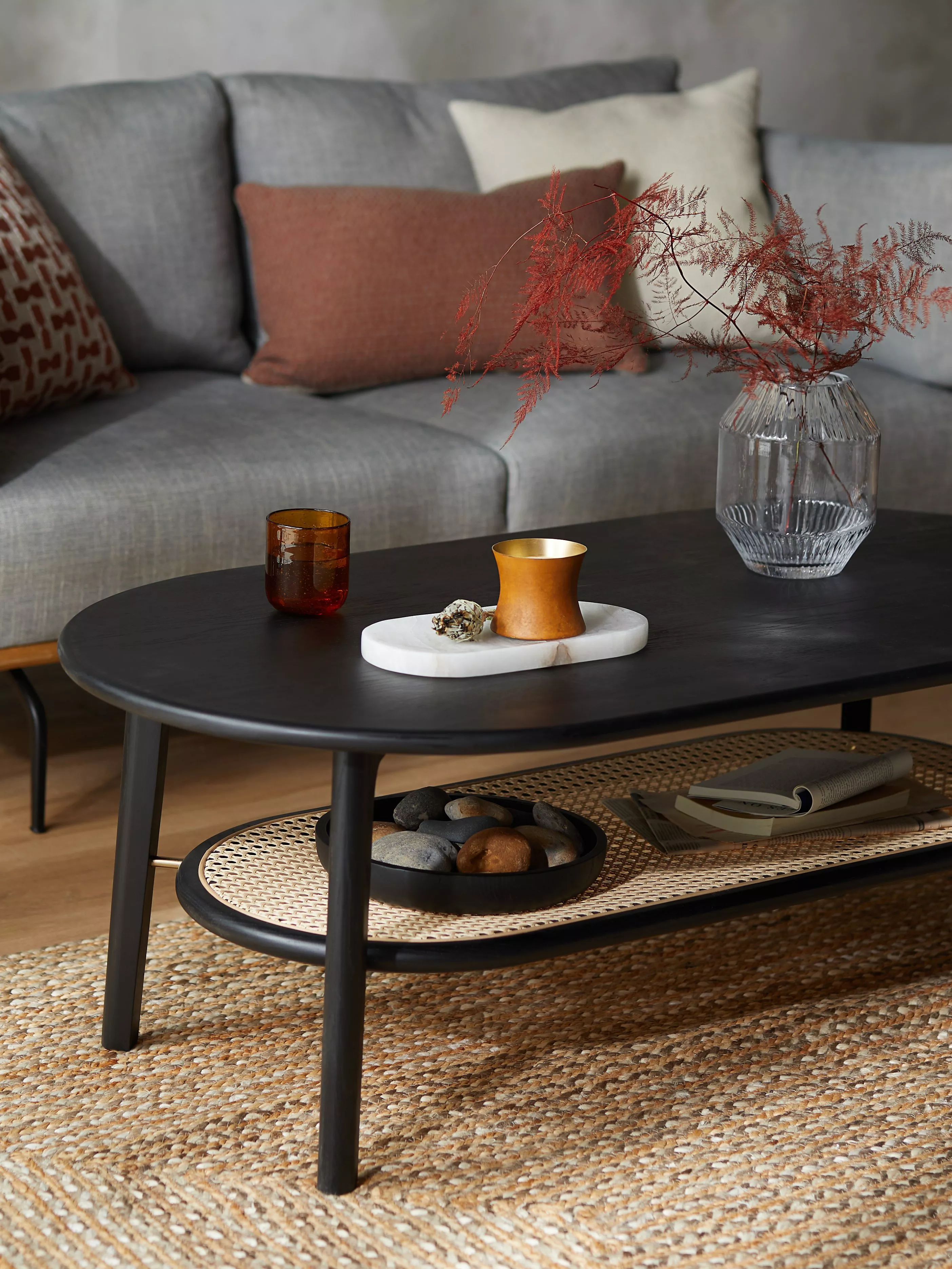 The soft, sculptural form of this oval coffee table will help to transform your living room into a space that feels contemporary, yet calm. It's made from solid oak with MDF for support, and the addition of a low shelf made from natural rattan gives the design a warm, tactile and airy finish. We love its curved shape and painted finish which will make it a statement in the centre of your space, and it's coated in a protective lacquer for durability. Perfect for achieving a Scandi-style aesthetic at home.