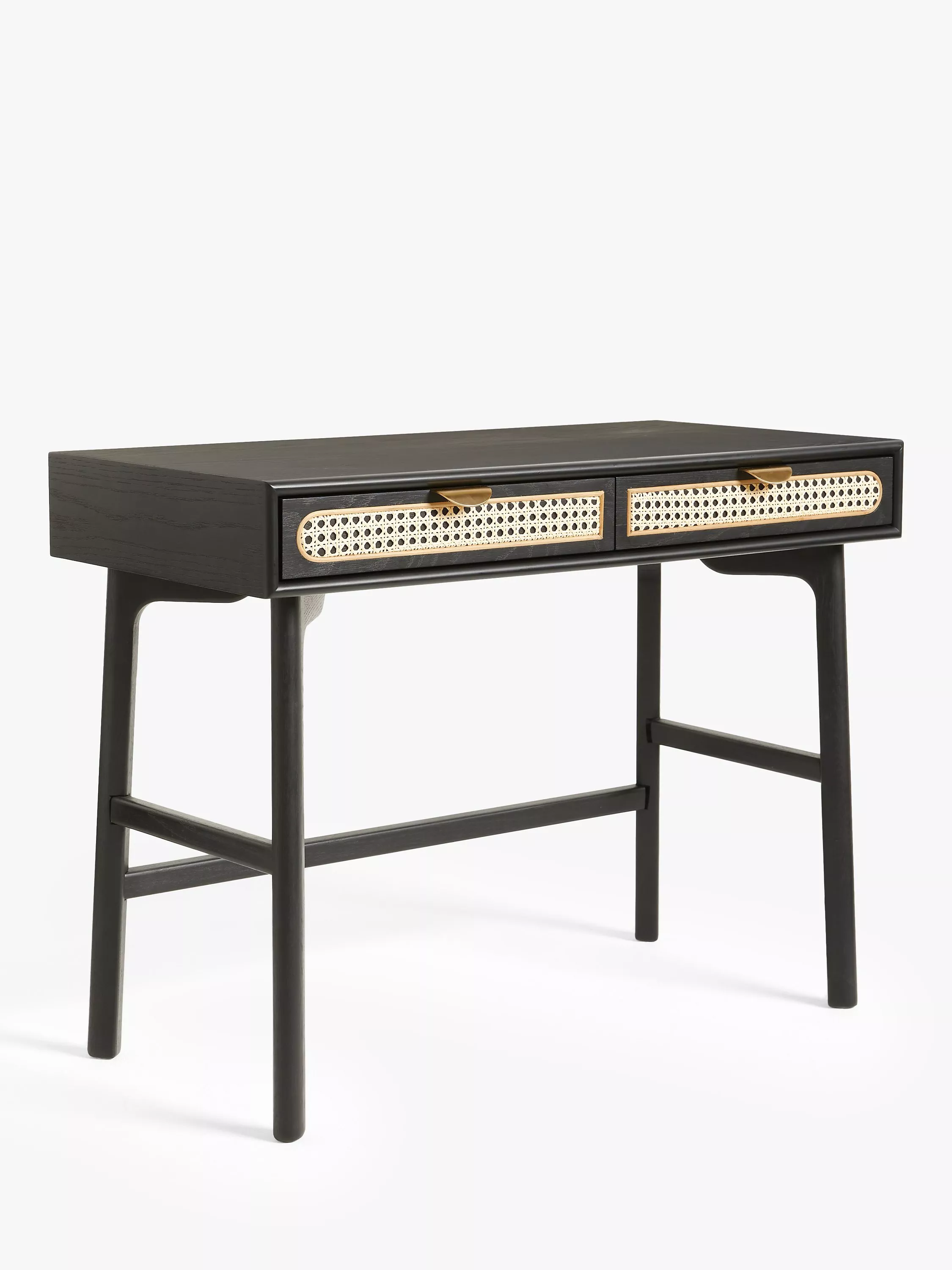 Solid oak and natural cane form this desk, which offers a Nordic-inspired approach to functional furniture. The smooth, round edges and wooden frame help to create a softer look in your space. The grid weave on the front of the two drawers adds a contemporary update to rattan — once the darling of '60s and '70s interior design and a high durability, low maintenance material.