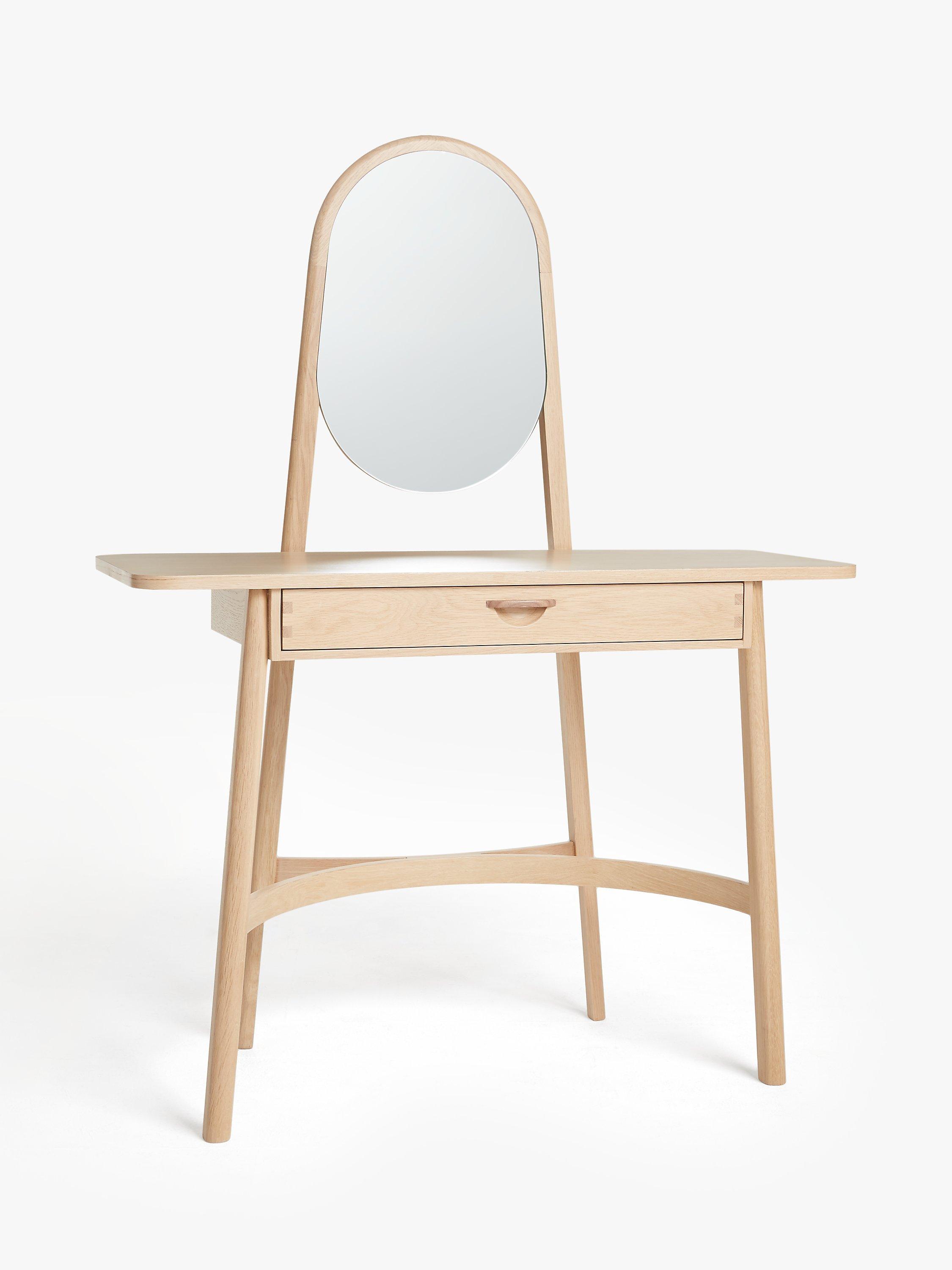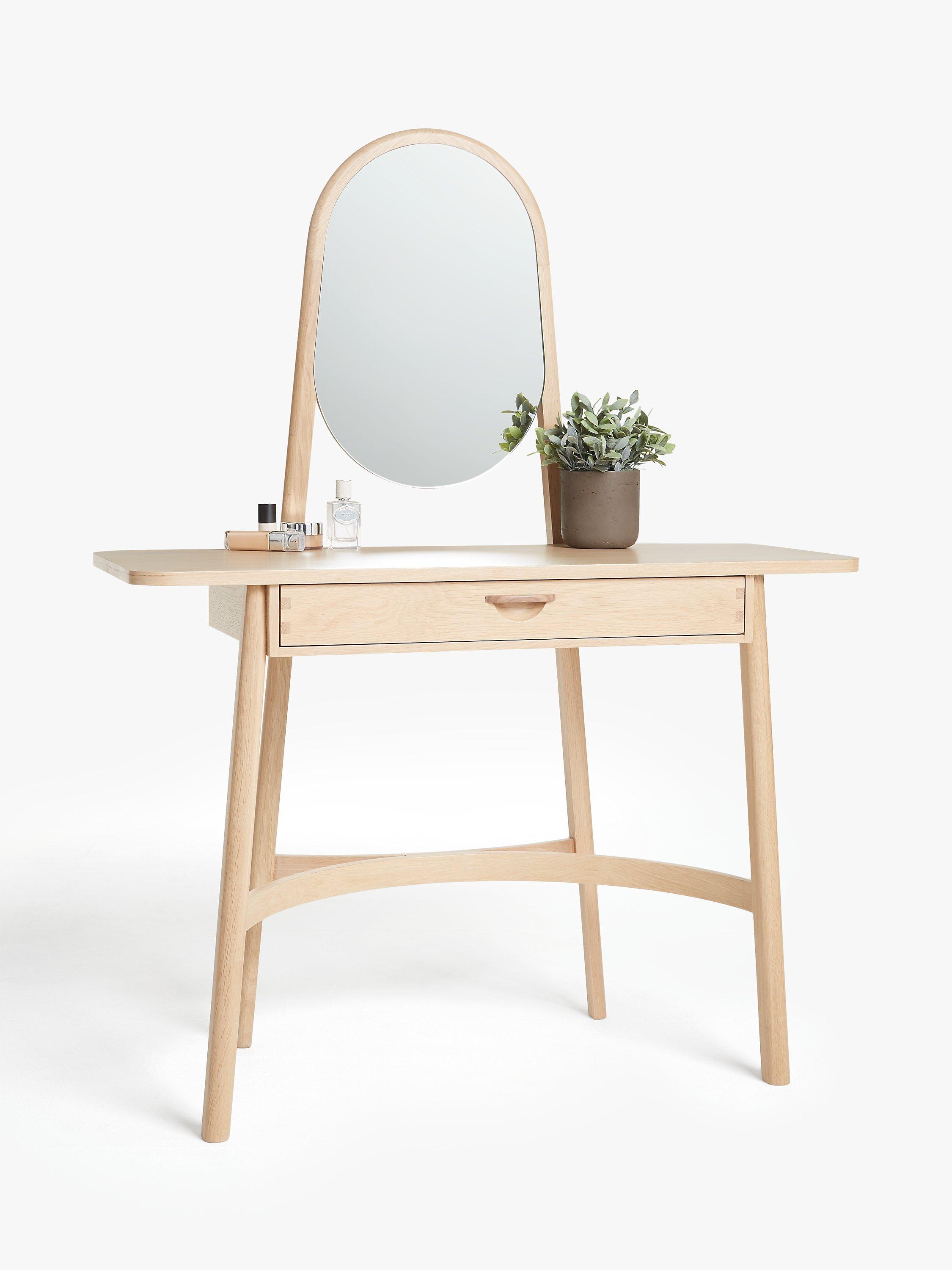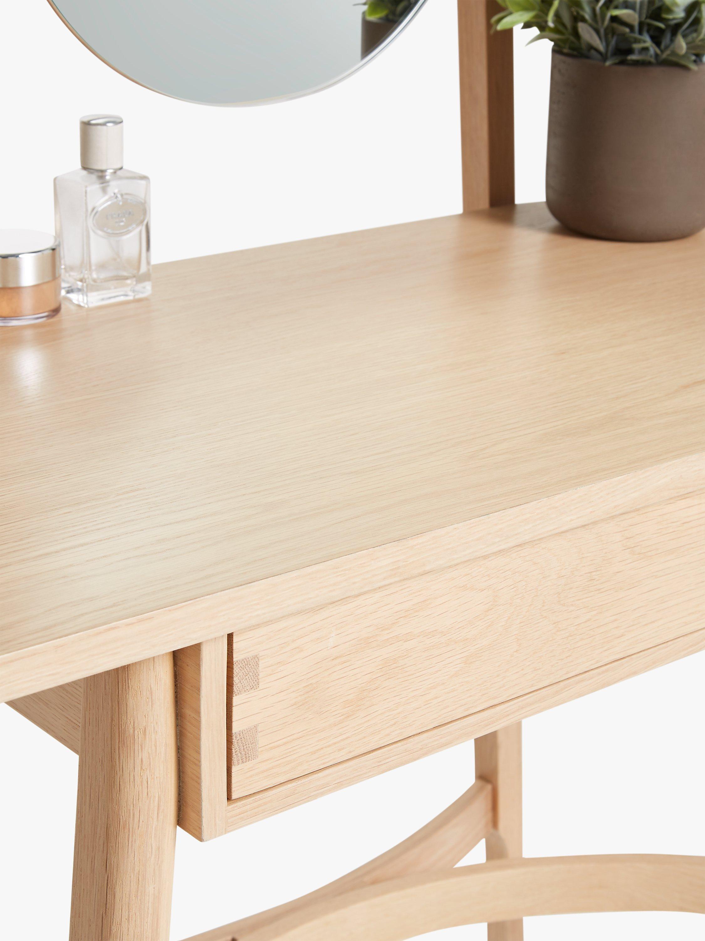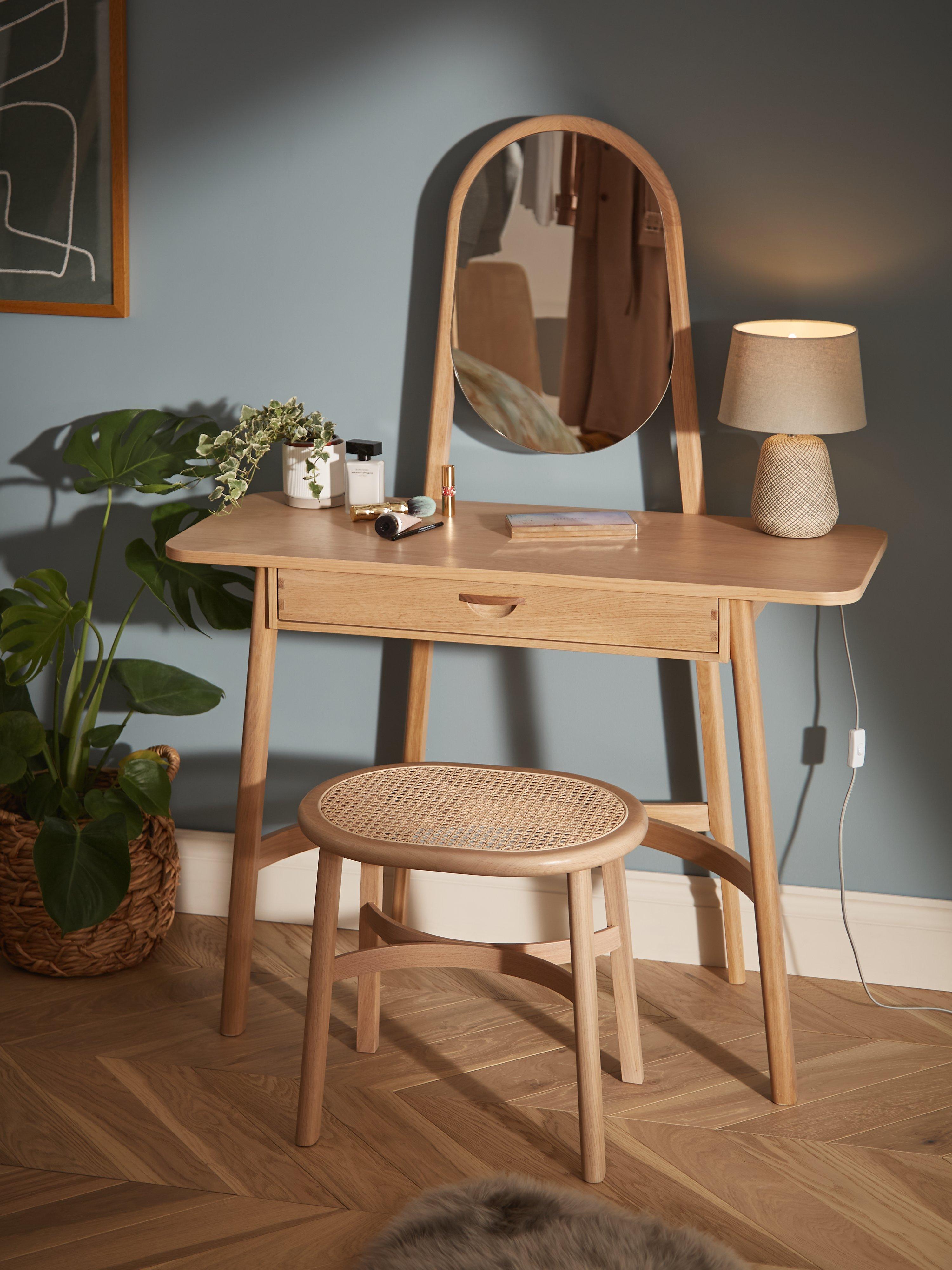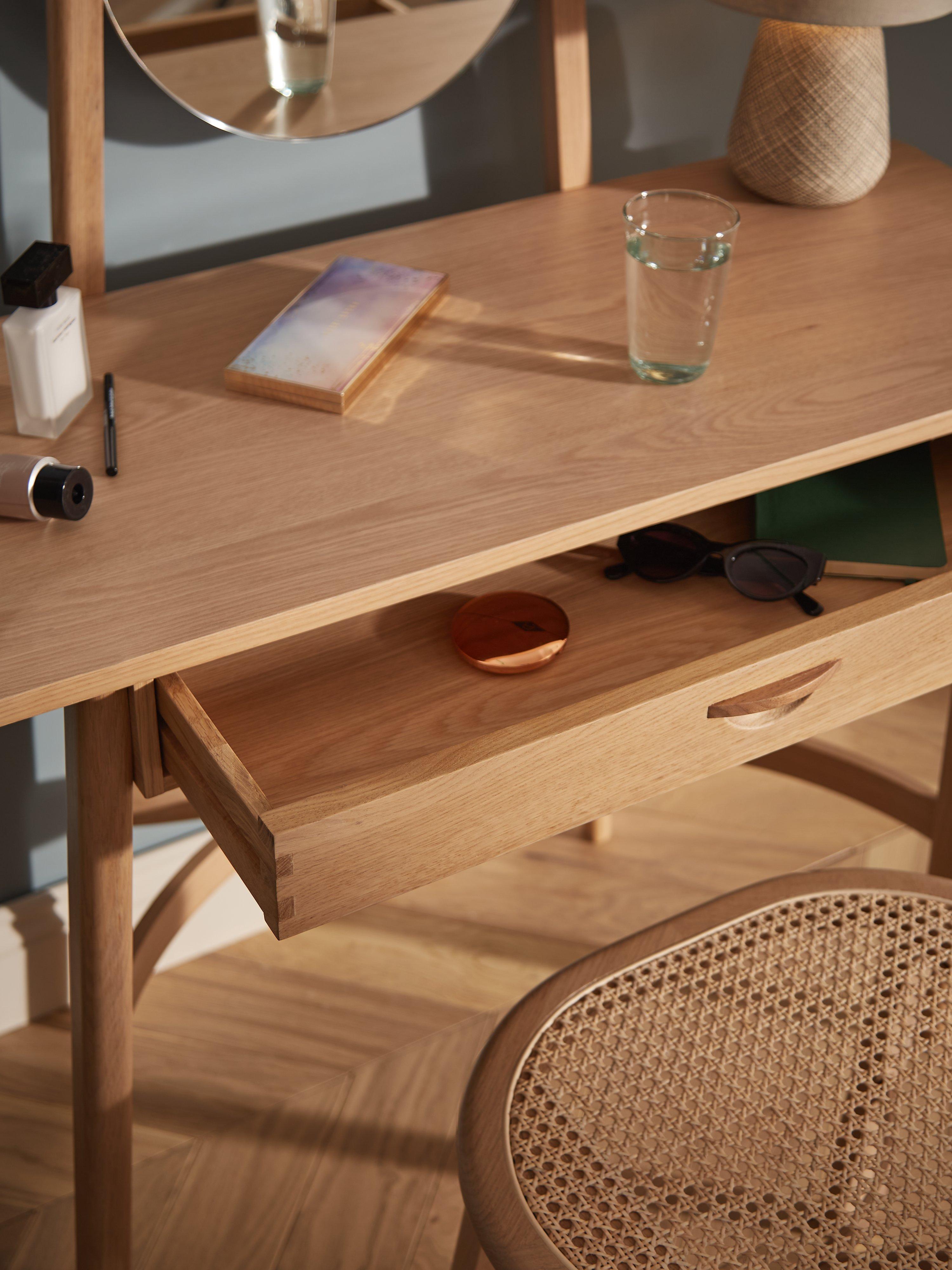 Our Rattan range of bedroom furniture is ideal for farmhouse-inspired interiors, thanks to a solid oak and veneer construction that showcases steam-bent wood and dovetail joint details. This practical dressing table and mirror features one storage drawer and and has a natural or painted finish that highlights the real wood grain. With curved edges and rounded legs that lend a softer design focus, it's a timeless and space-saving option for your bedroom.
