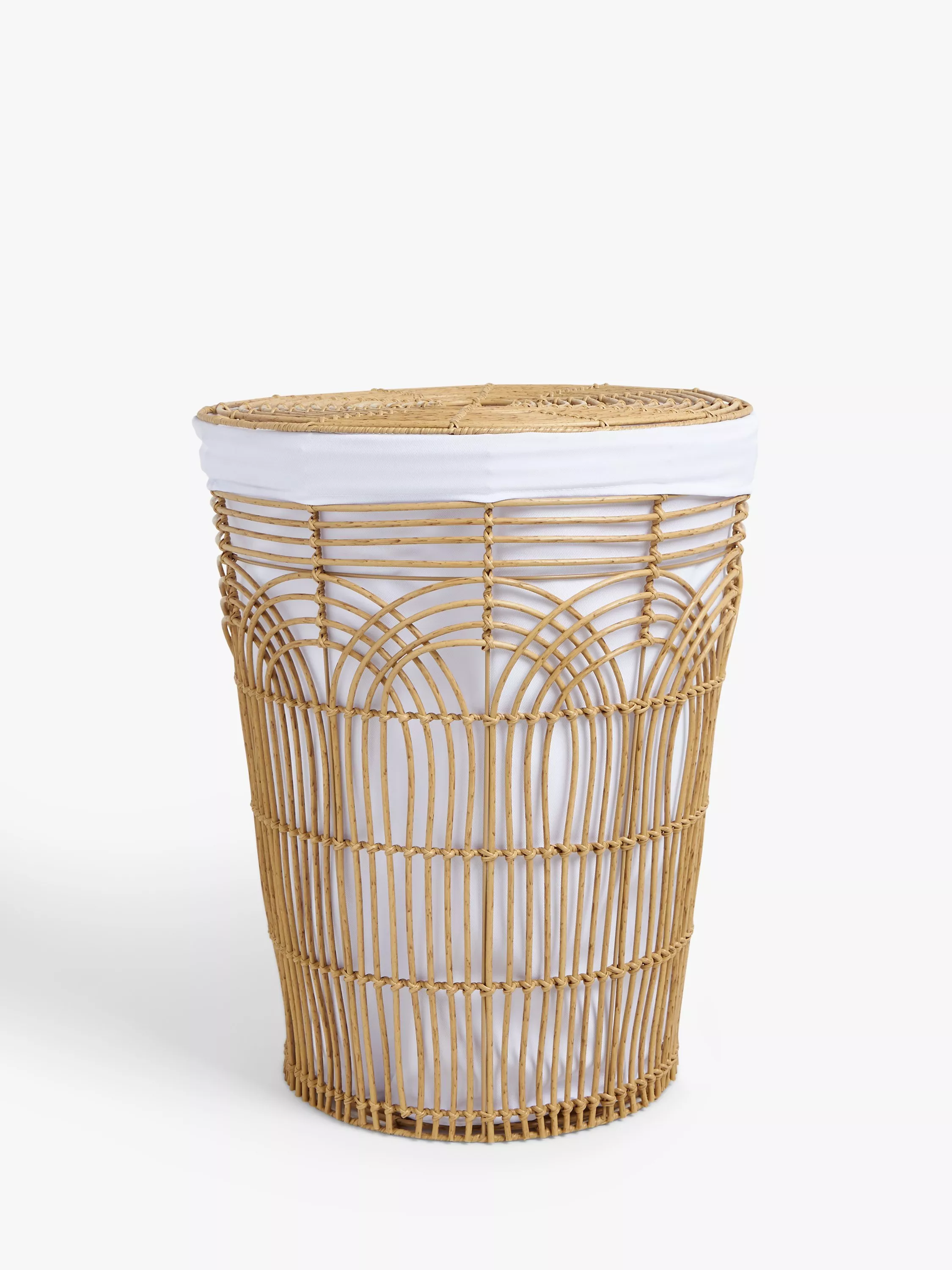 Decorative rattan laundry basket with hand-woven details and an open wicker design to increase airflow, preventing any musty odours if you leave it an extra day or two before laundering. Comes with a lid and a removable fabric liner to make transporting dirty washing easy.