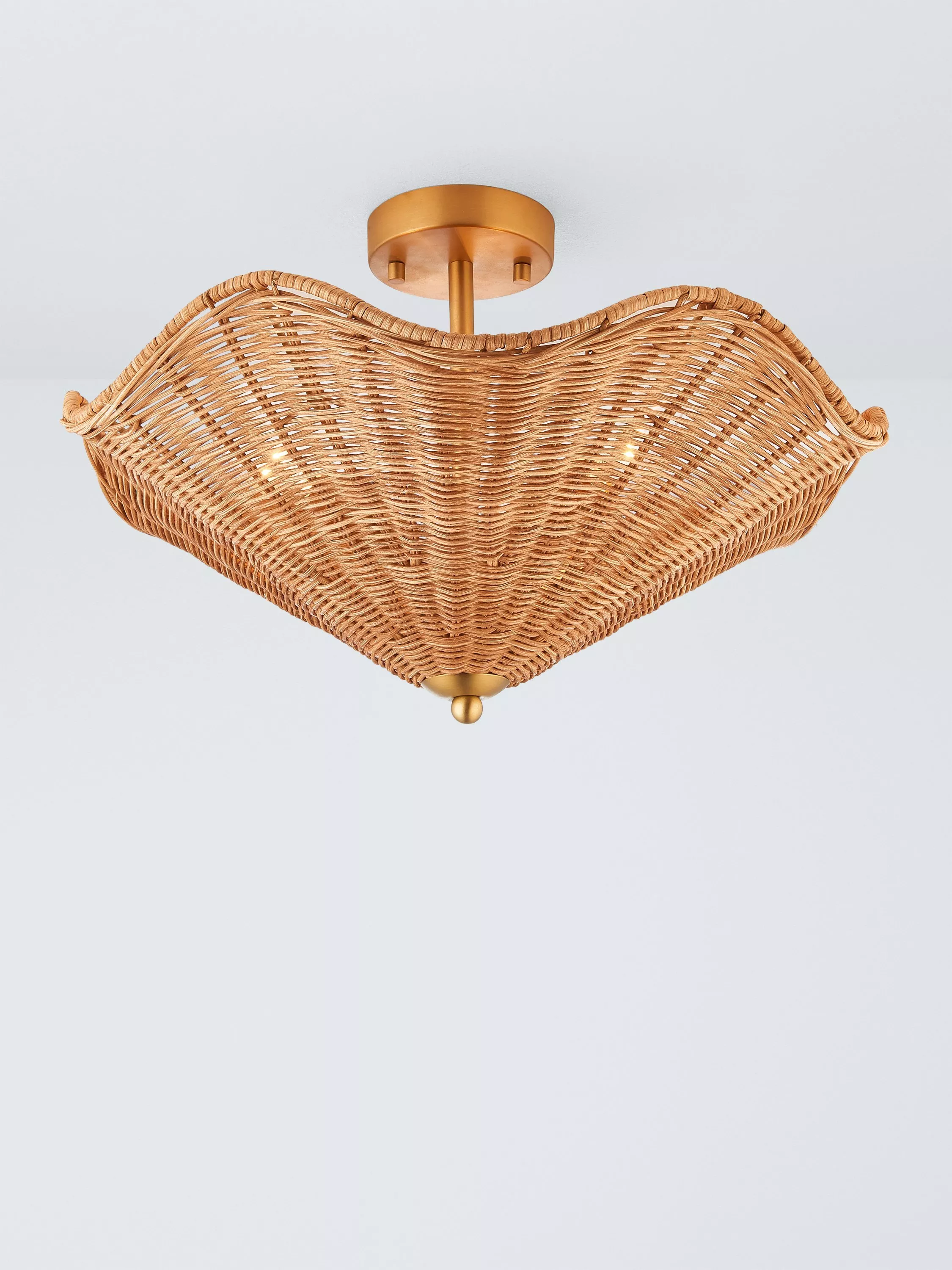 Delicate and beautifully rippled, the Rattan Scallop semi-flush ceiling light blends warm, natural woven rattan with elegant brass metalwork accents. Perfectly balancing modern and classic styles, it brings a cosy, timeless charm to bedrooms and dining spaces alike. The semi-flush design is particularly suitable for spaces with lower ceilings.