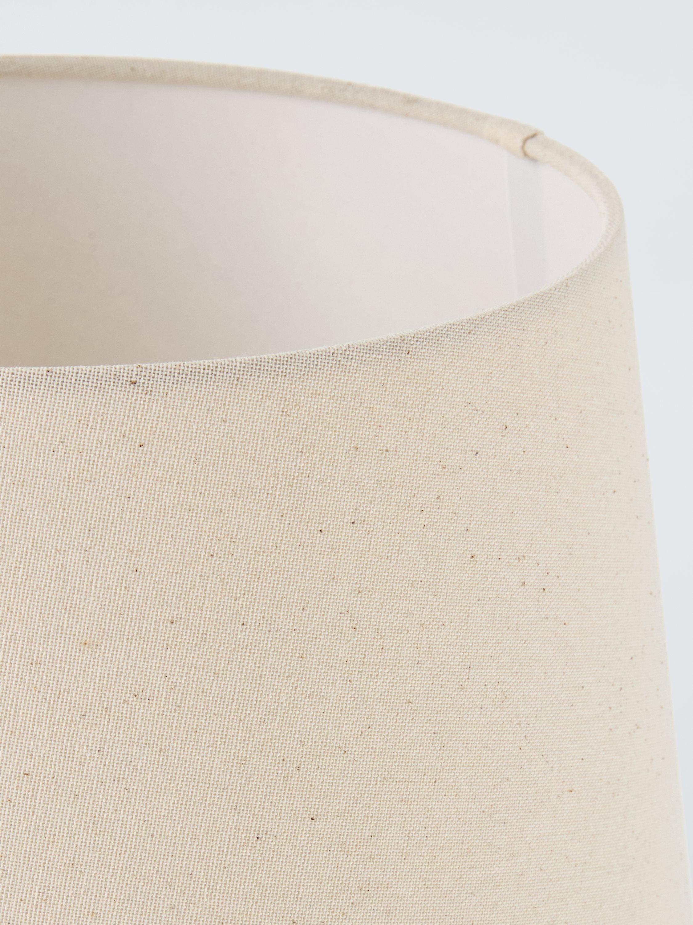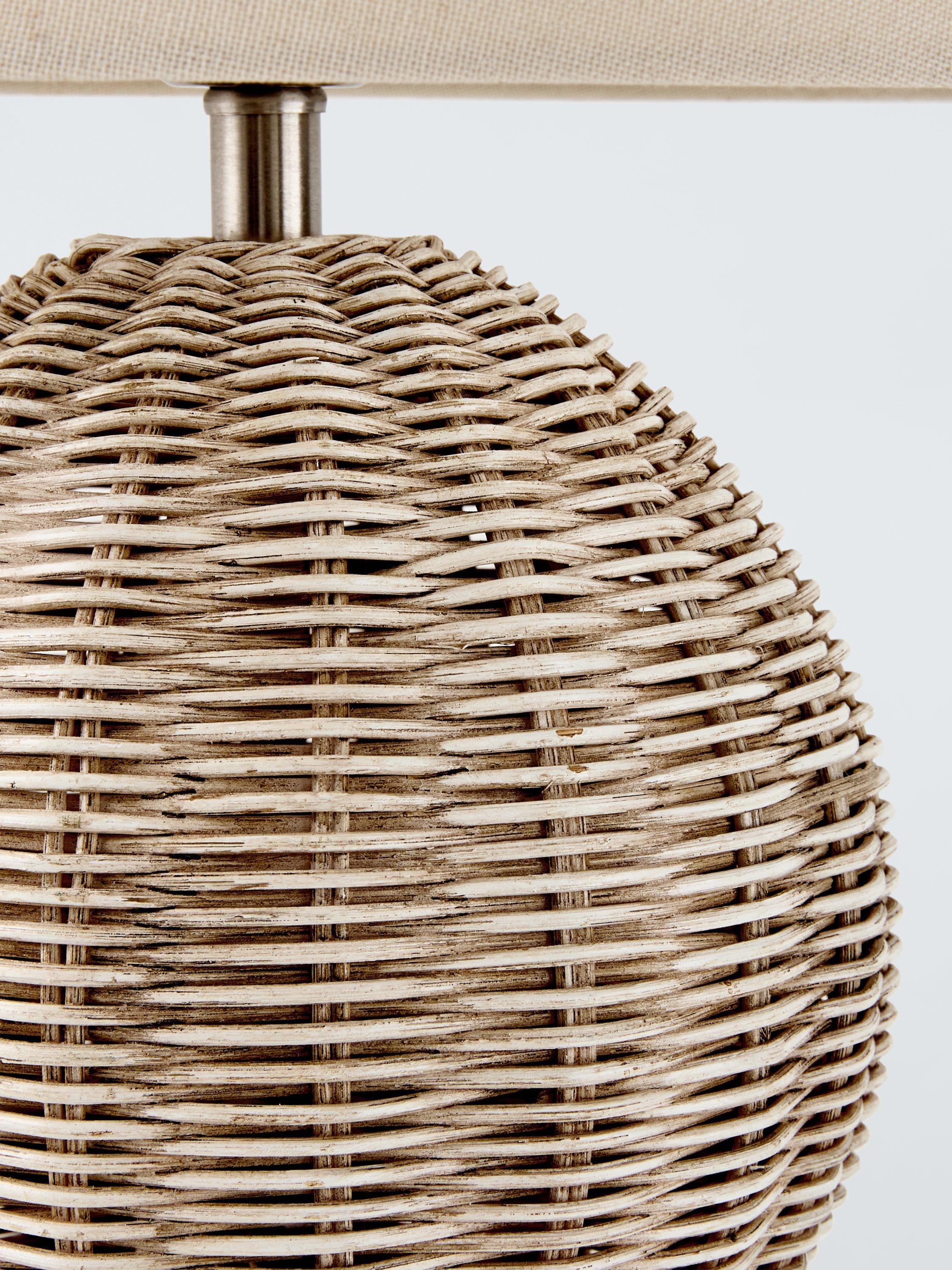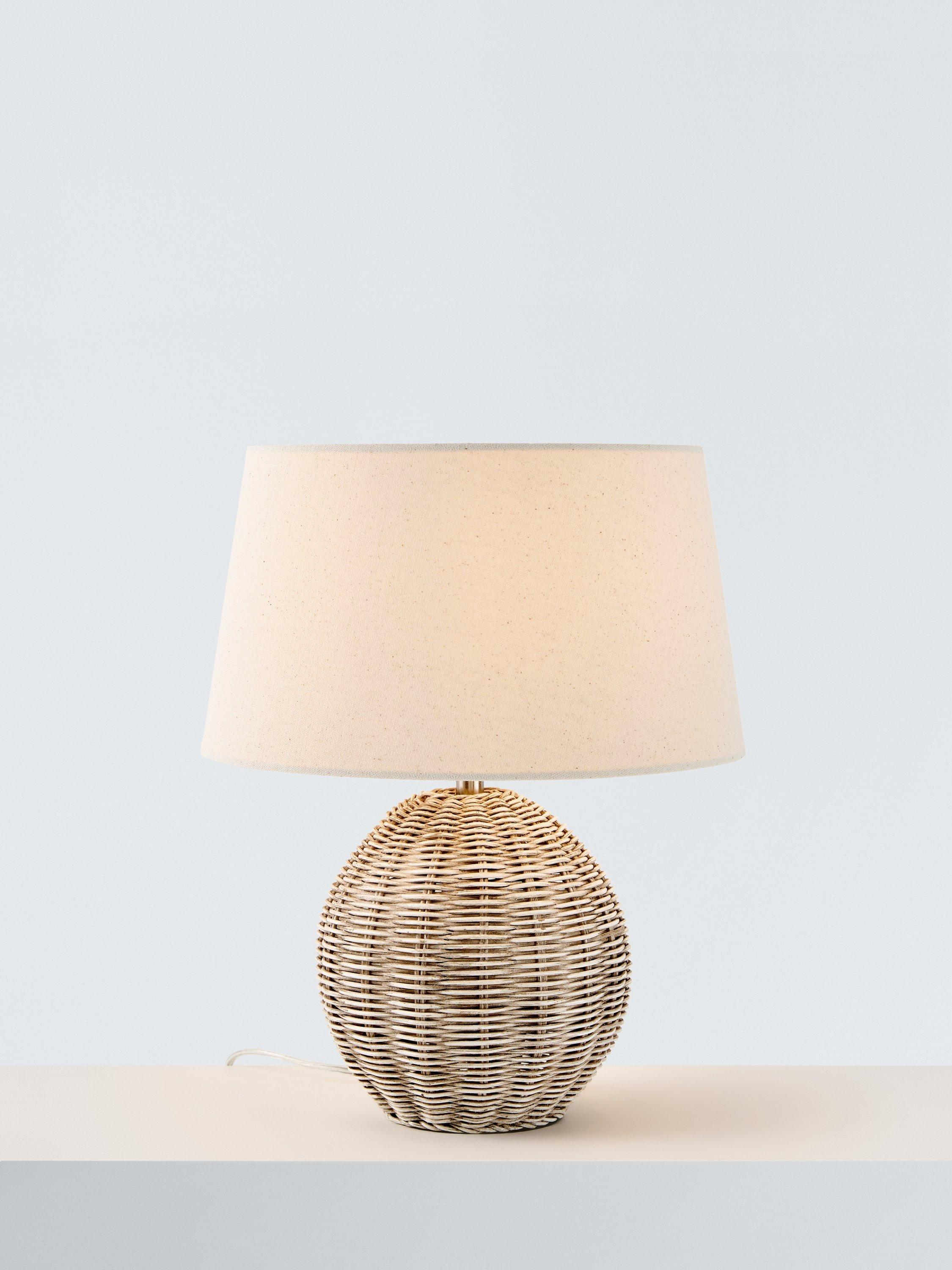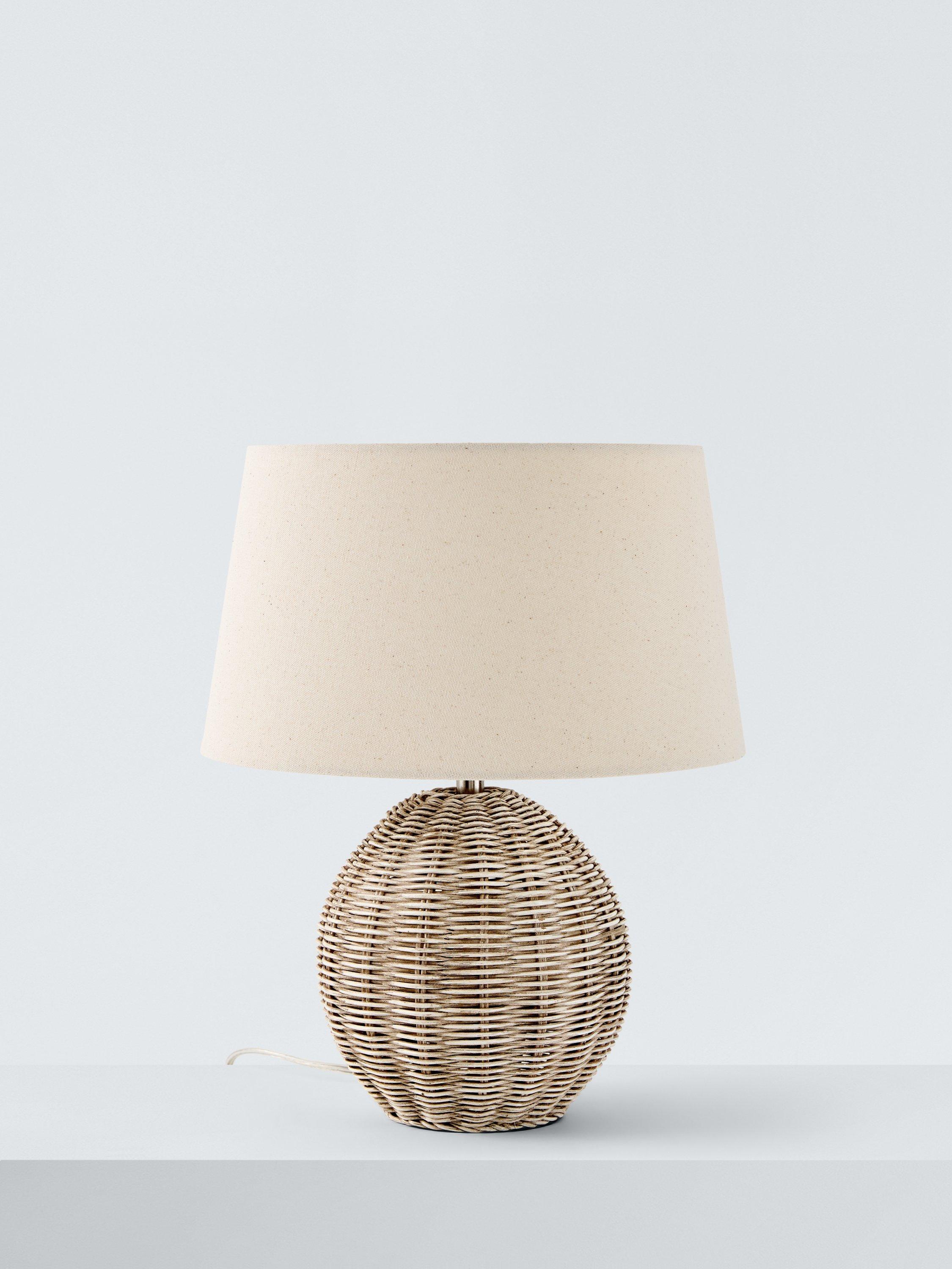 The natural texture and tone of rattan really come into play with this table lamp. The rounded shape shows off the woven design to its fullest. Complemented with a large fabric lampshade in a neutral tone.