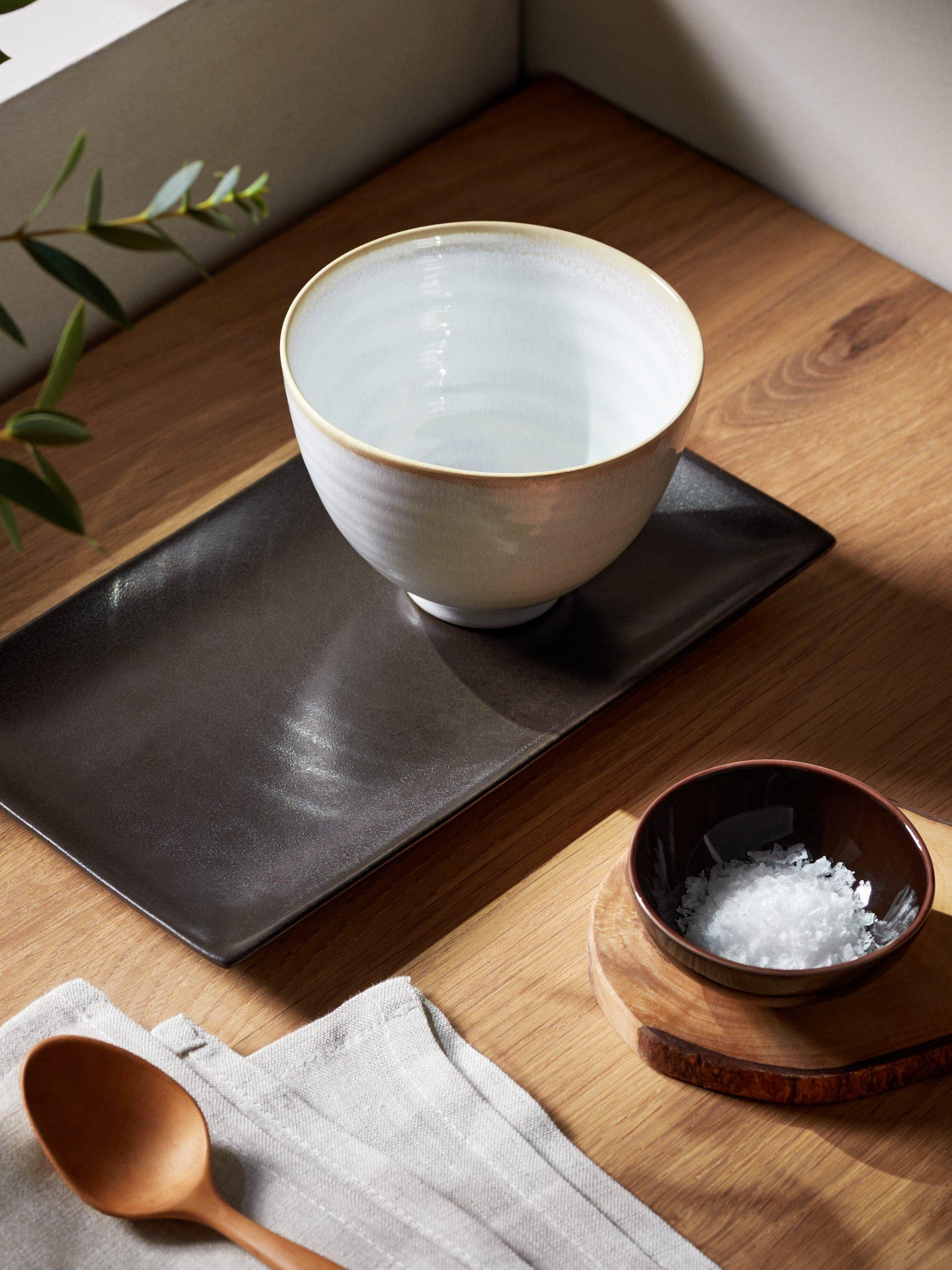 Inspired by Japanese ceramics, this rectangular serving platter has a dark reactive glaze. Made of stoneware, it's dishwasher and microwave safe for easy everyday use.
