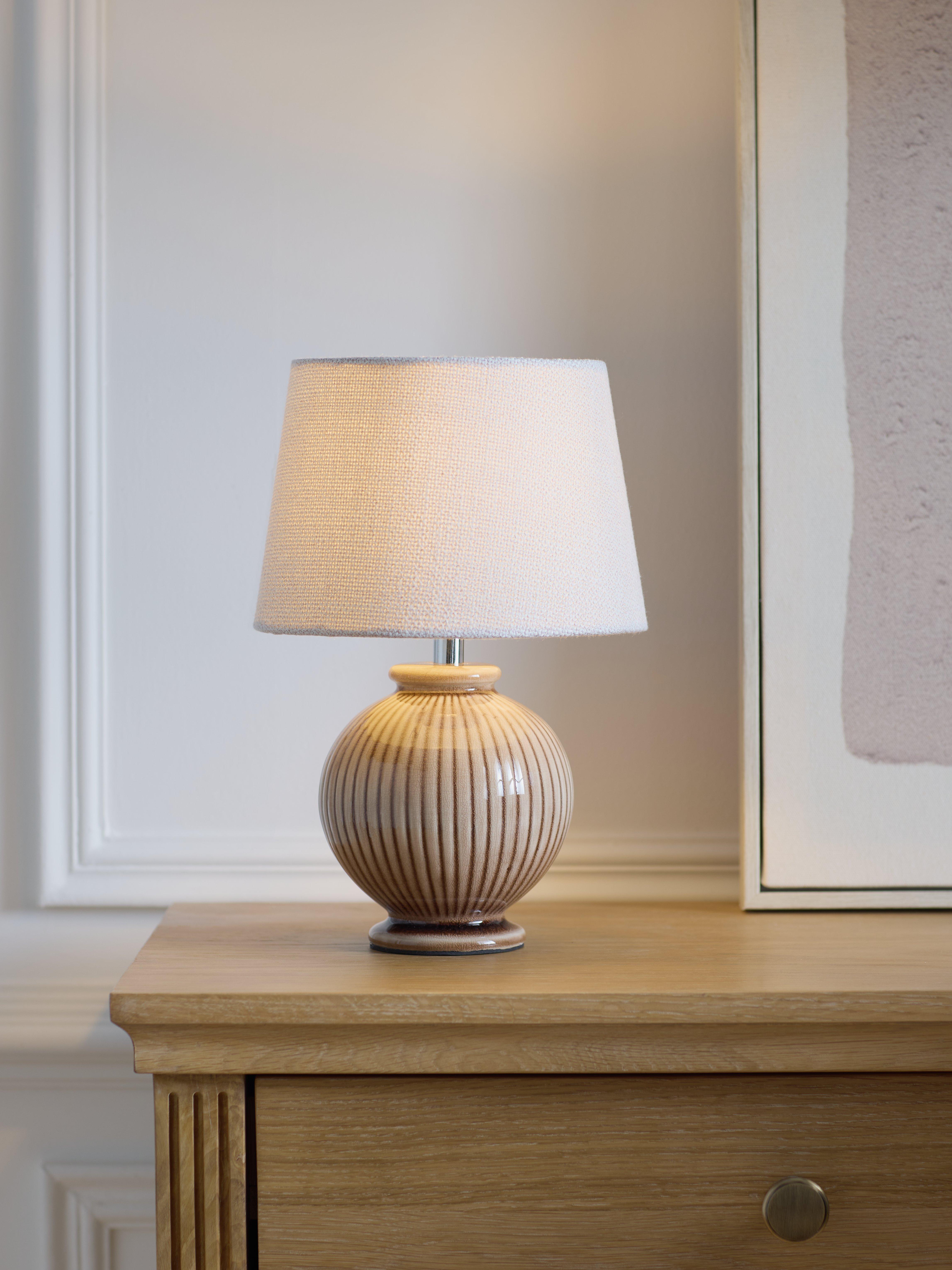 A timeless ceramic table lamp in a glossy coloured glaze. Shaded with a beautiful rolled edge lampshade made with a textural cotton mix which looks fantastic when the light is both on or off.