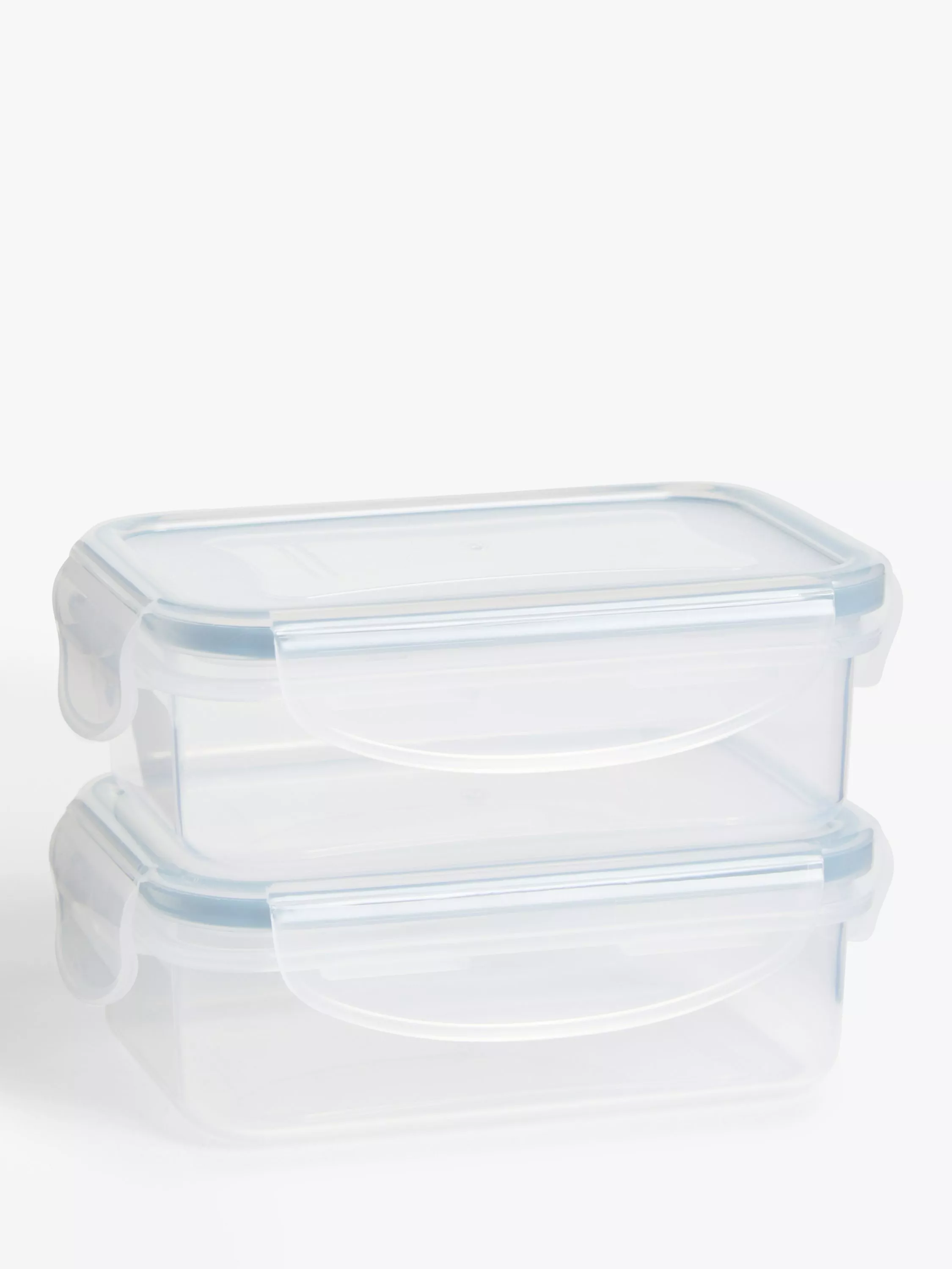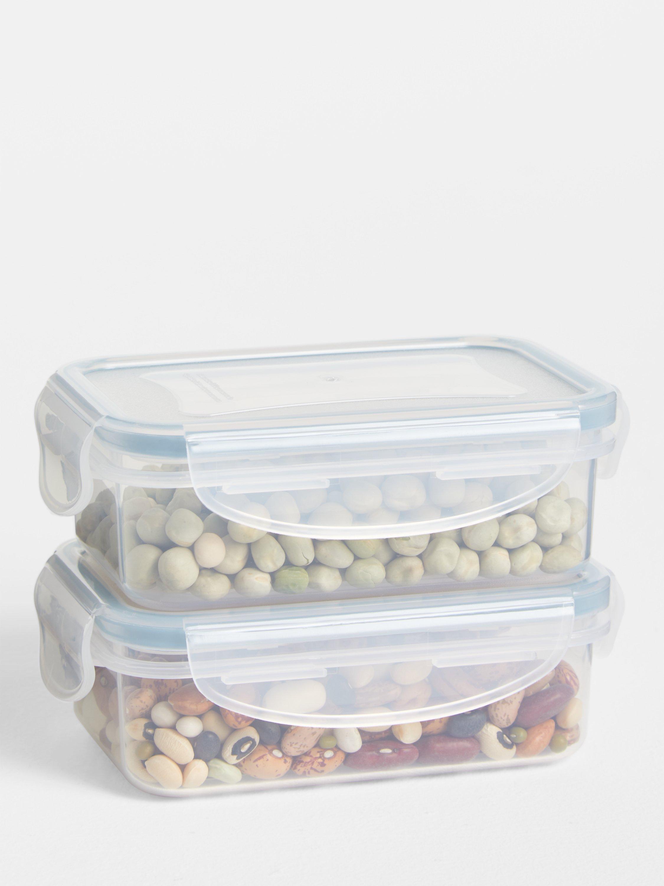 A of pair of rectangular plastic snack boxes with a clip-lock closure and airtight silicone seal to keep food fresh for longer.