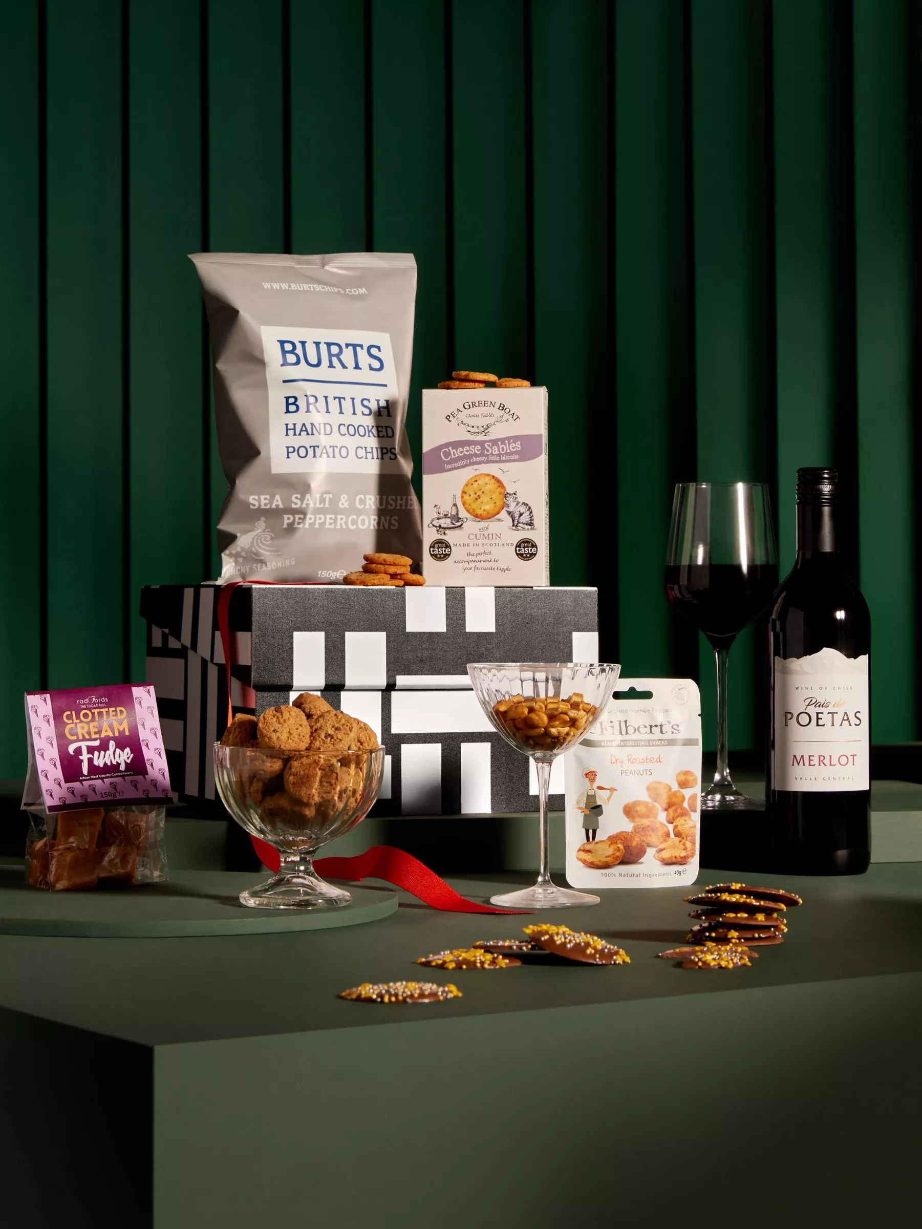 - Pea Green Boat Cheese Sables Cumin 80g Pais de Poetas Chilean Merlot 75cl Mr Filbert's Dry Roasted Peanuts 40g Linden Lady Milk Chocolate Buttons 100g Burts British Hand Cooked Potato Chips Sea Salt & Crushed Peppercorns 150g nibnibs Choc Chip Biscuits 150g Radfords Handmade West Country Clotted Cream Fudge 150g