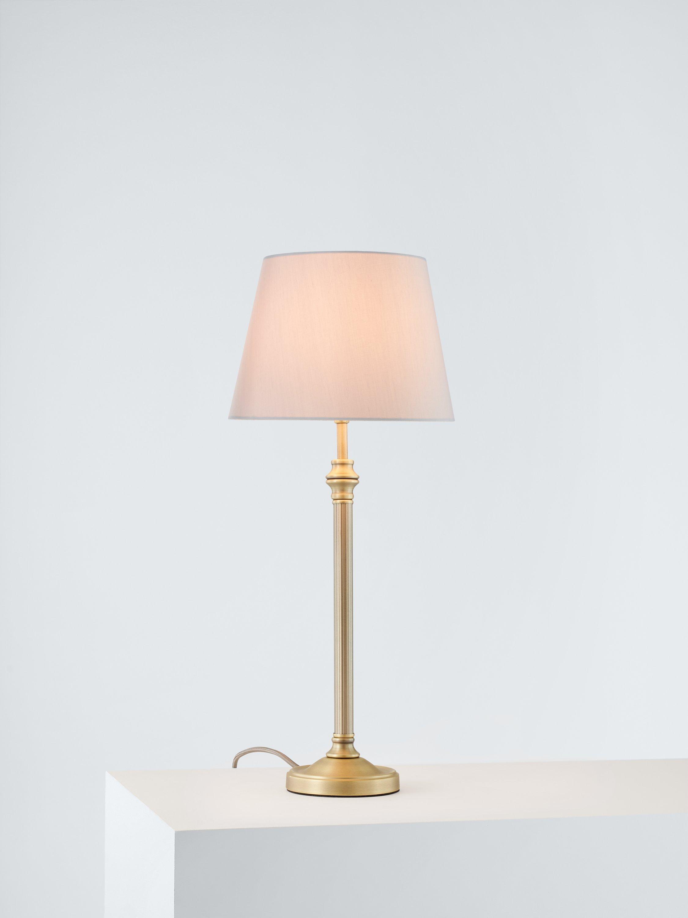 This floor lamp base is sold without shade so you can choose your own.
