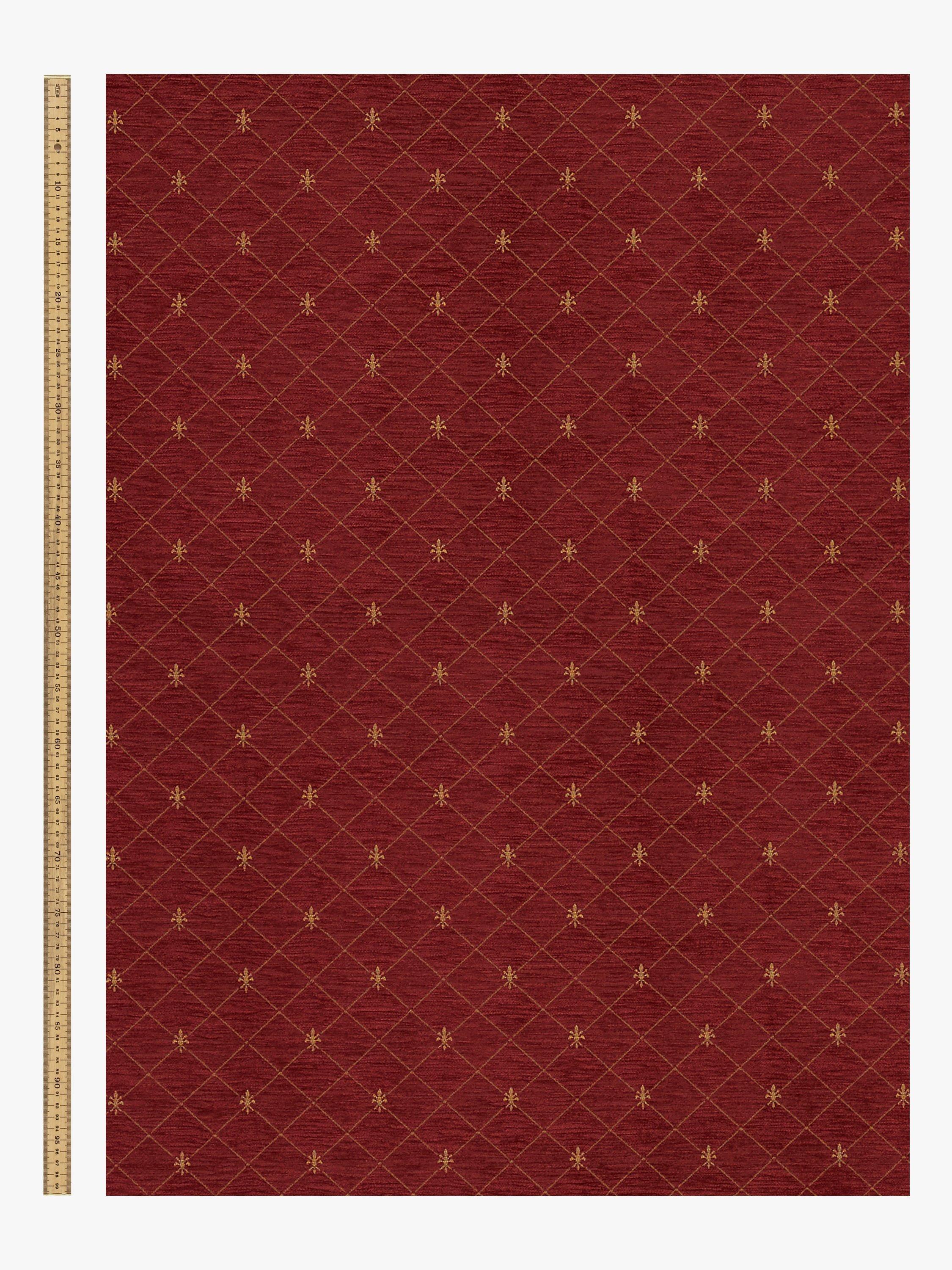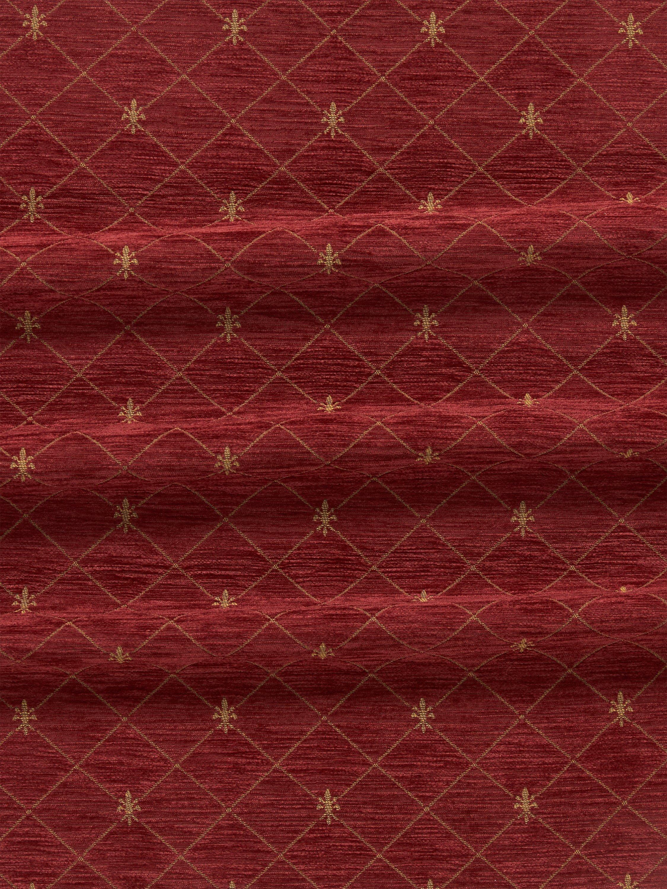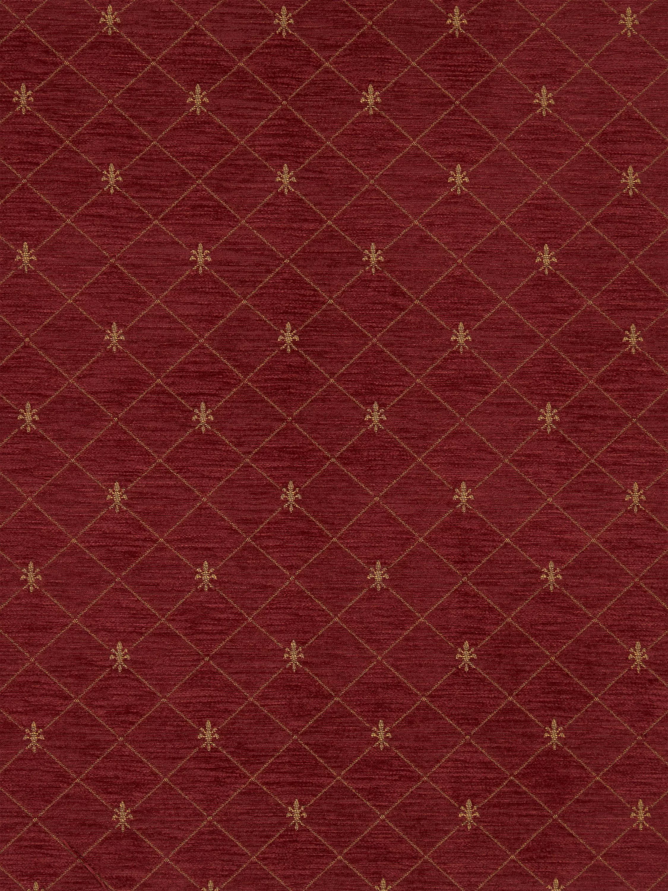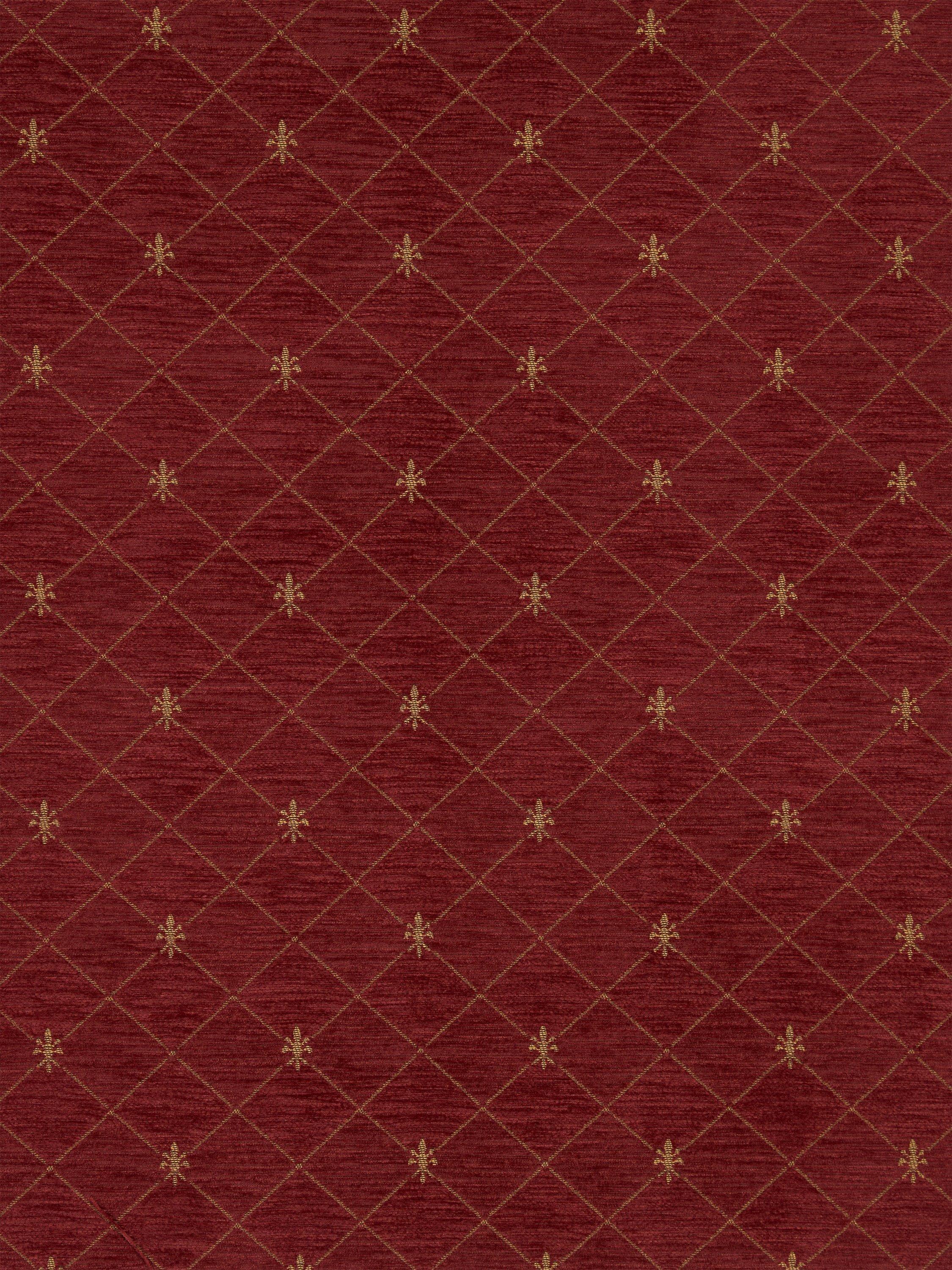 Woven fabric with a trellis and fleur de lys design.