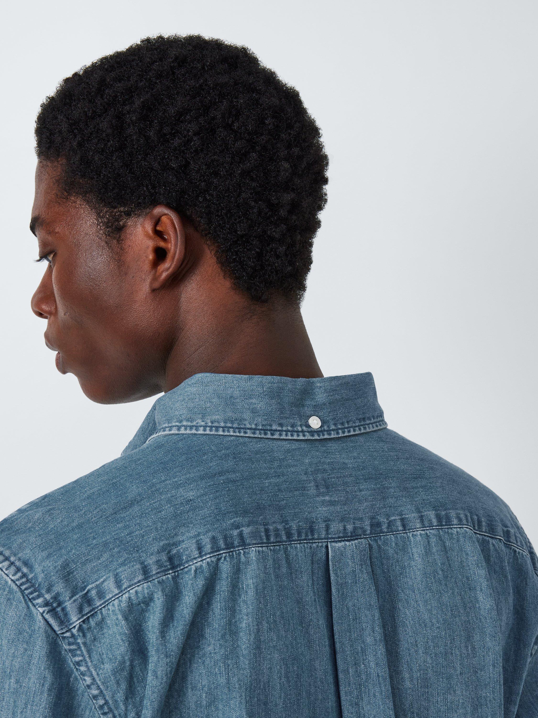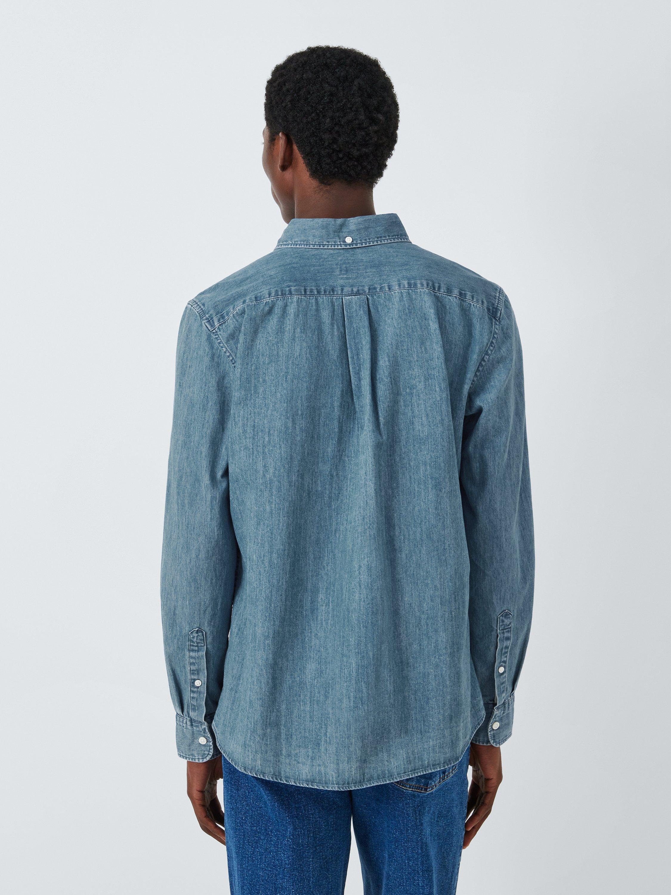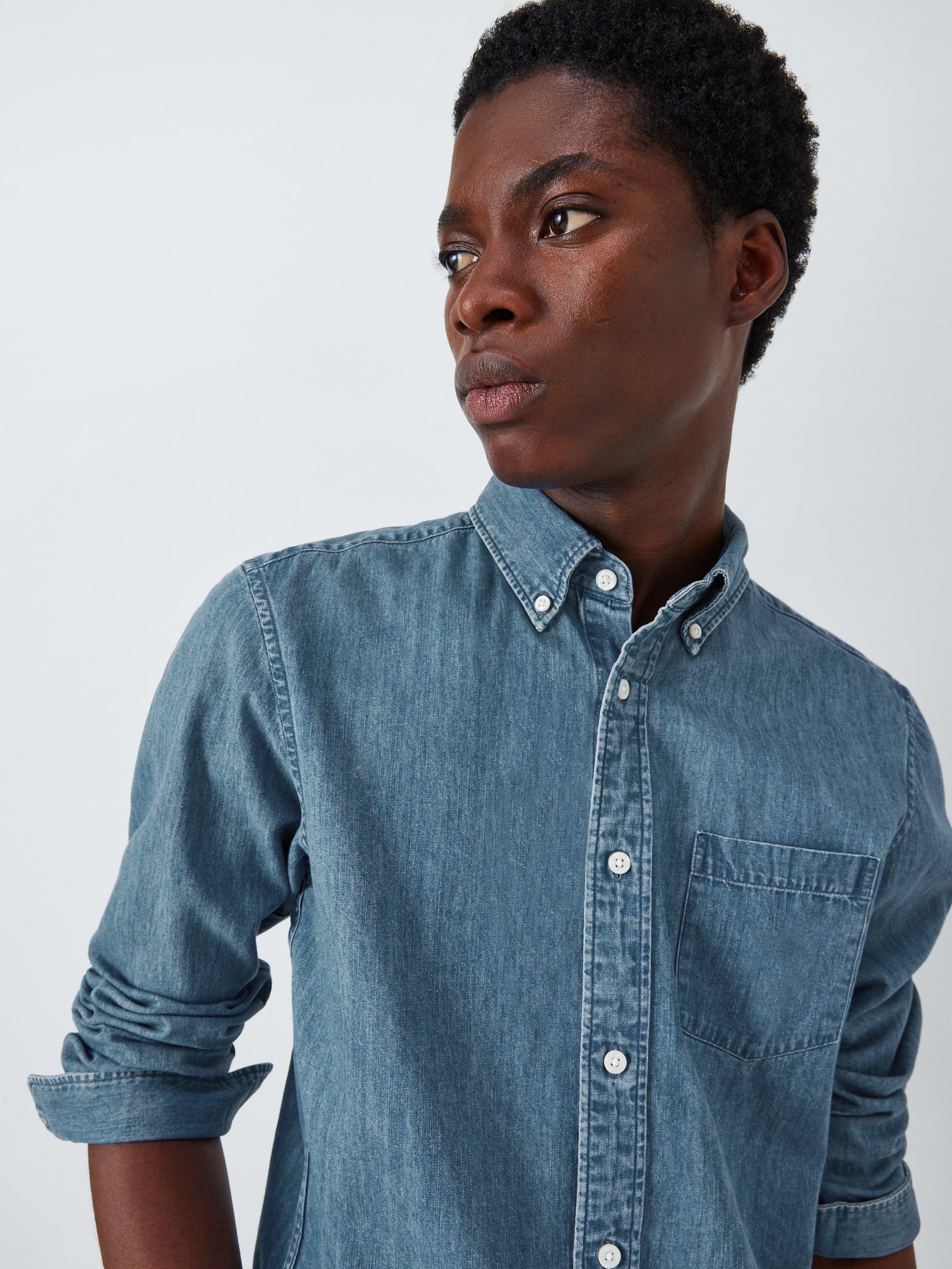 Made from soft denim, this shirt is framed by a classic button-down collar and fastened by imitation mother of pearl buttons. Finished with worker shirt inspired pockets at the chest, this shirt looks at home over slim chinos and box-fresh trainers.