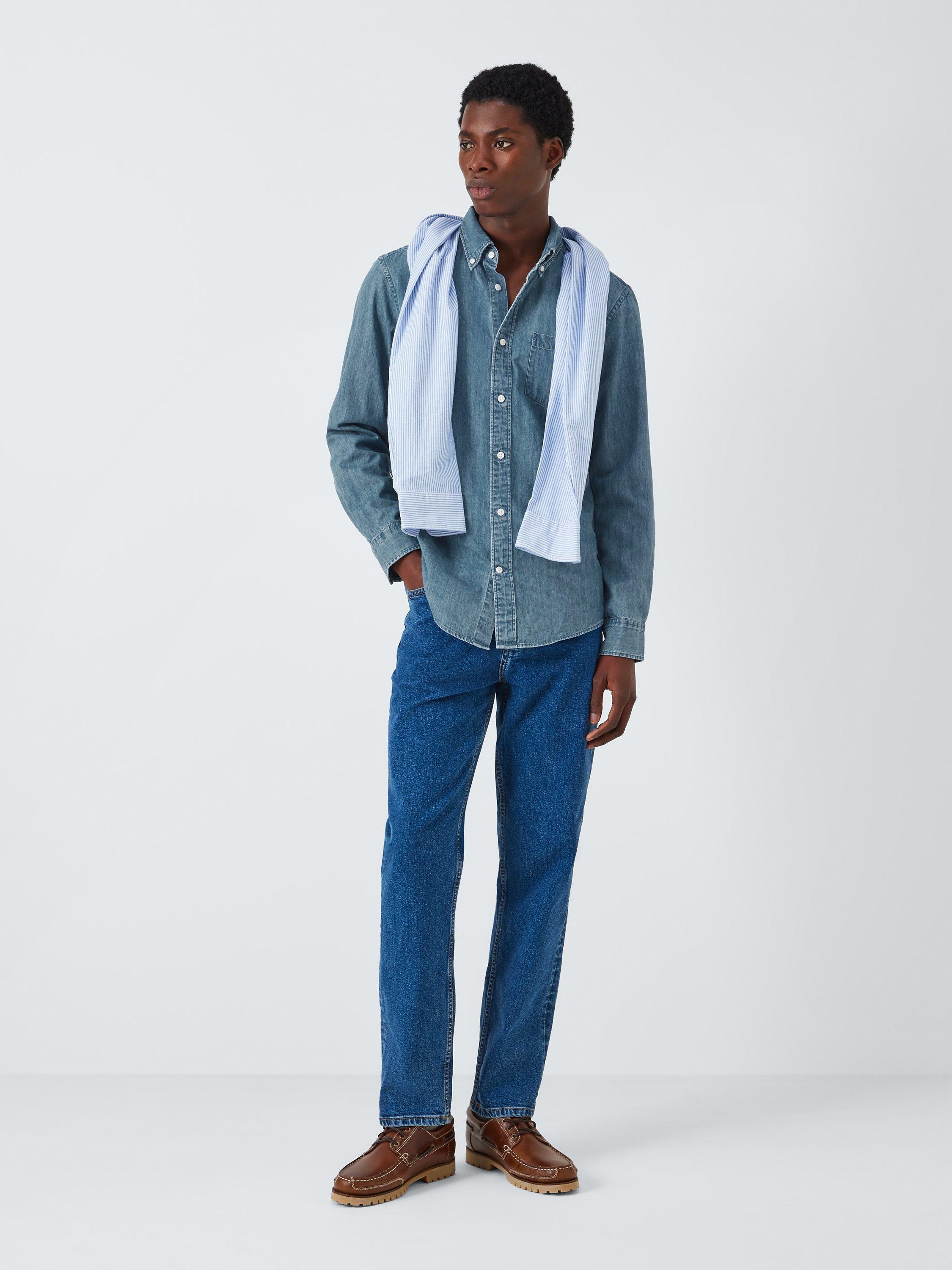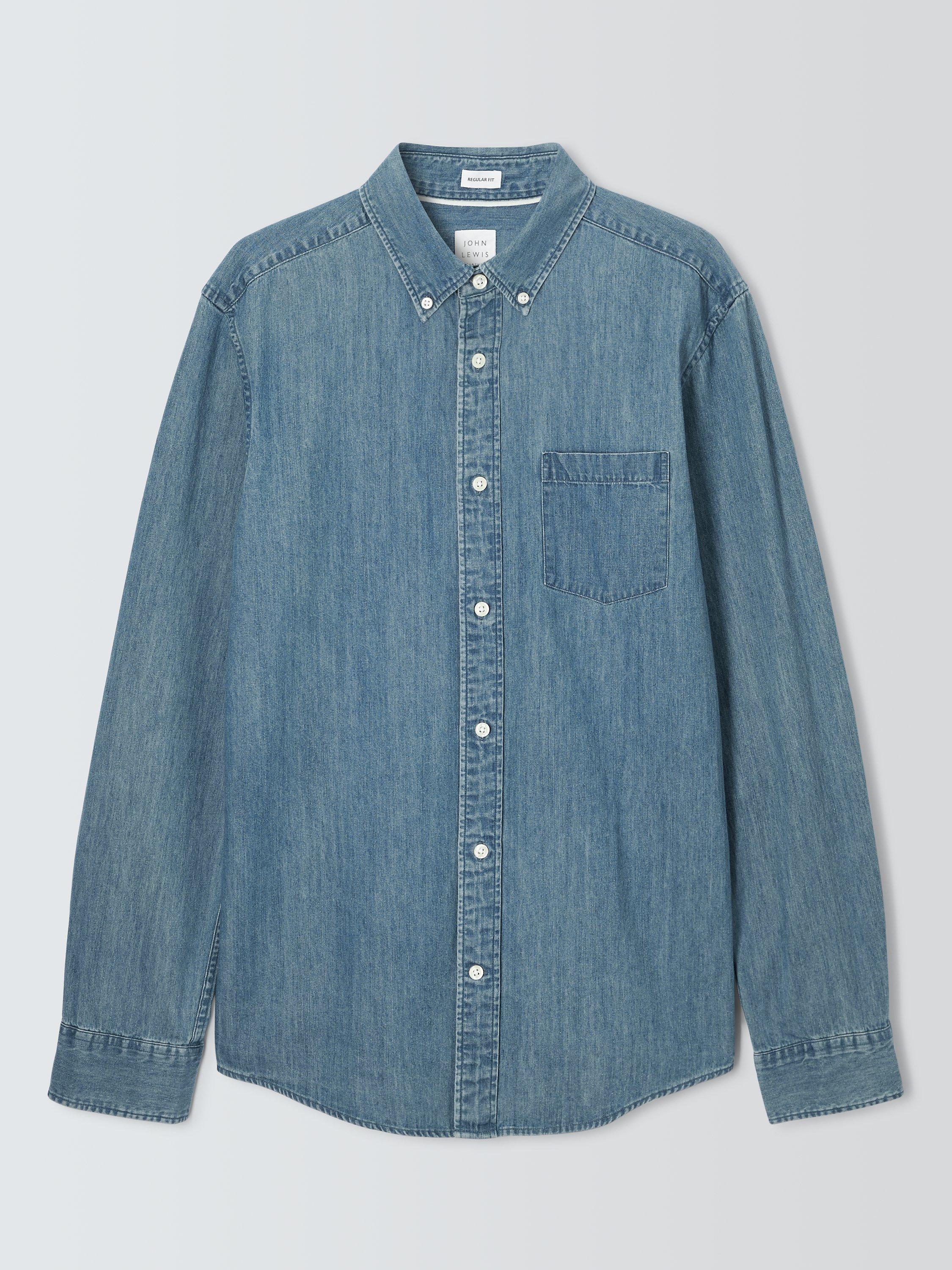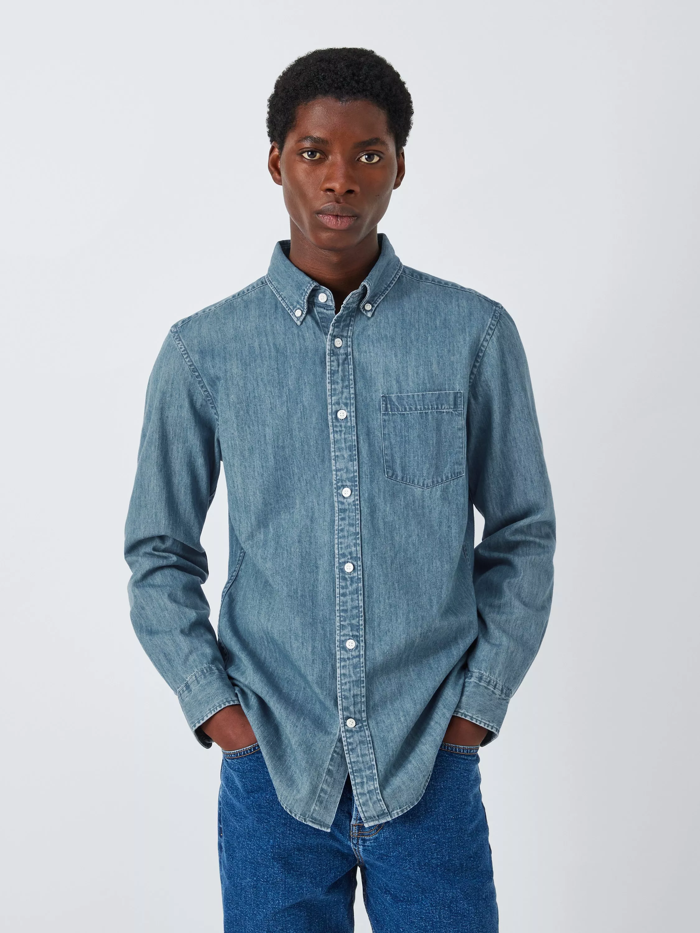Made from soft denim, this shirt is framed by a classic button-down collar and fastened by imitation mother of pearl buttons. Finished with worker shirt inspired pockets at the chest, this shirt looks at home over slim chinos and box-fresh trainers.