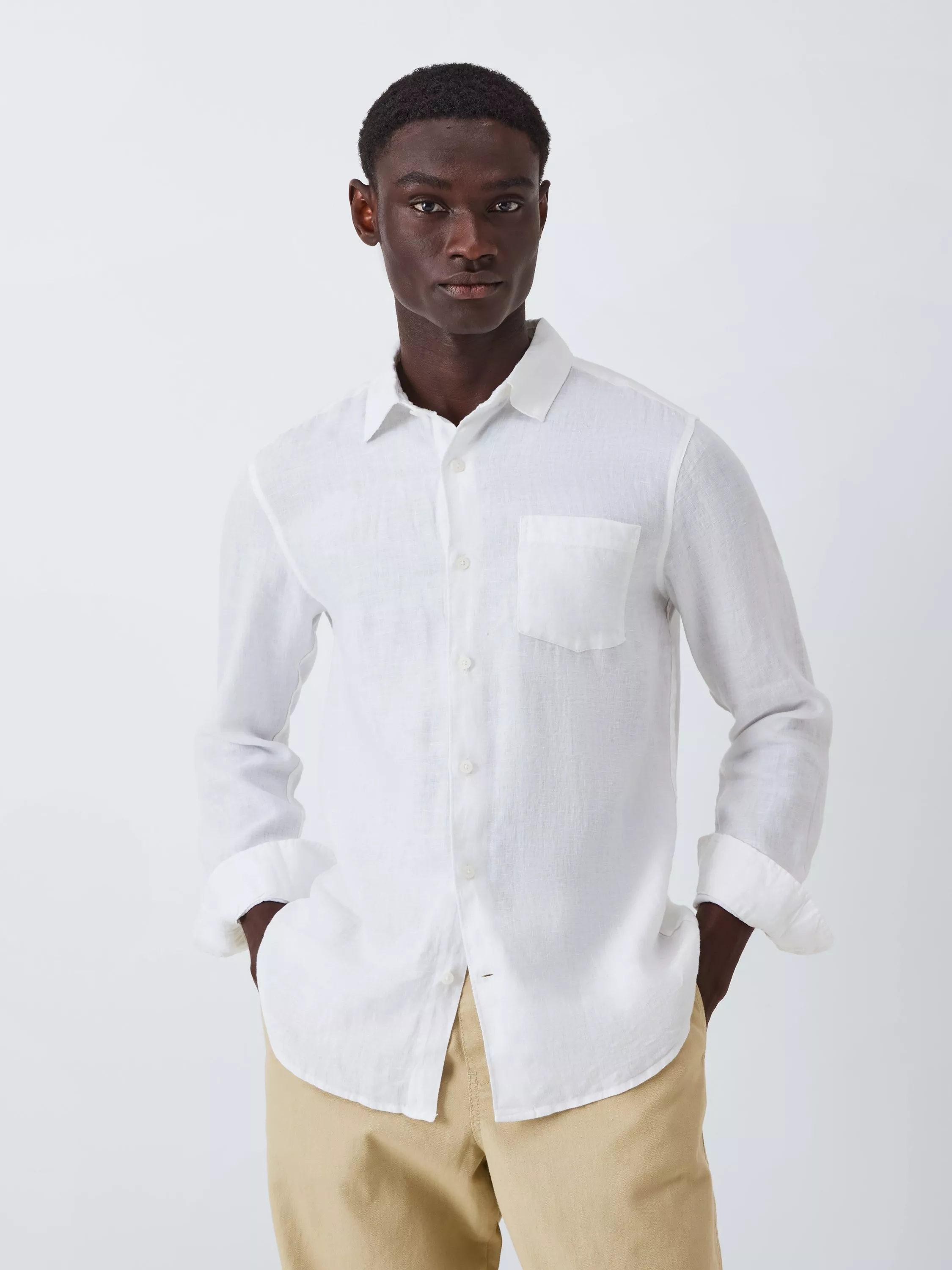Breathable, lightweight linen shirt with imitation mother-of-pearl buttons for an elevated edge. A regular fit and topped with a point collar. Styling tips? More linen. Linen trousers. Linen shorts. Linen cap.