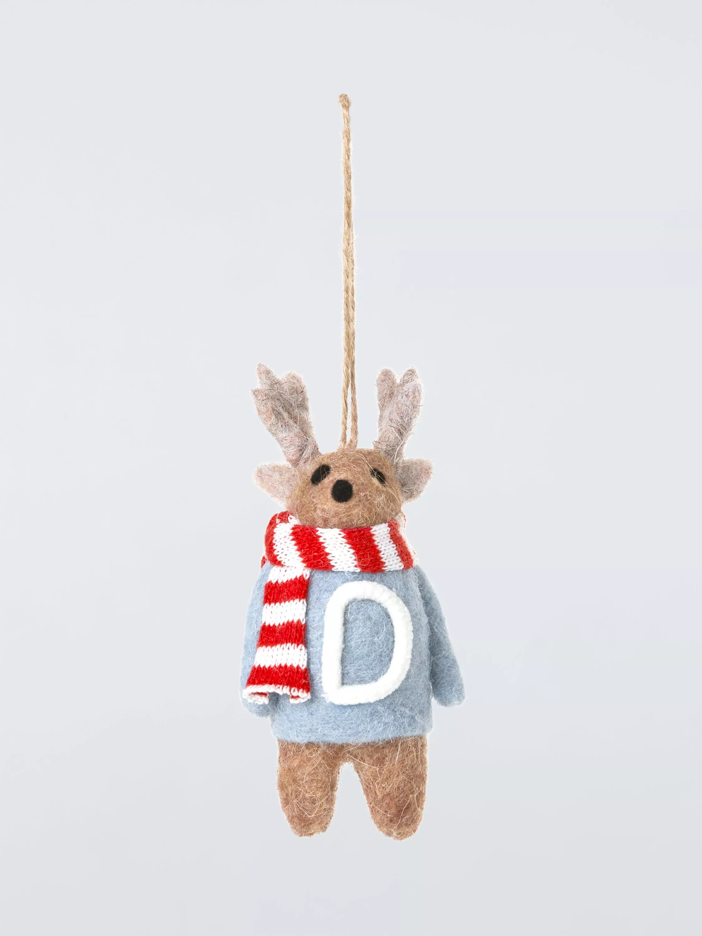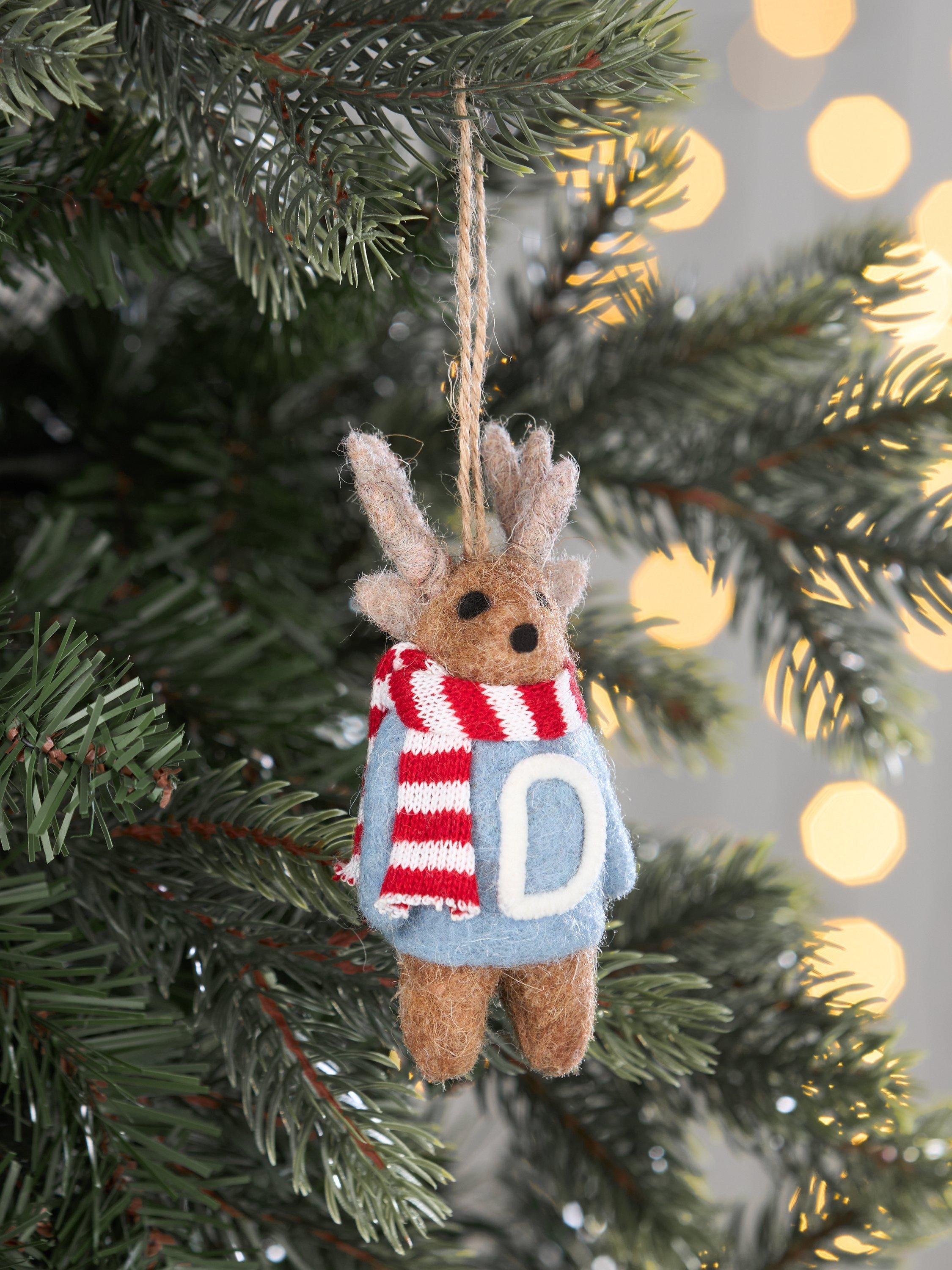 A fuzzy felt reindeer with an alphabet jumper and a woolly scarf.