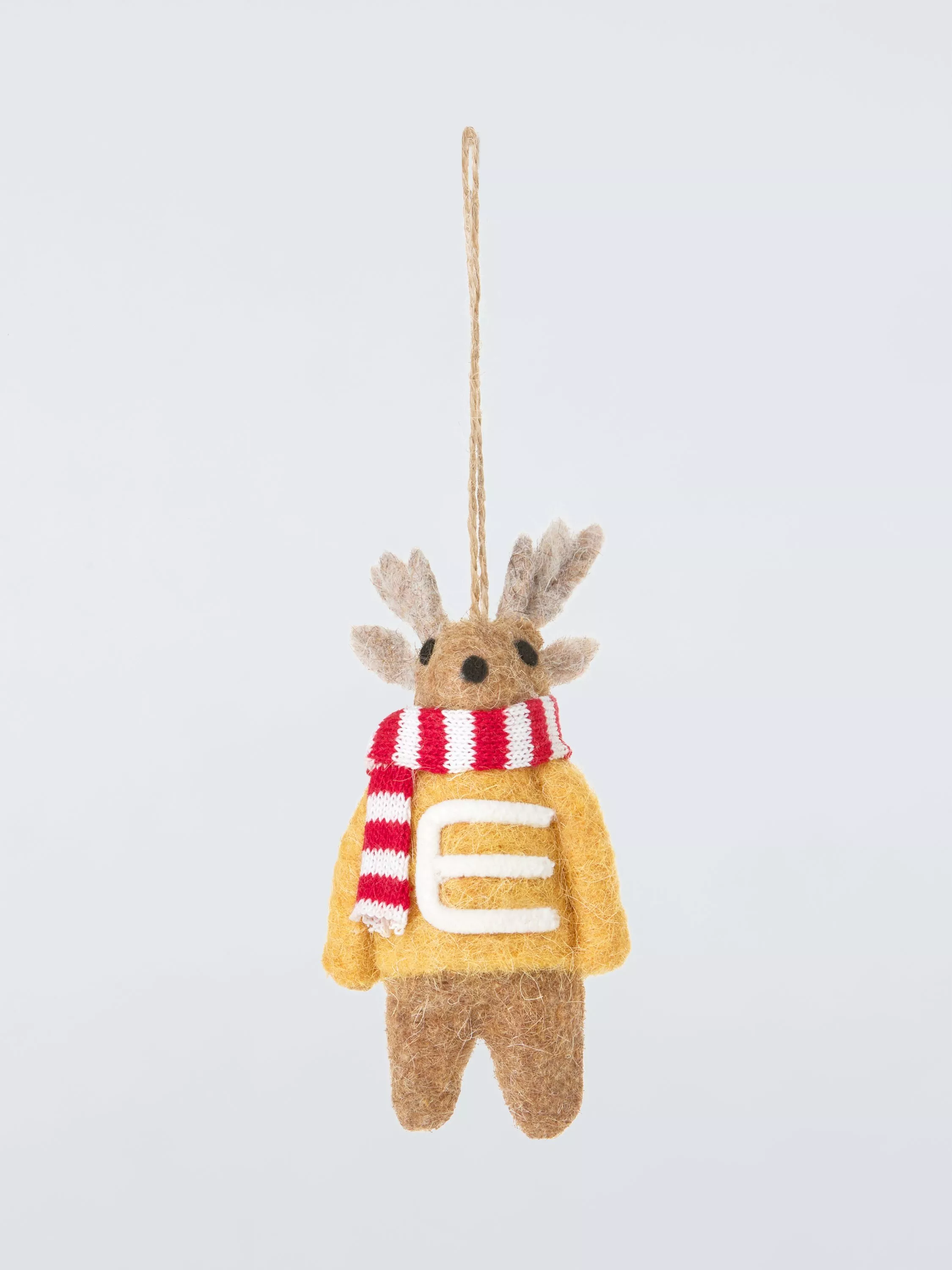 A fuzzy felt reindeer with an alphabet jumper and a woolly scarf.