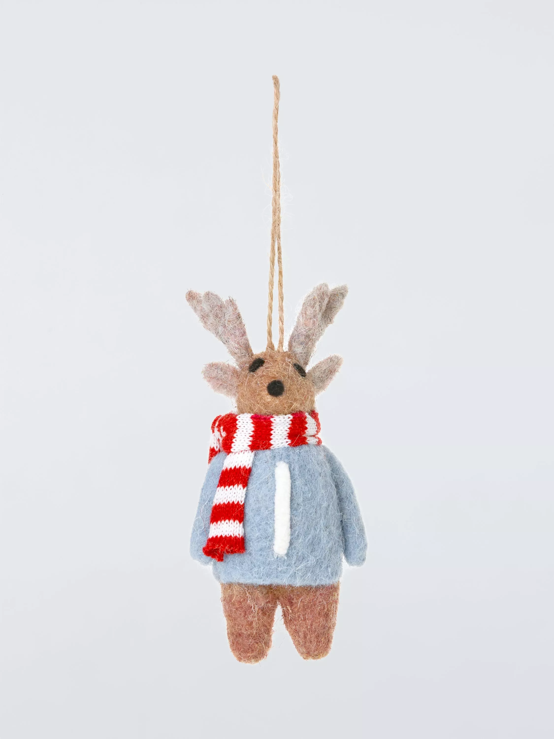 A fuzzy felt reindeer with an alphabet jumper and a woolly scarf.