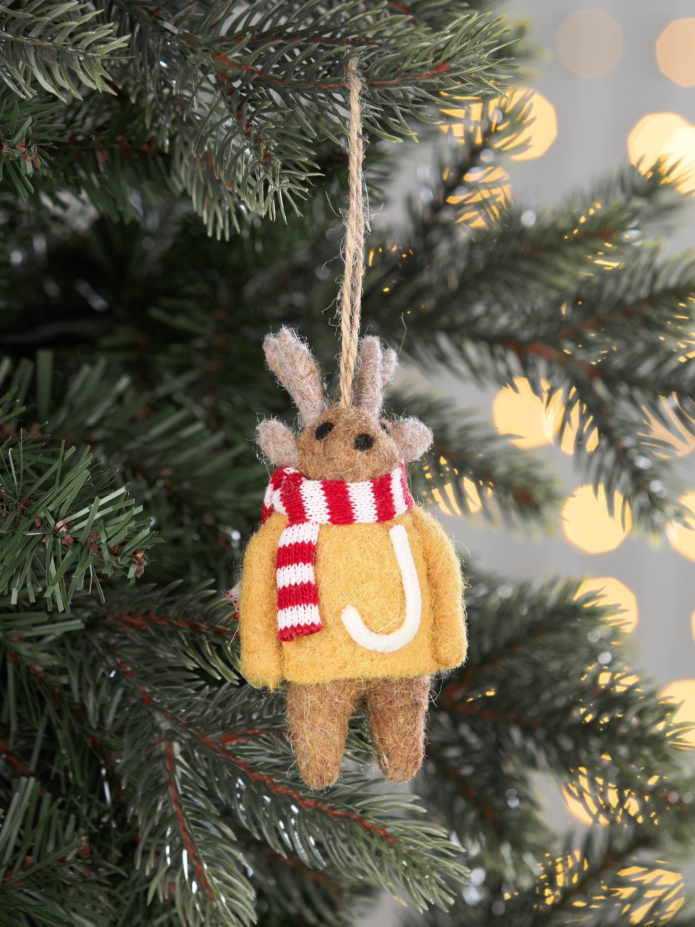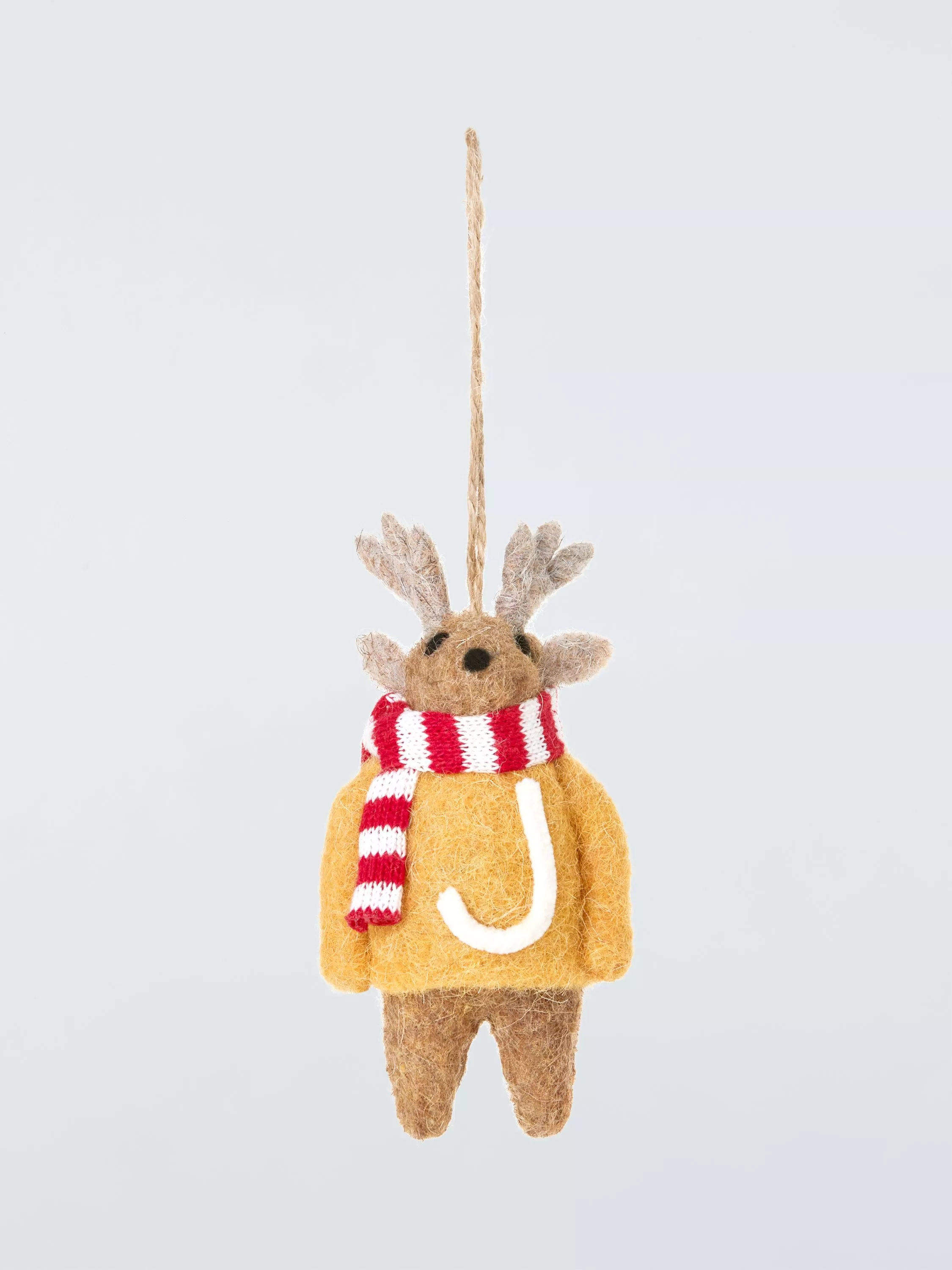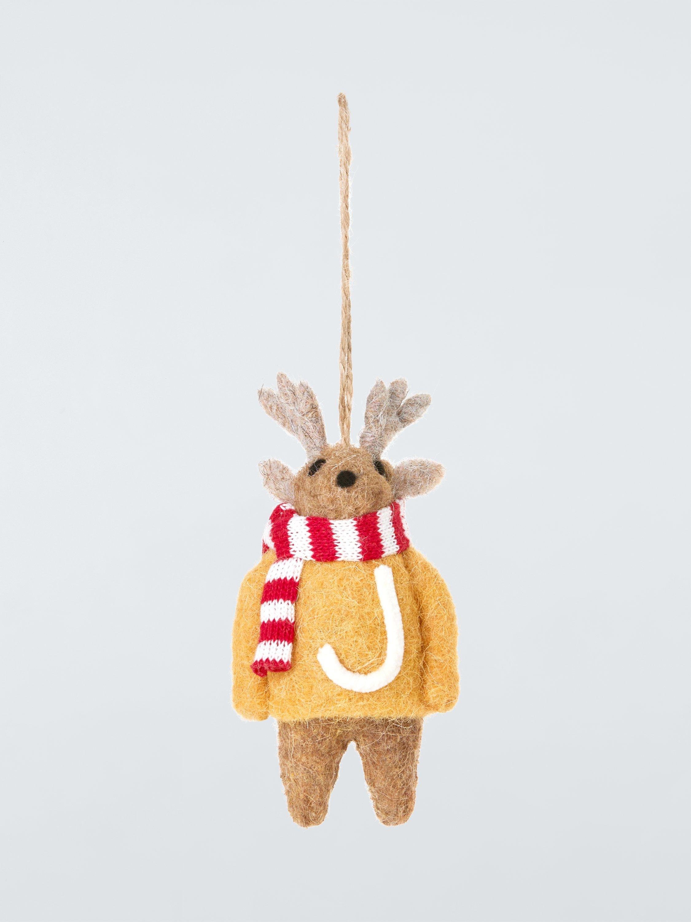 A fuzzy felt reindeer with an alphabet jumper and a woolly scarf.