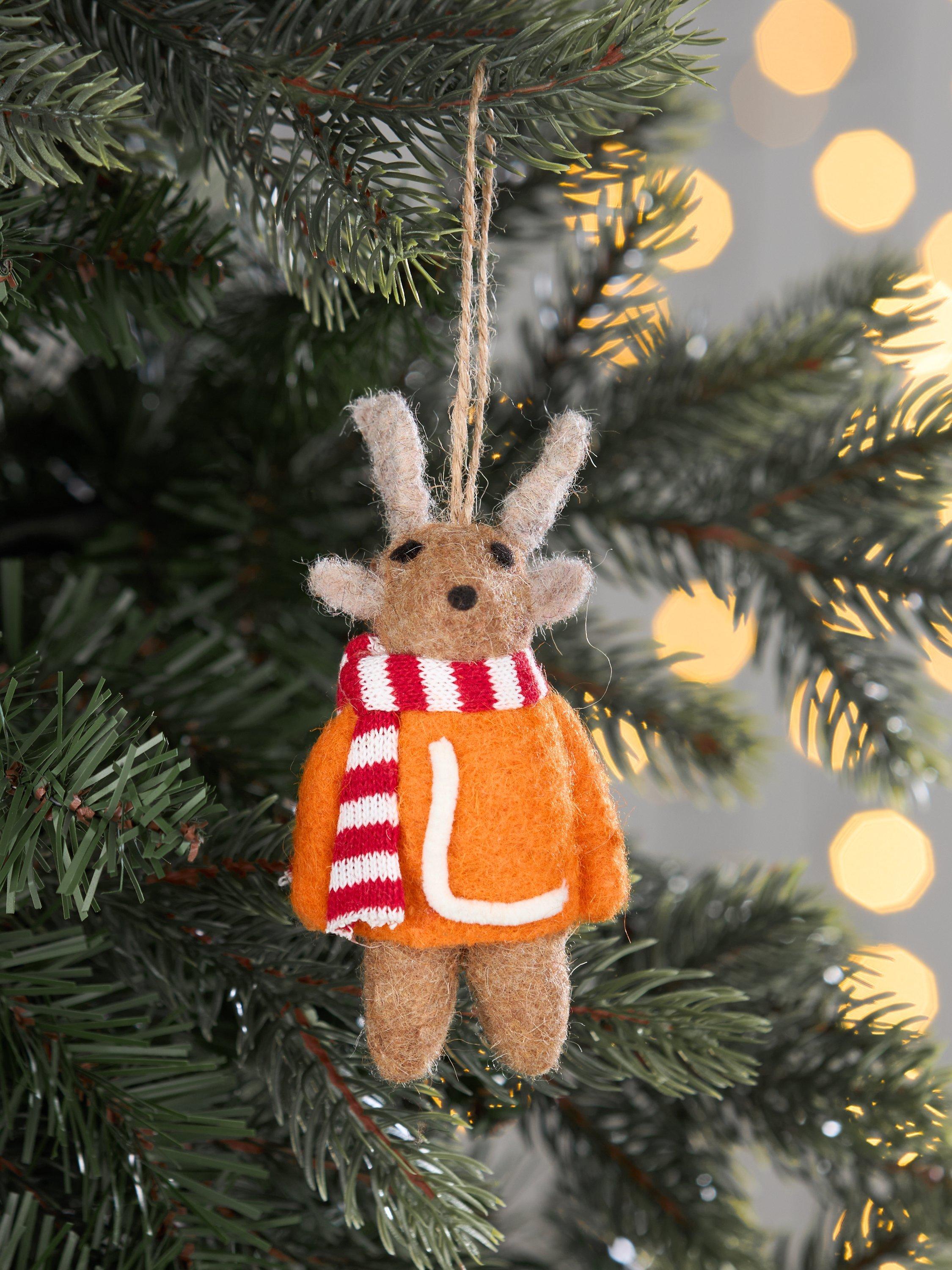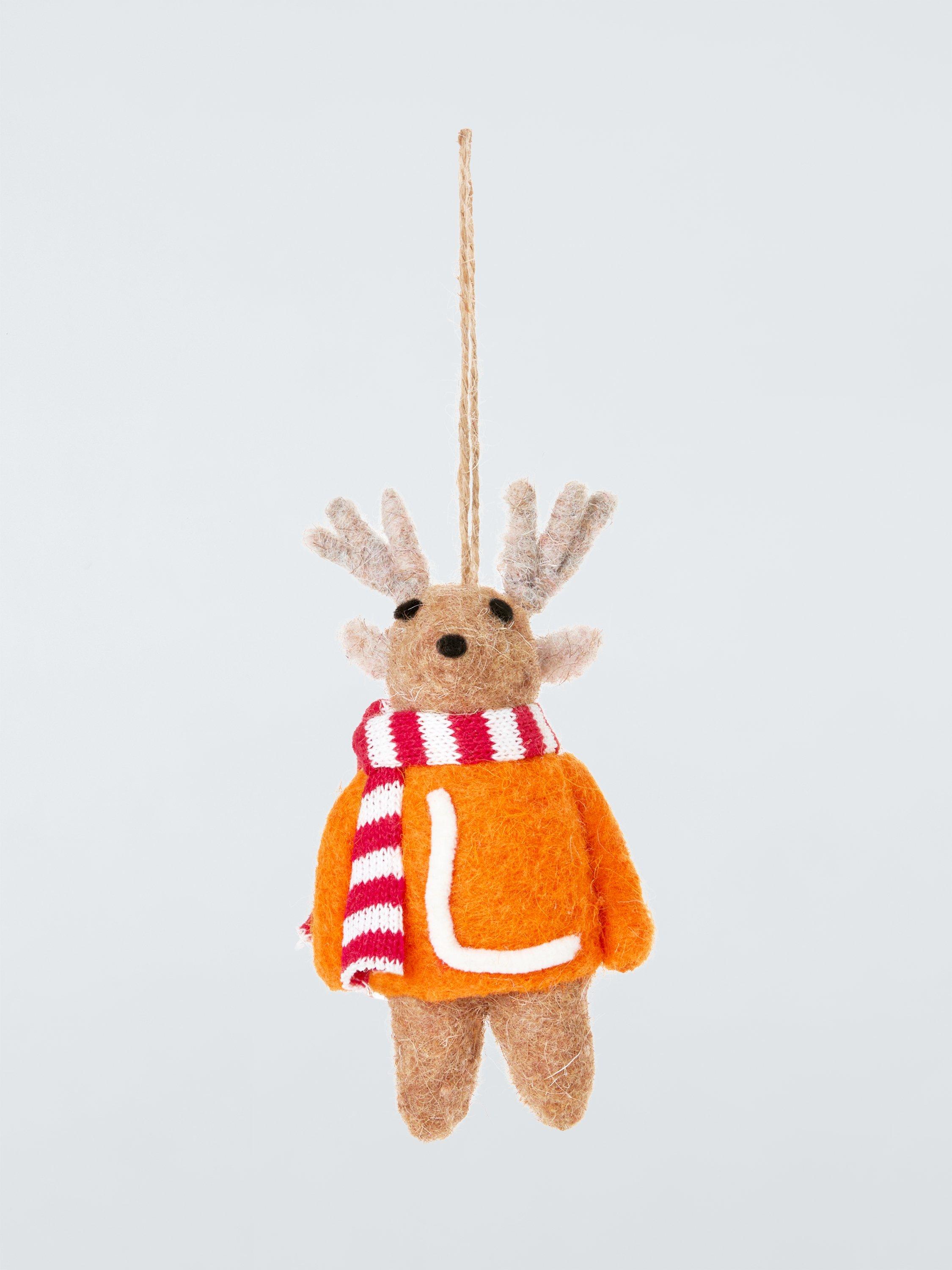 A fuzzy felt reindeer with an alphabet jumper and a woolly scarf.
