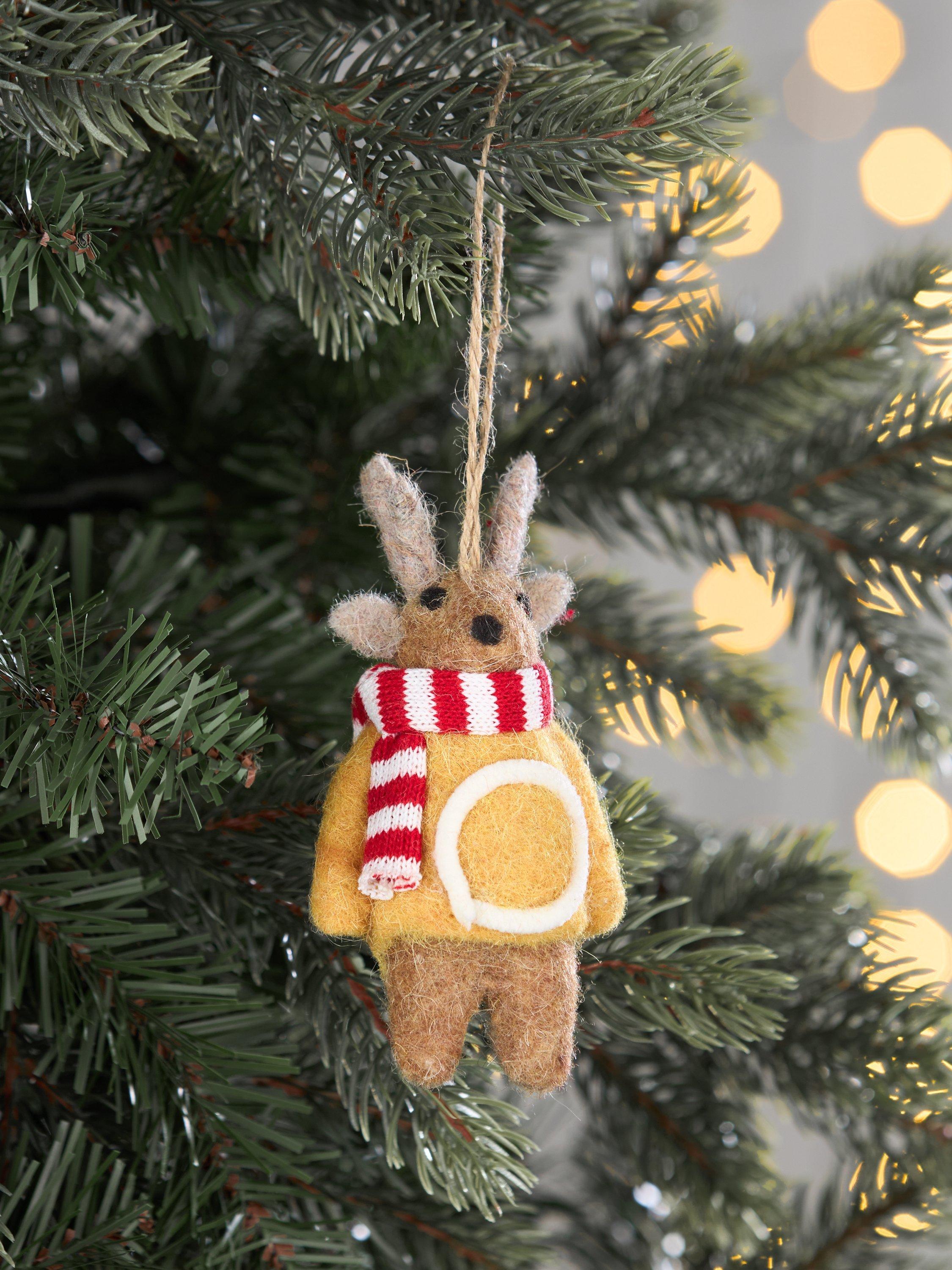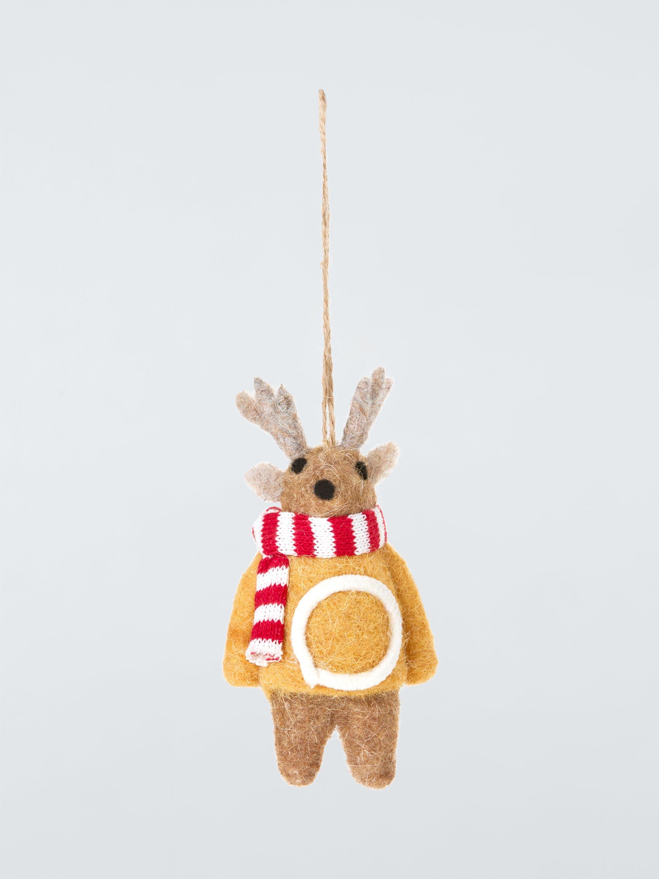 A fuzzy felt reindeer with an alphabet jumper and a woolly scarf.