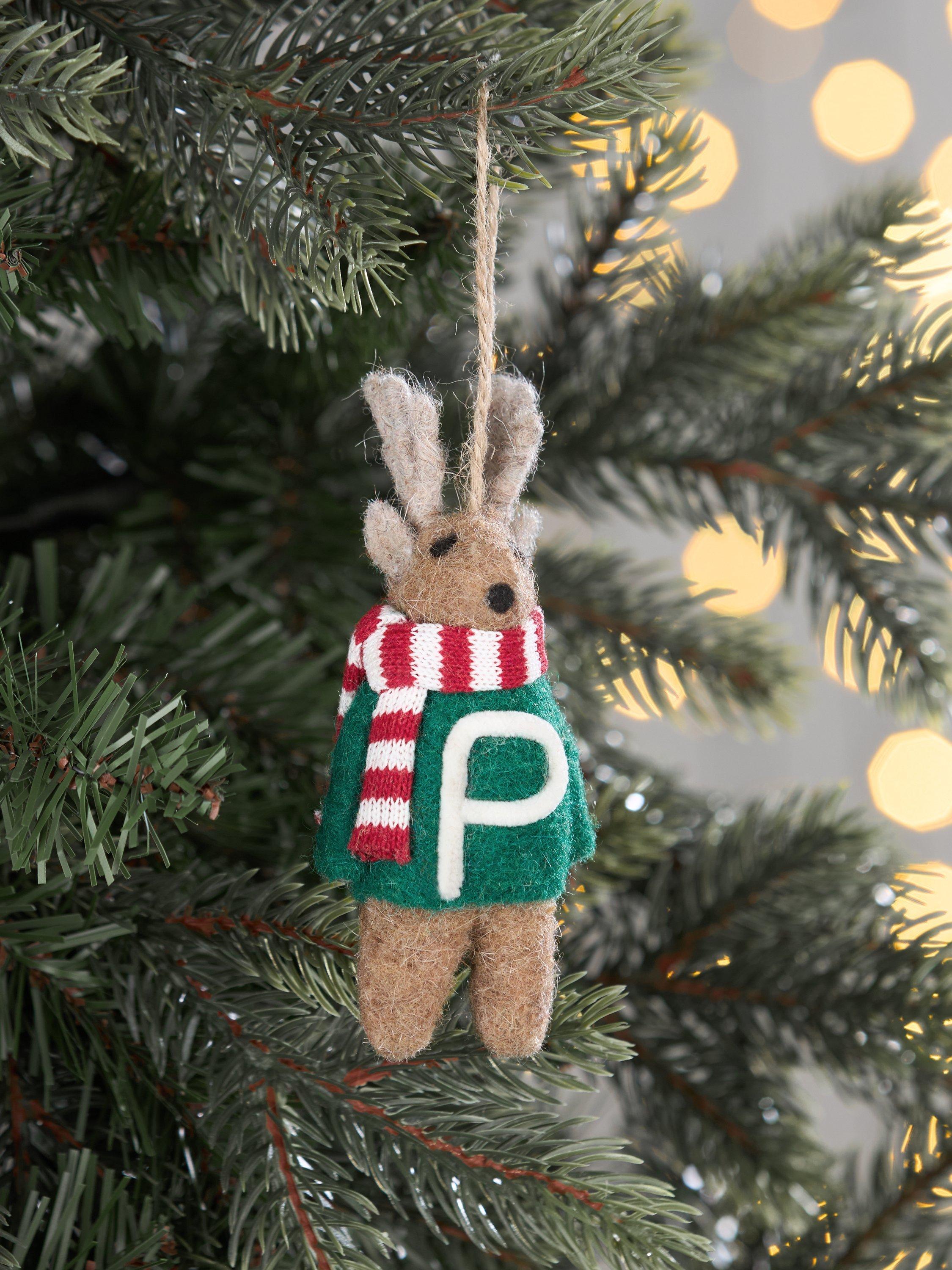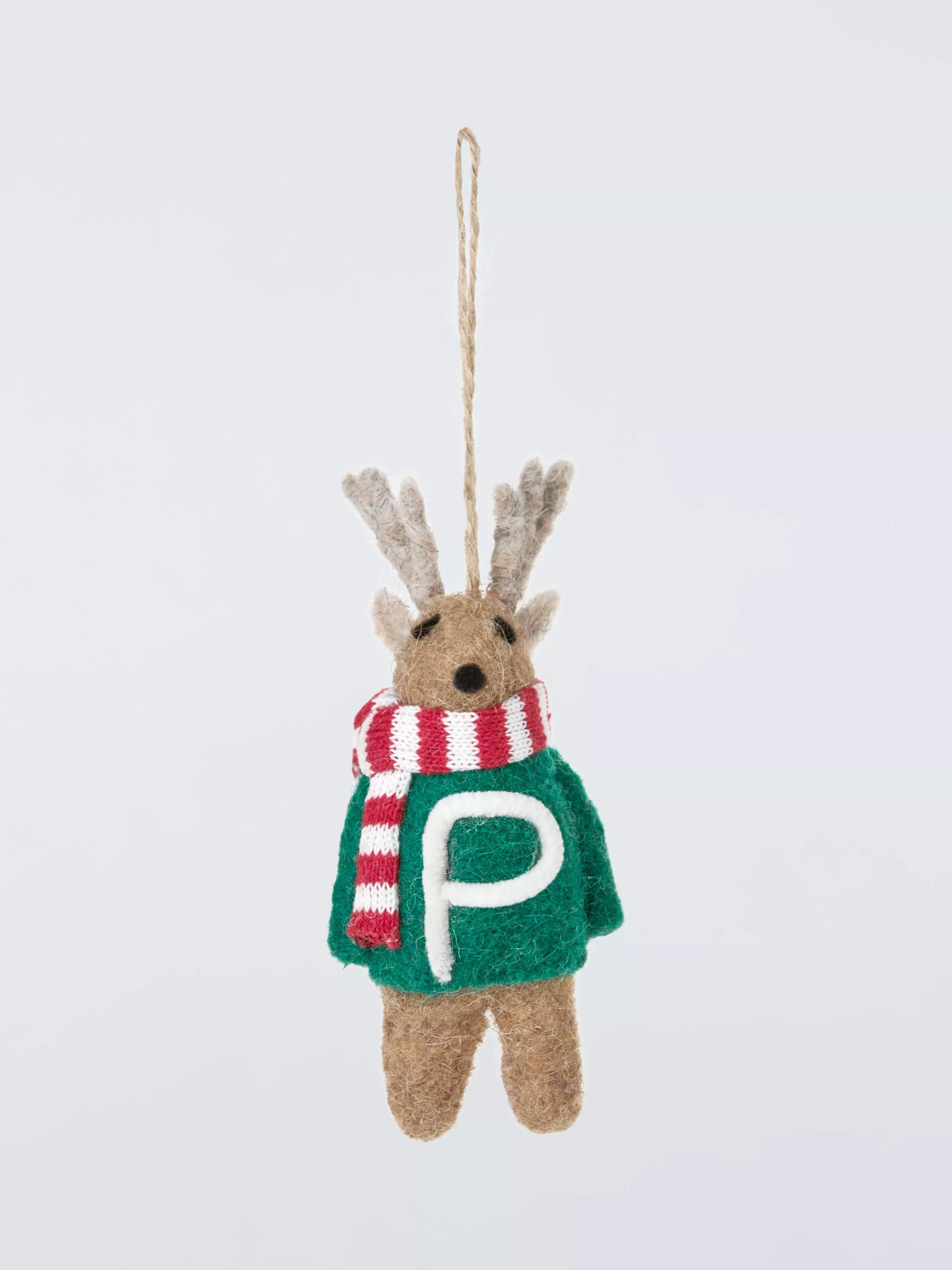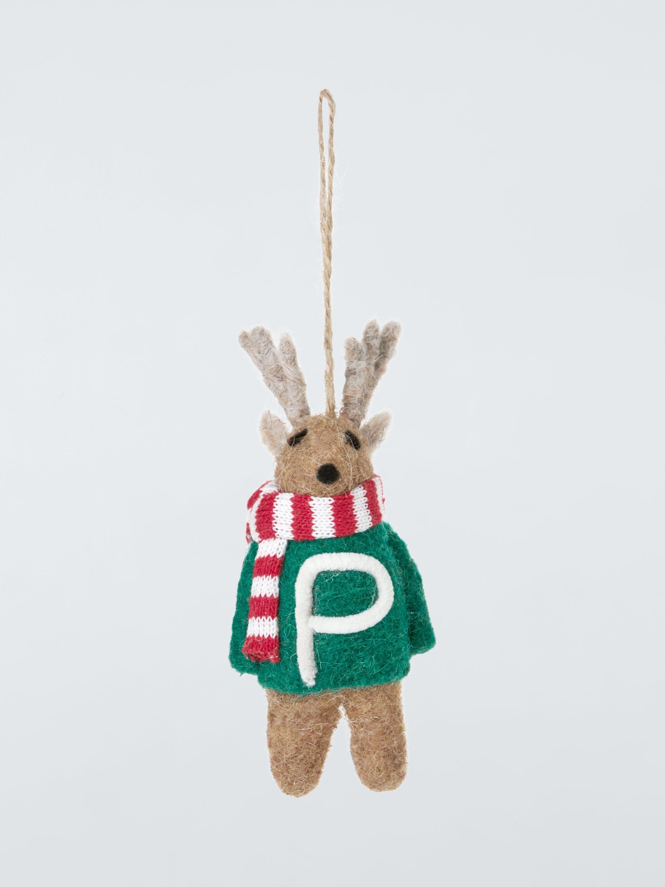 A fuzzy felt reindeer with an alphabet jumper and a woolly scarf.