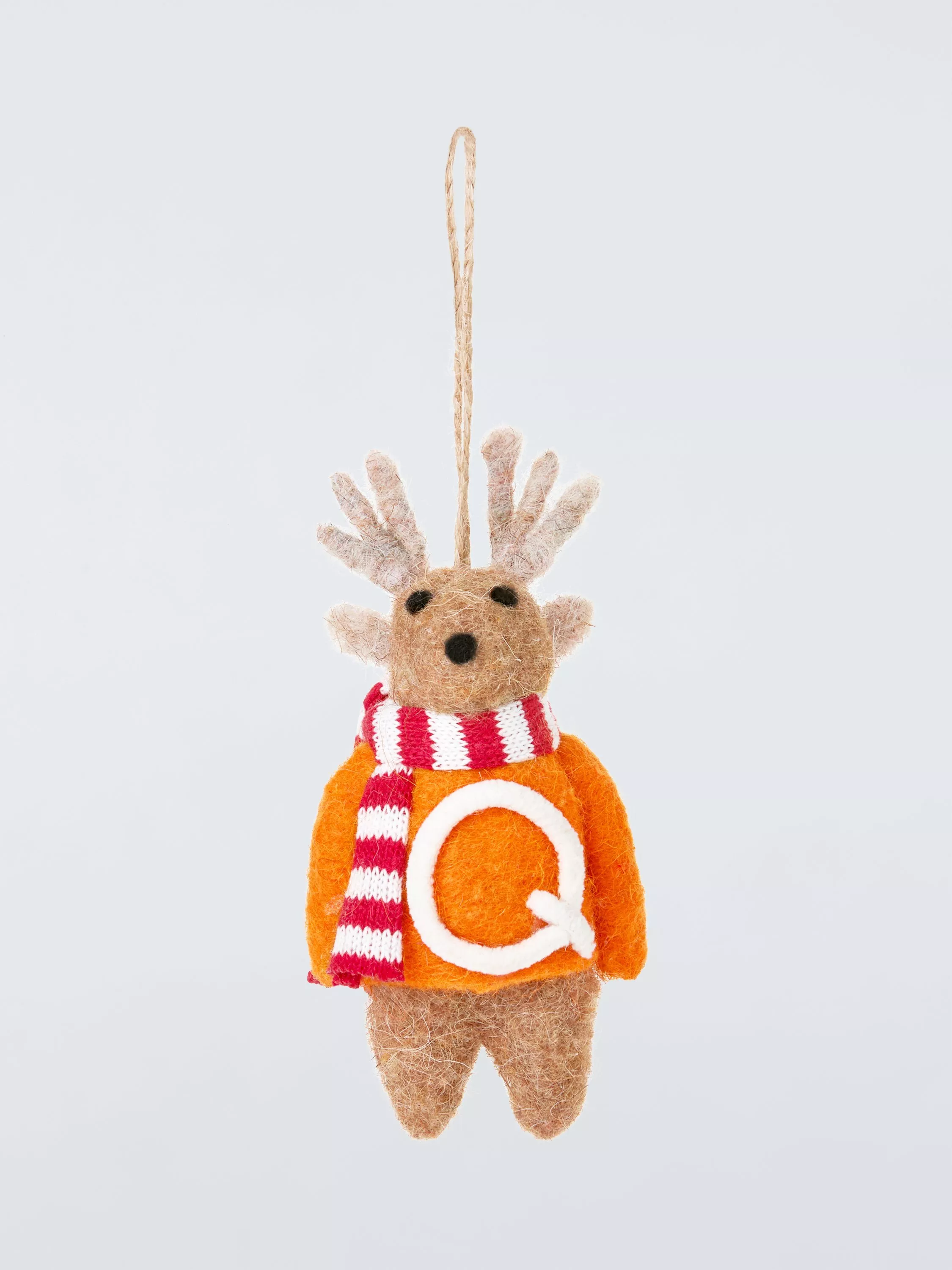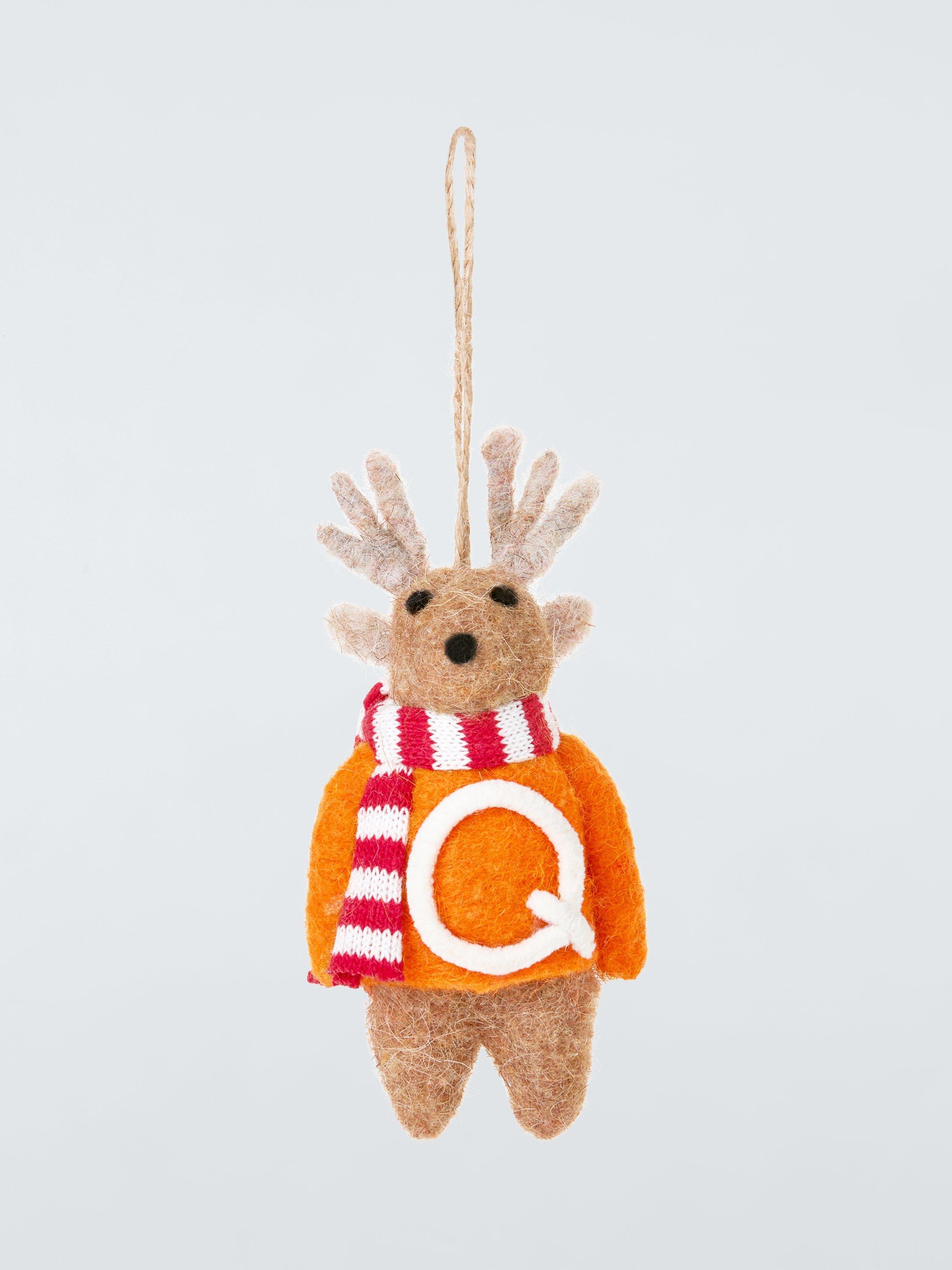 A fuzzy felt reindeer with an alphabet jumper and a woolly scarf.
