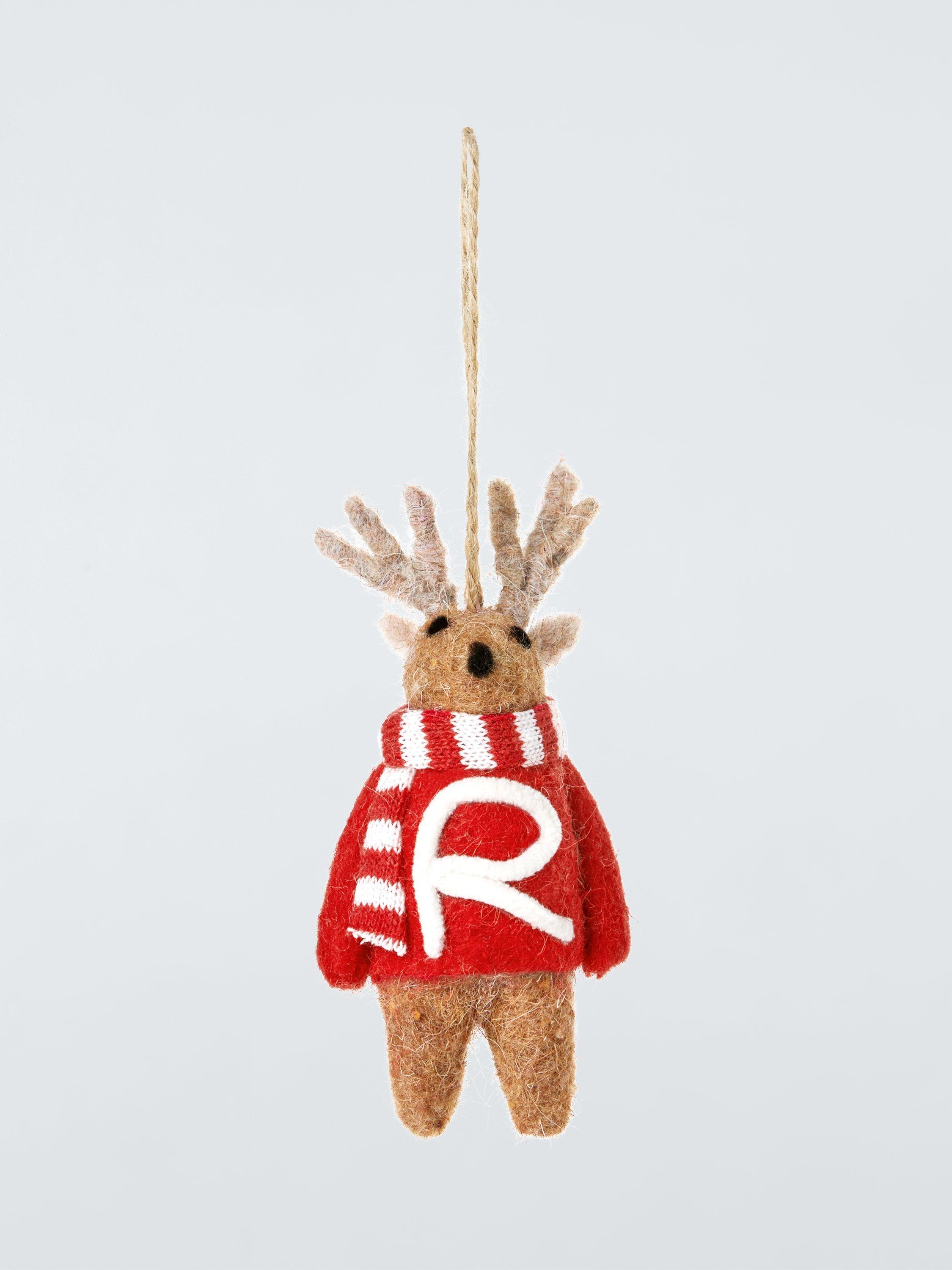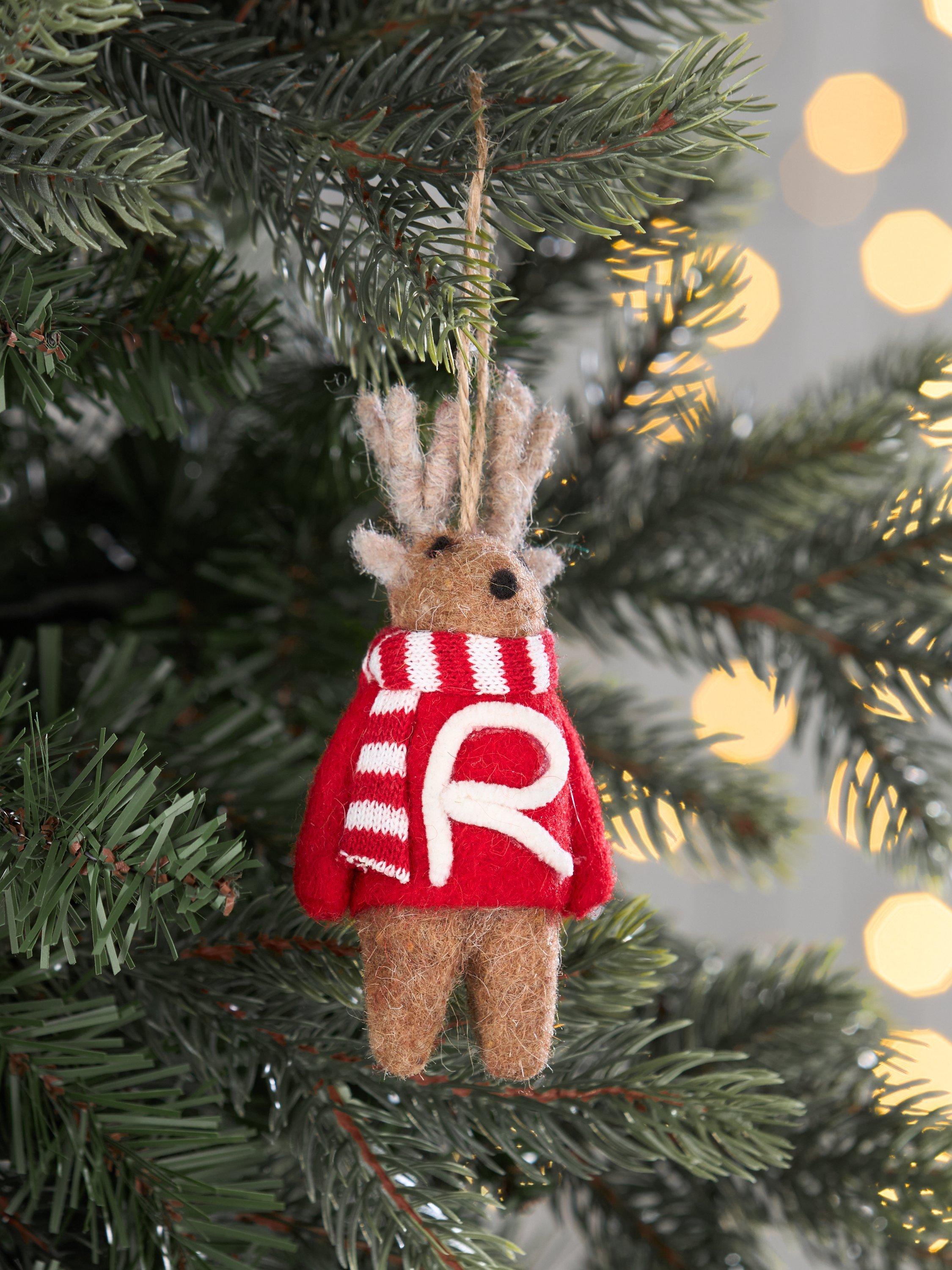 A fuzzy felt reindeer with an alphabet jumper and a woolly scarf.