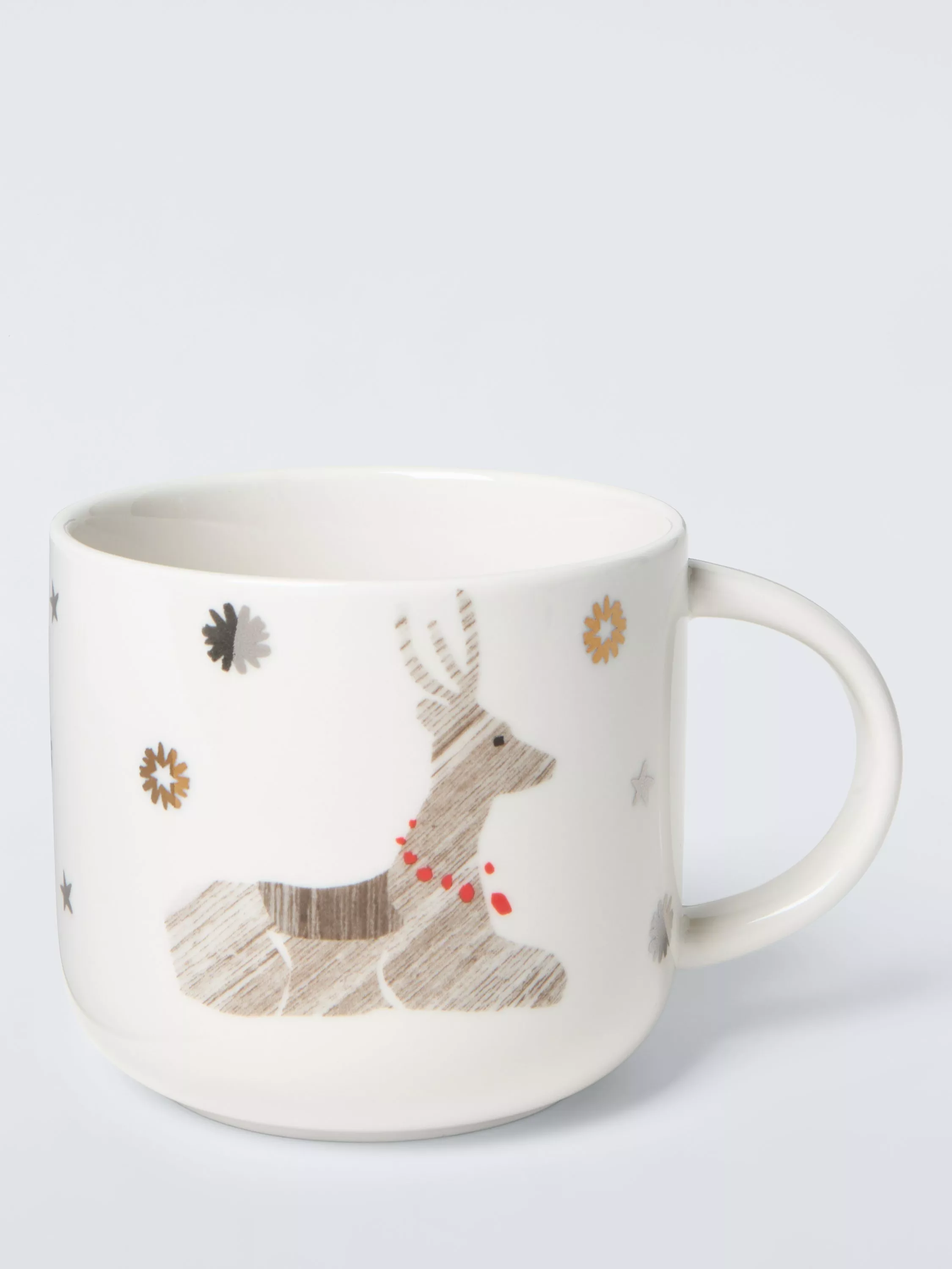 Feel festive during coffee or tea breaks with this reindeer mug. Created by our Design Studio, it's decorated with sparkling gold and silver details. Made of stoneware, it's dishwasher and microwave safe for everyday use.