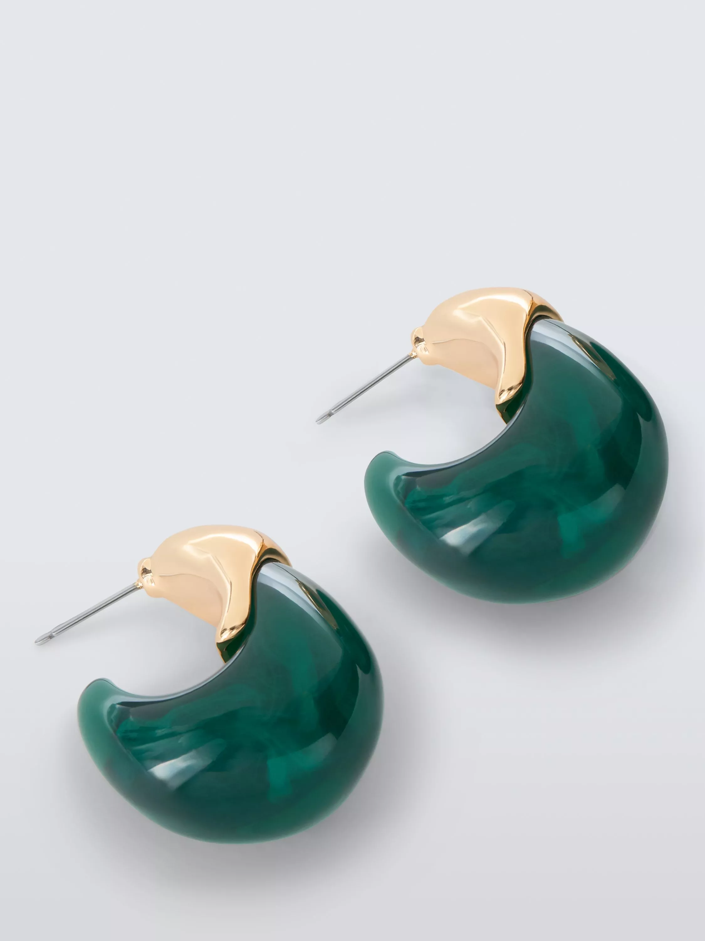 Gold plated half hoops with a sectioned claw shape in glossy green resin.