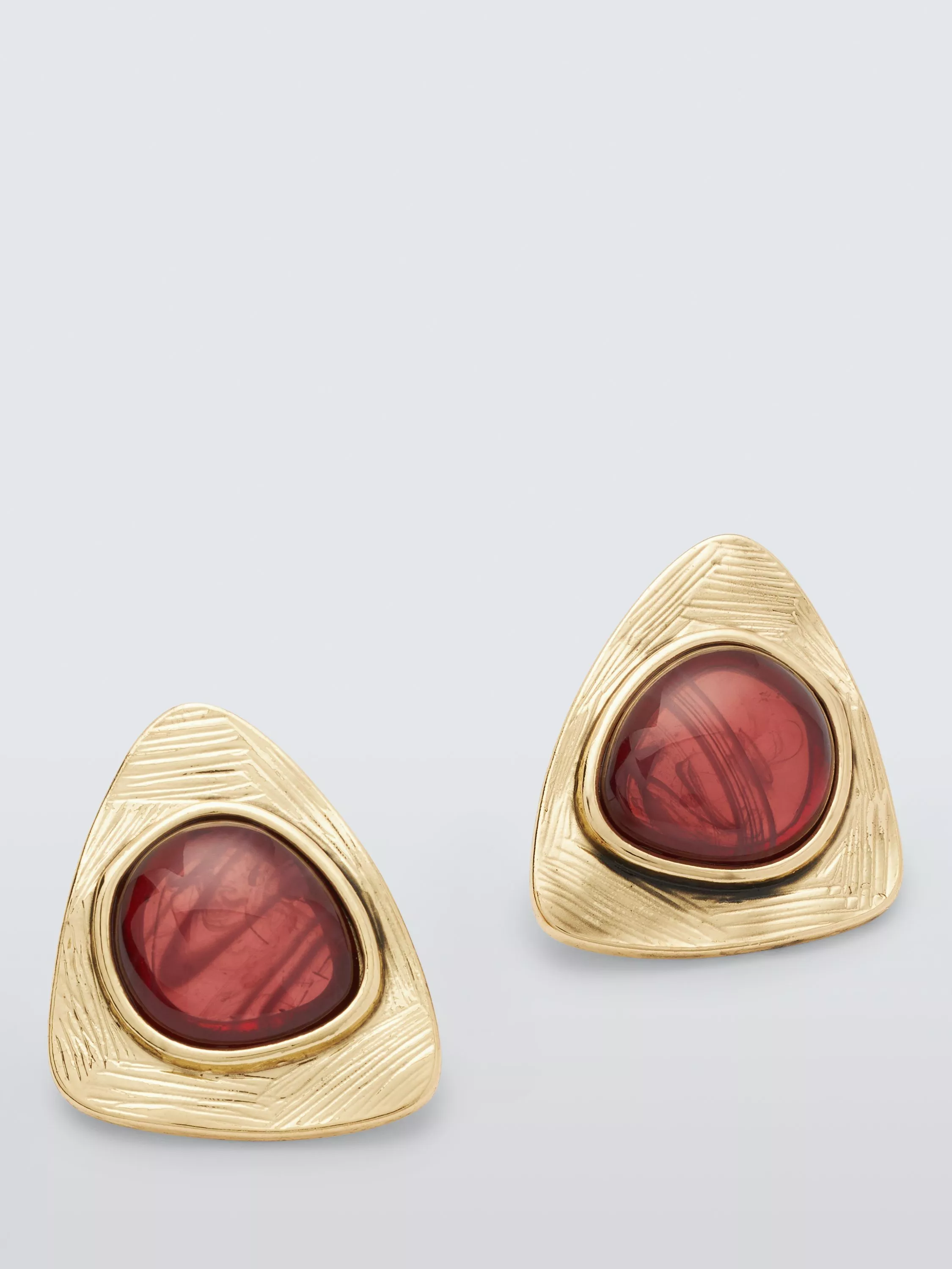 Textured triangular stud earrings set with a central domed resin gem offering a retro-inspired look. Secured with post fittings.