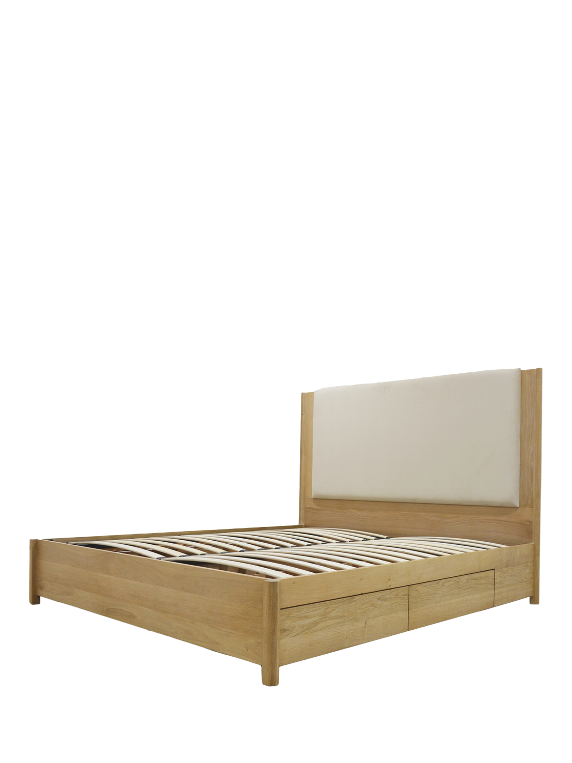 Built from solid oak with a padded, fabric panel on the headboard, we've designed this bed with two storage drawers on either side of the frame. Part of our Rest range, its sculpted design showcases refined craftsmanship and it's an ideal choice if you need the extra storage space in your bedroom. We've also added sprung slats in the base which will support your mattress effectively.