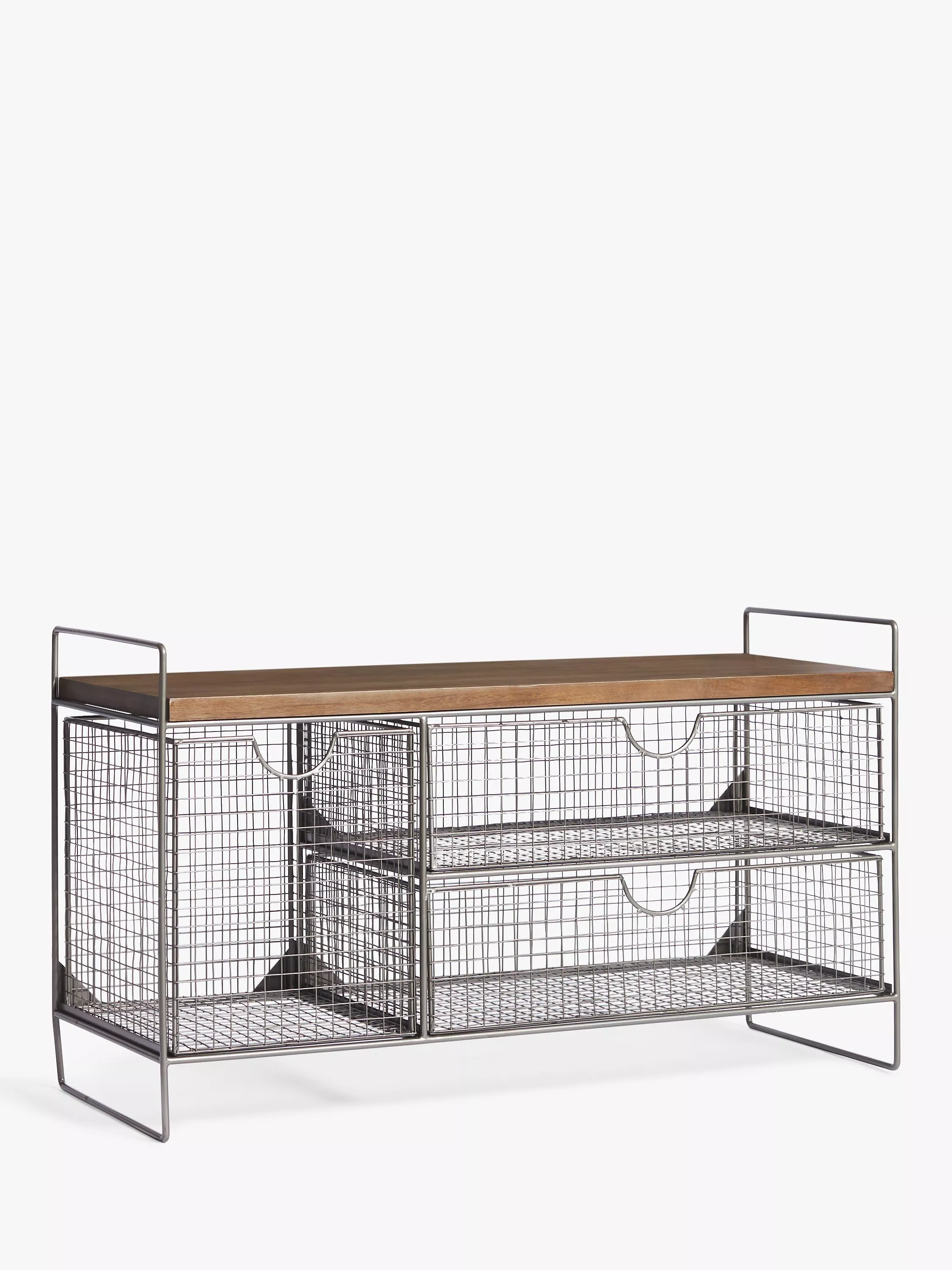 Made from wire mesh, with a wood tray top, it features two shallow drawers and a deep drawer, perfect for keeping shoes and other accessories neat and tidy.