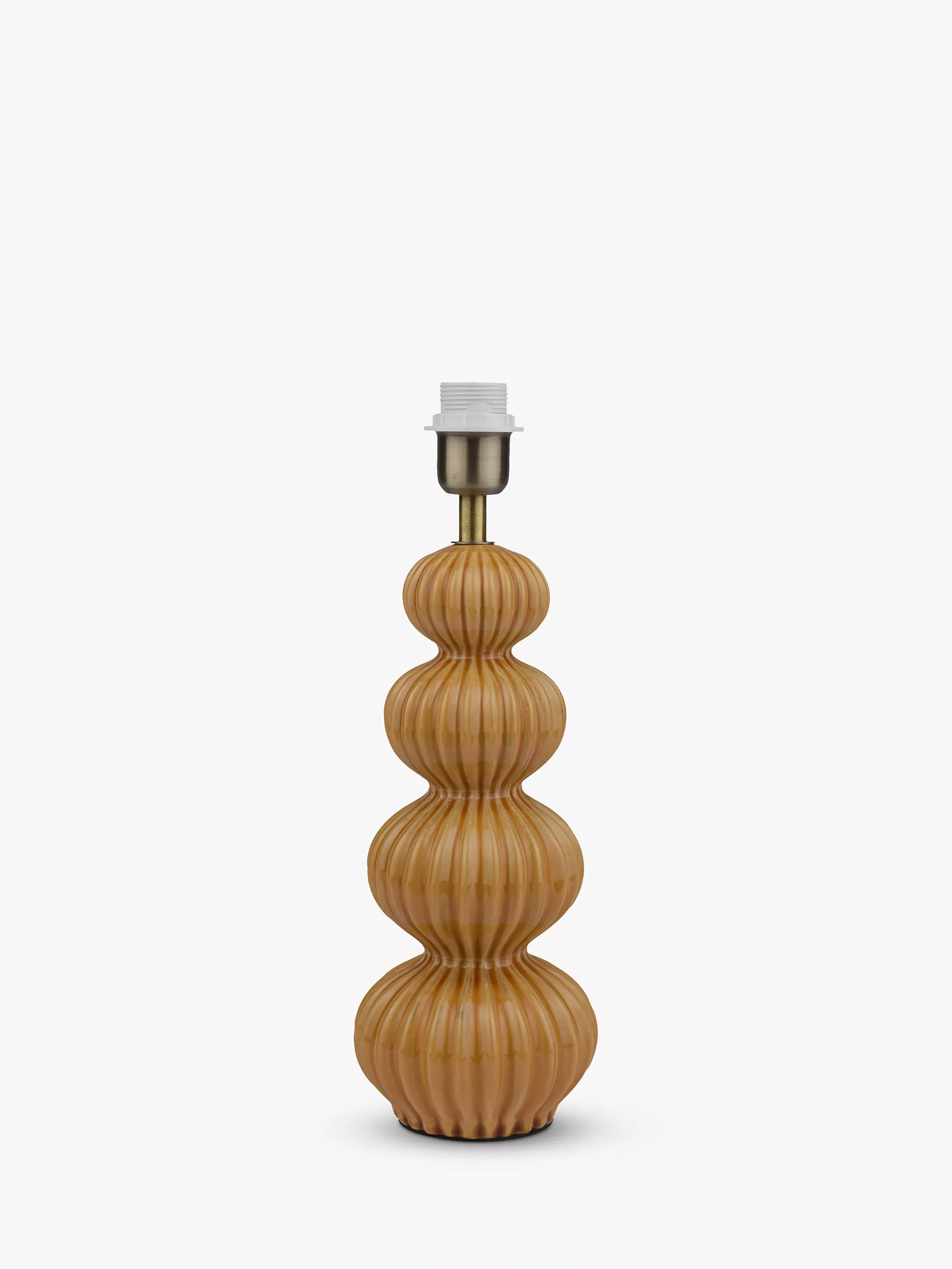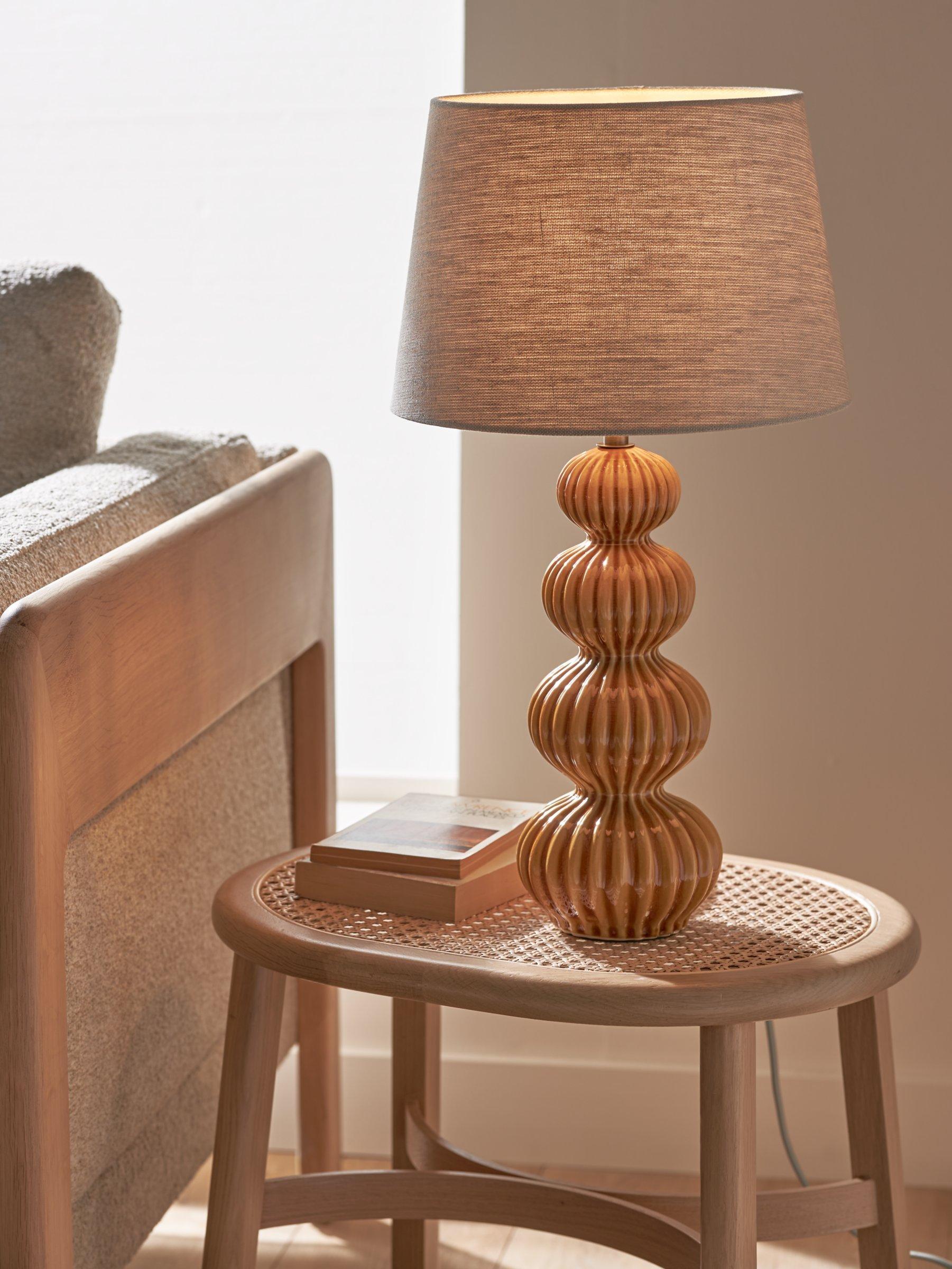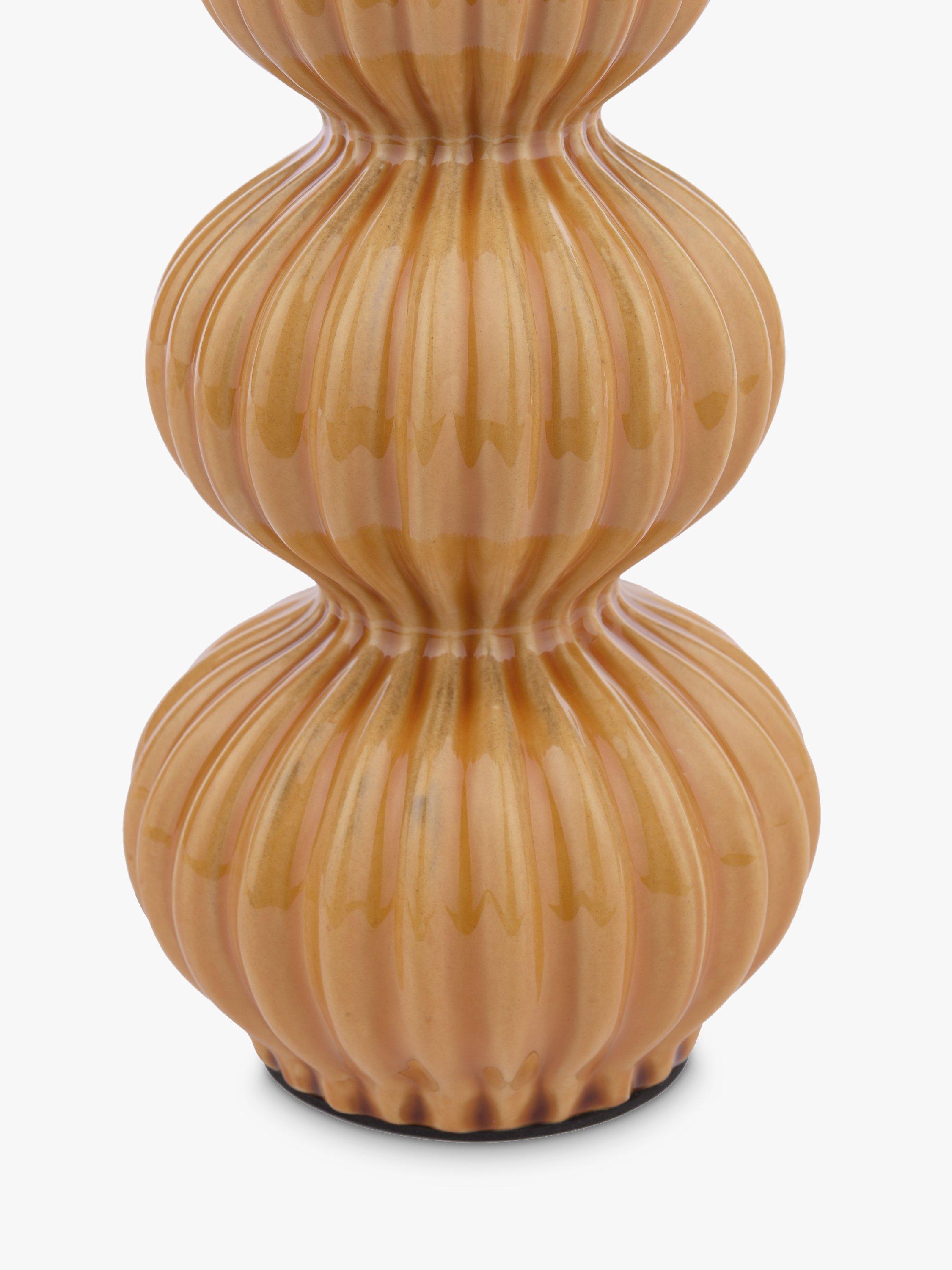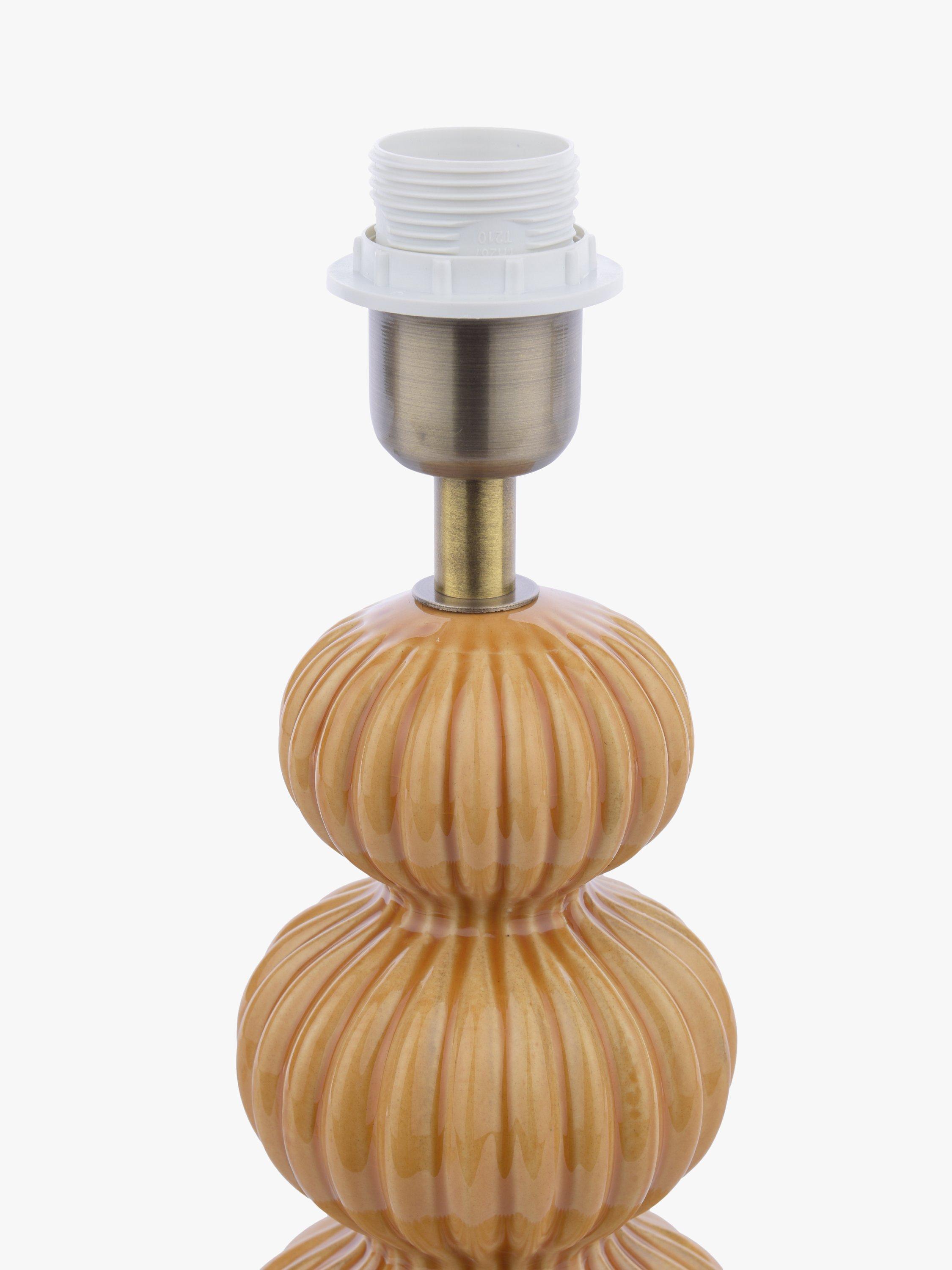 This lamp base is elegant and stylish with its bold shape and detailed ribbed silhouette. The grey transparent ceramic glaze picks out different tones of colour within the ribbing to create a timeless design. Finish with antique brass metalwork and a grey fabric flex.