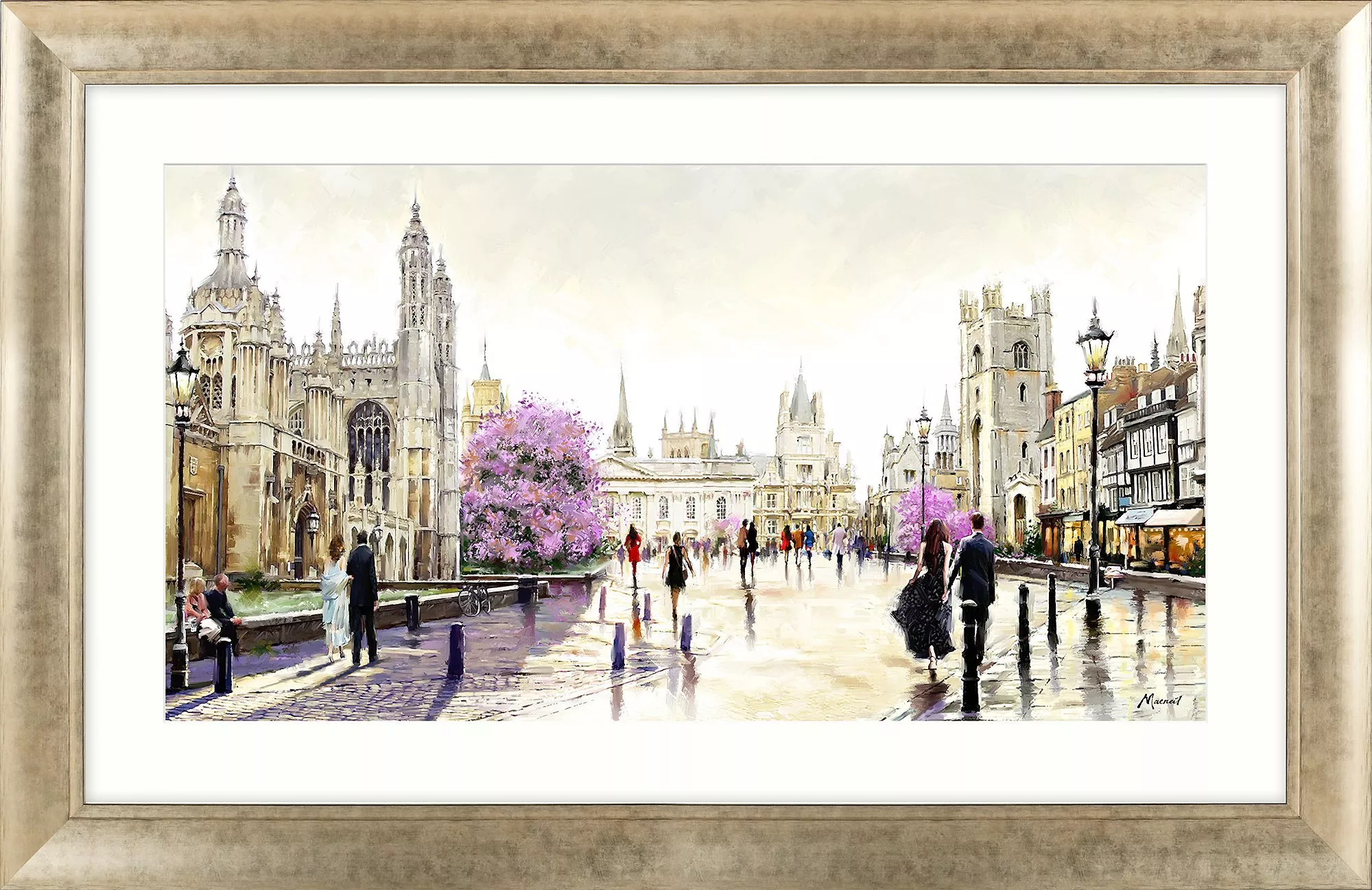 Colourful and detailed 'Cambridge Spires' by Richard Macneil, featuring beautiful blossomed trees, complete with intricate buildings and cobbled pavements.