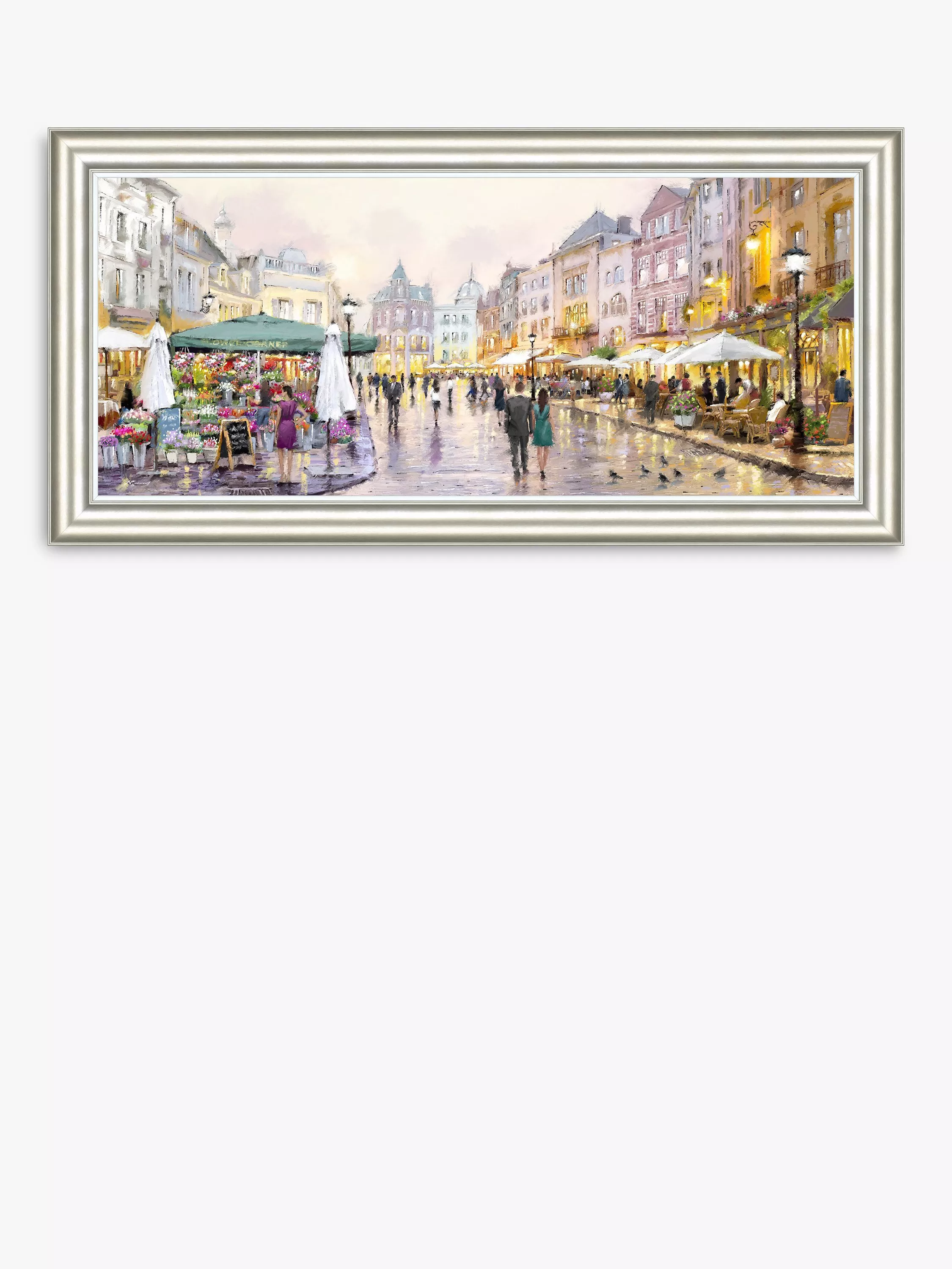 Depicting the evening glow of a romantic city, Richard Macneil paints a couple walking hand in hand through a plaza. The print has a lightweight metallic frame and arrives ready to hang on your wall.