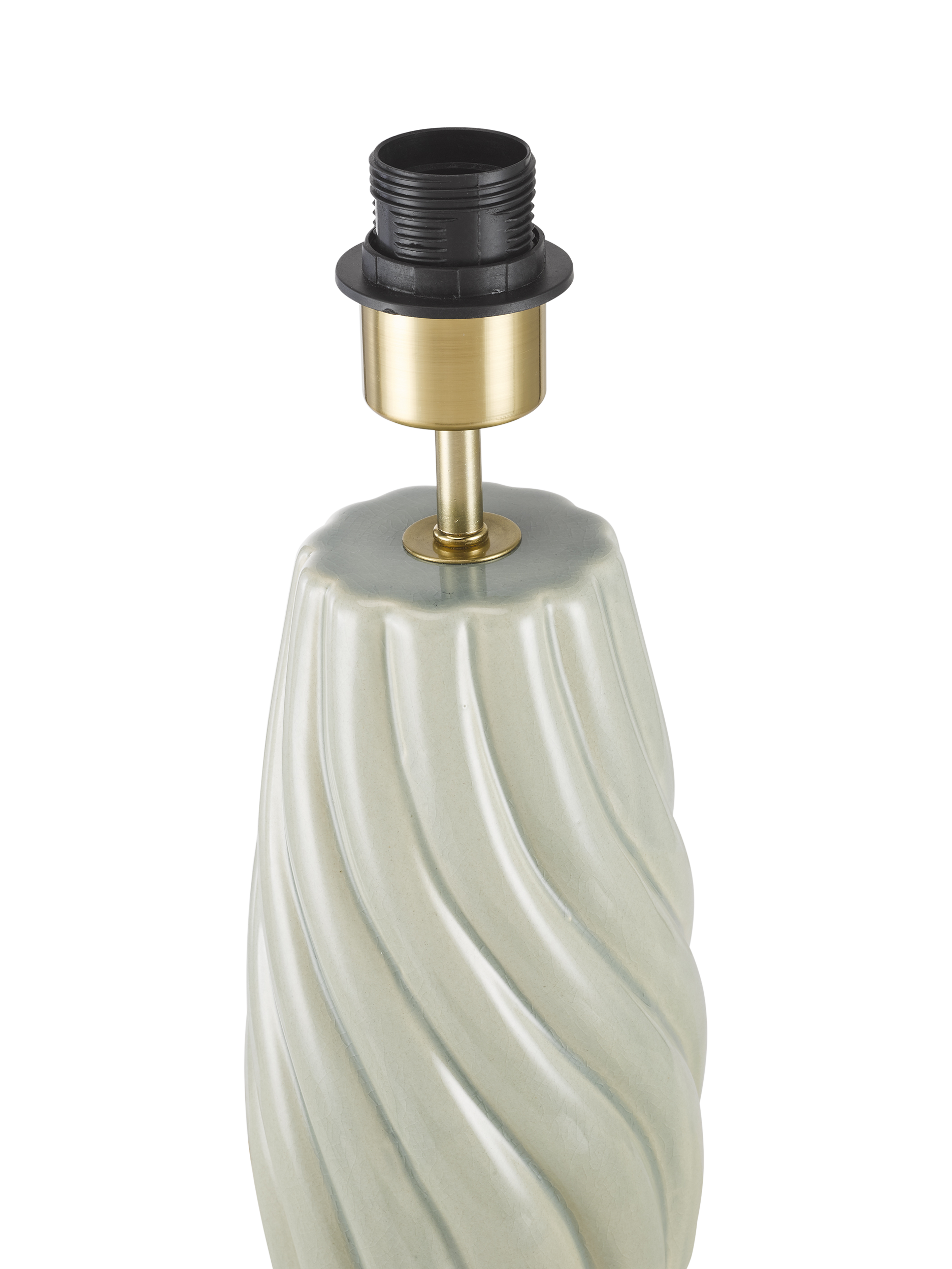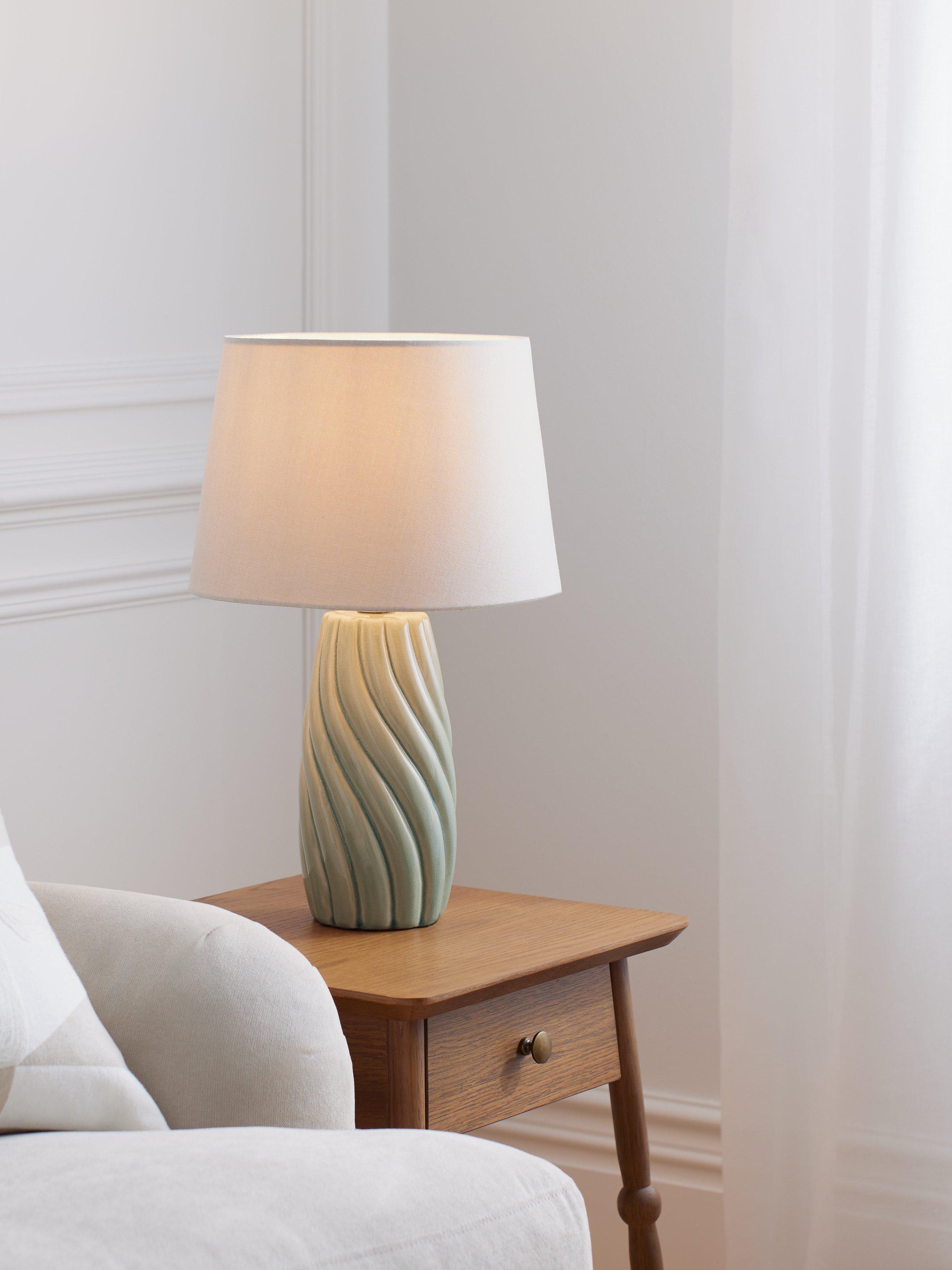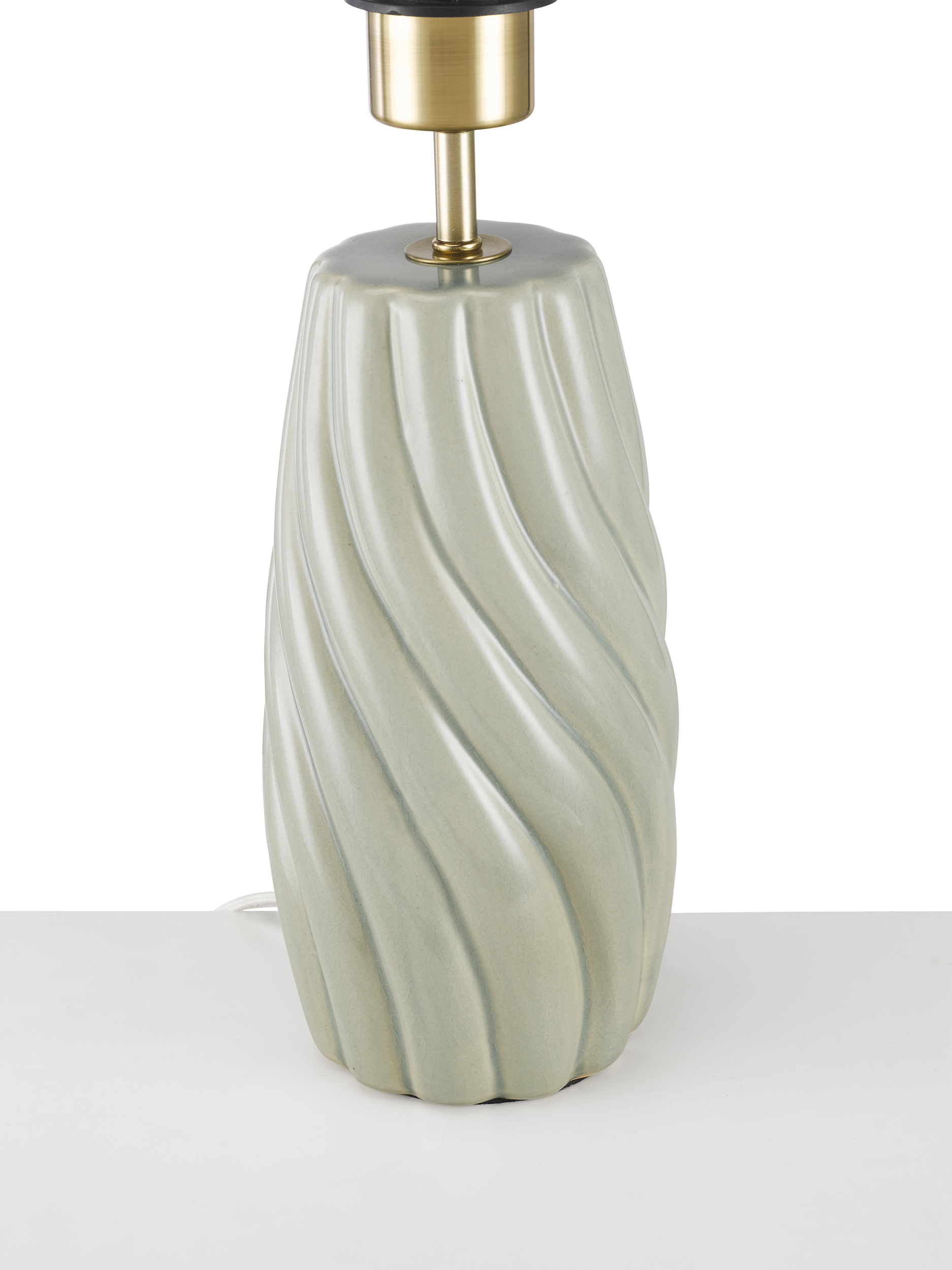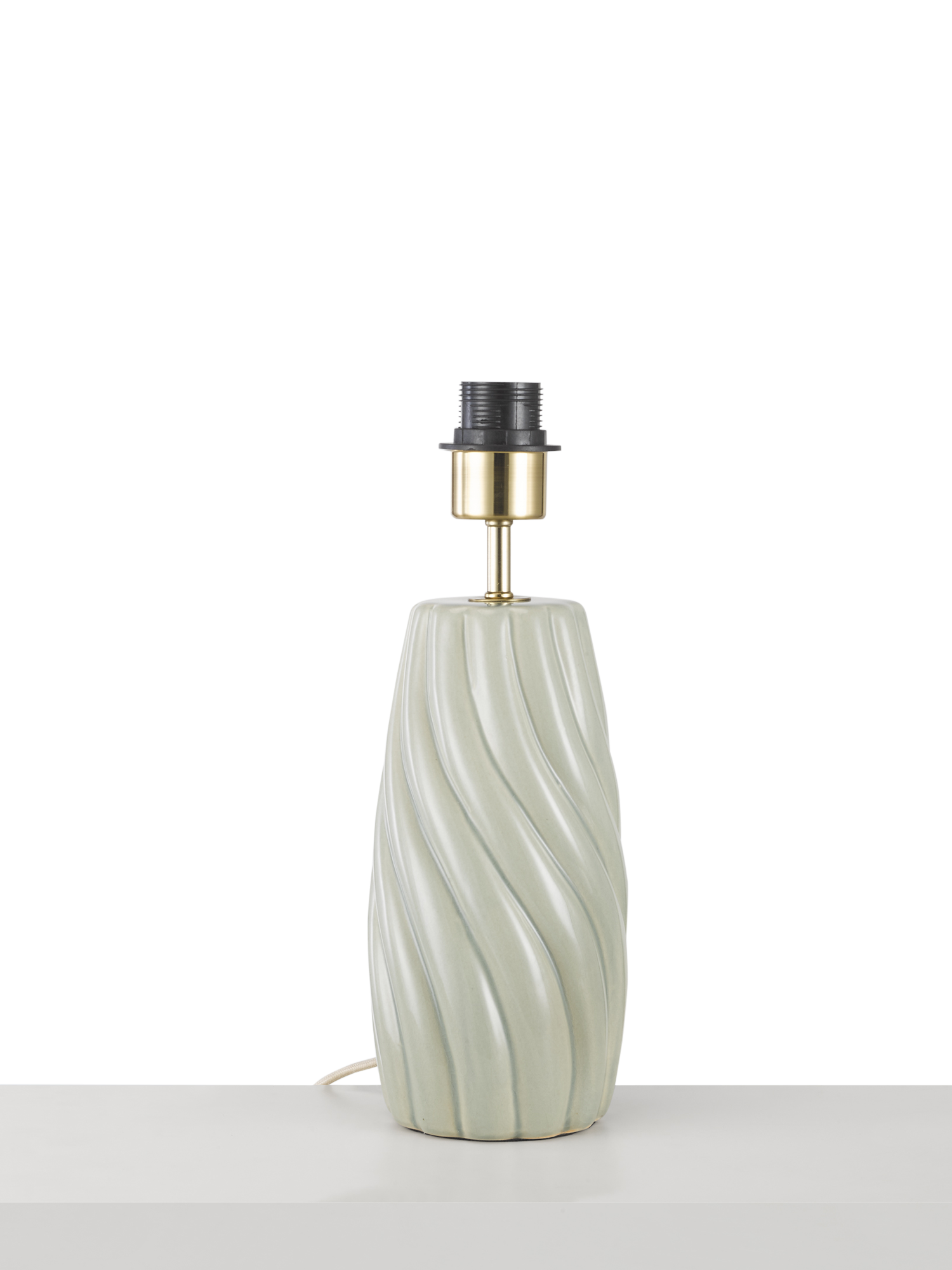 A beautiful ceramic base with a soft twist that ripples down. A transparent gloss glaze picks up its detail. The fabric cable, in a soft cream tone, complements the finish.