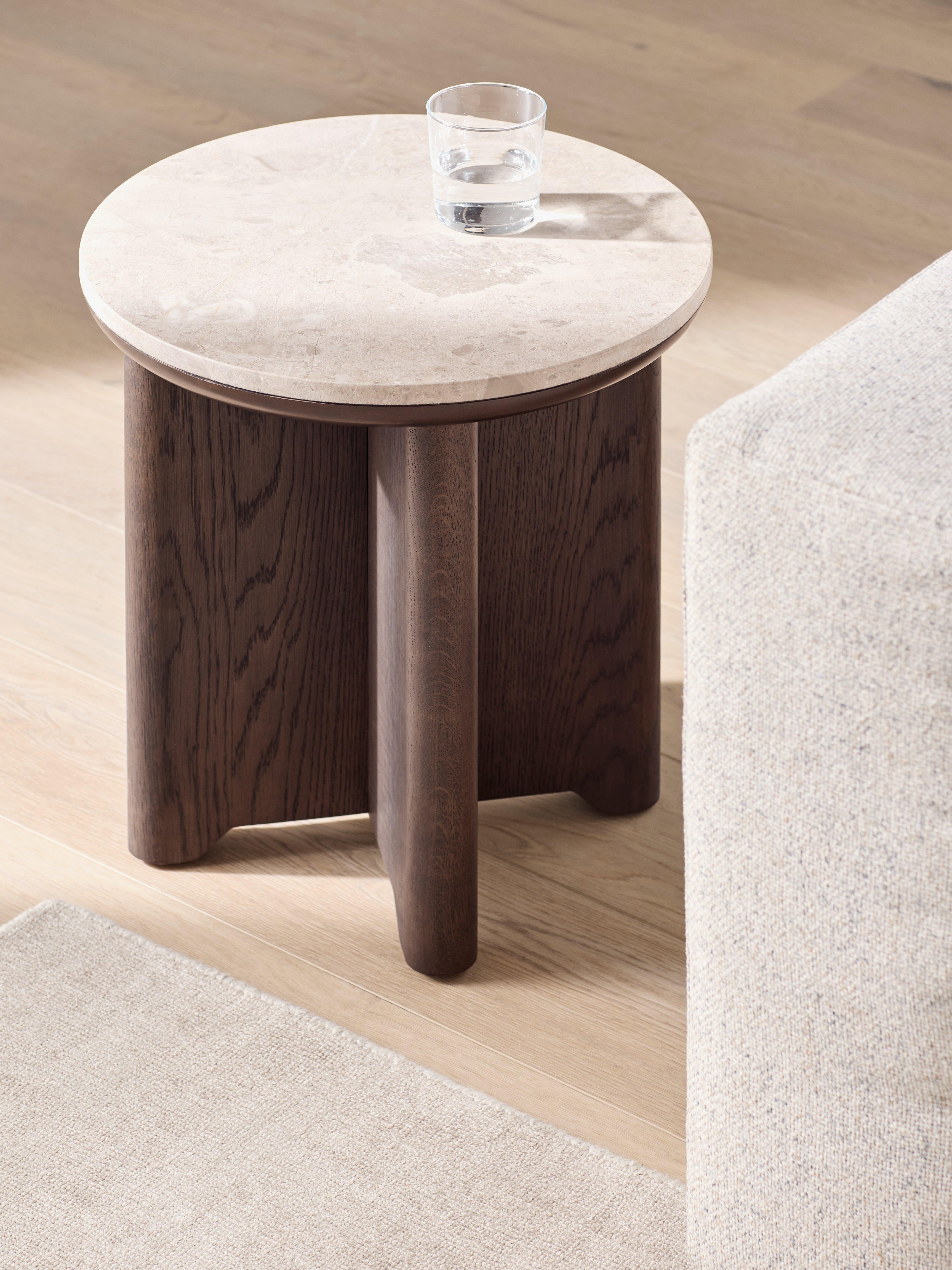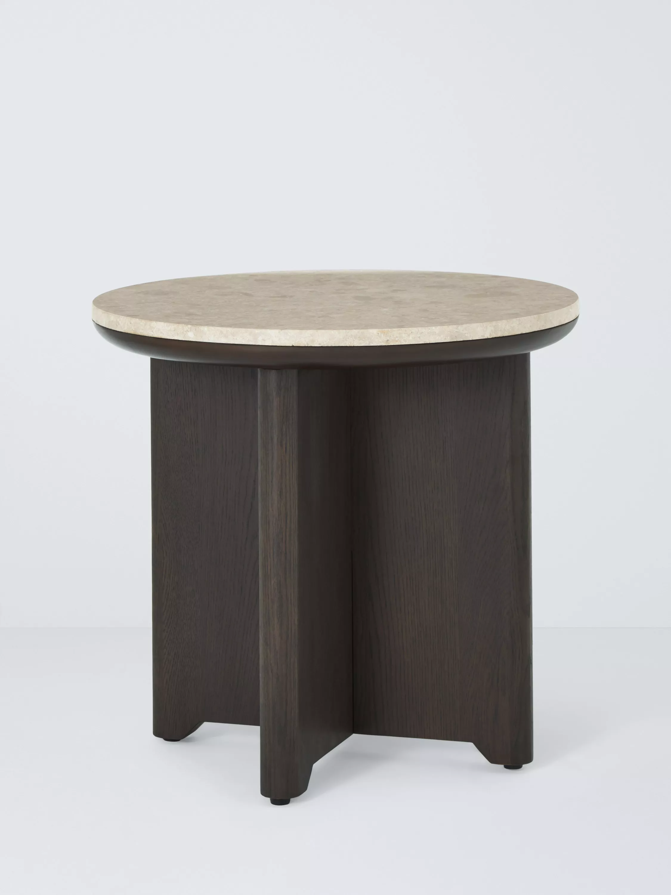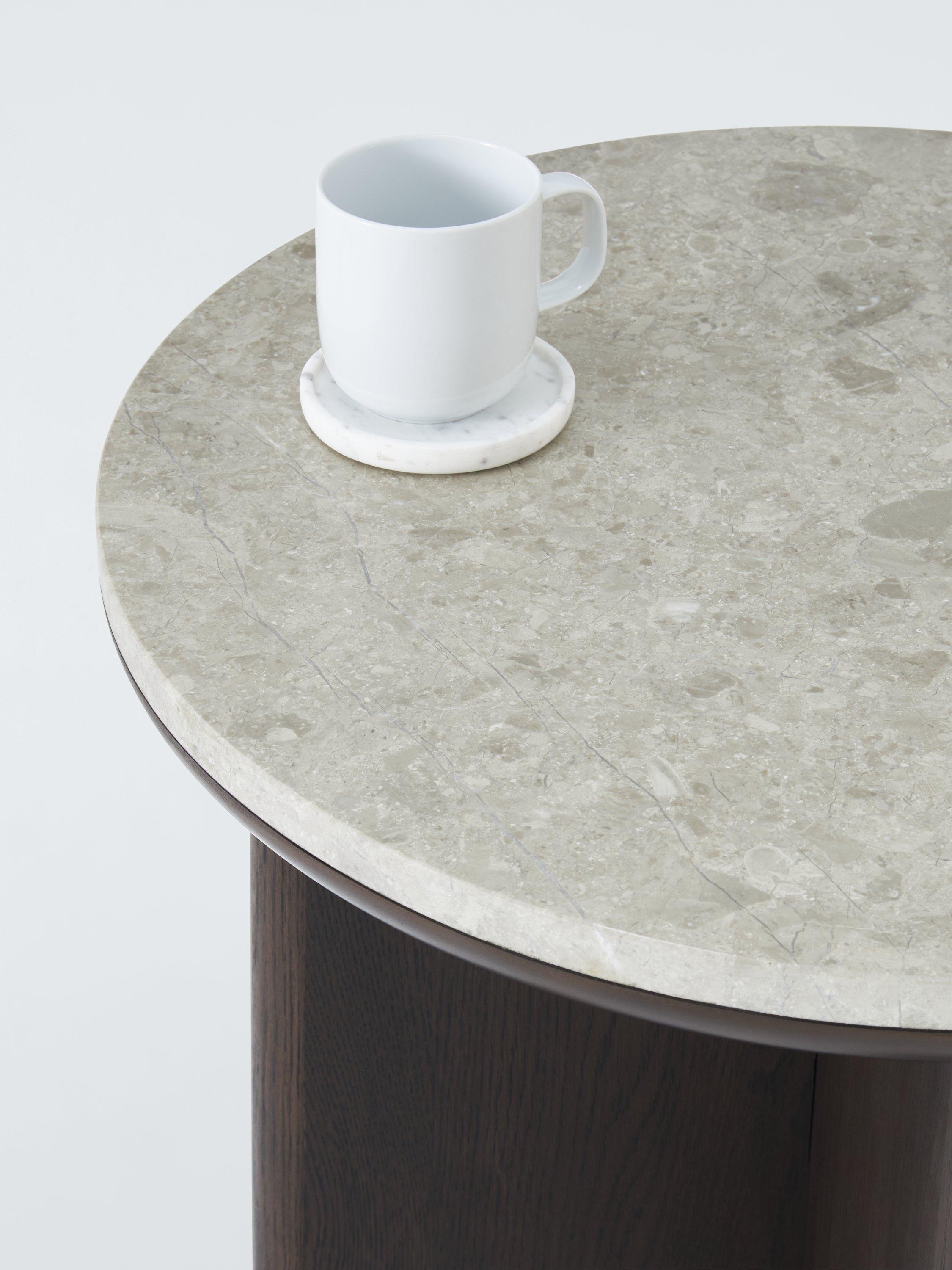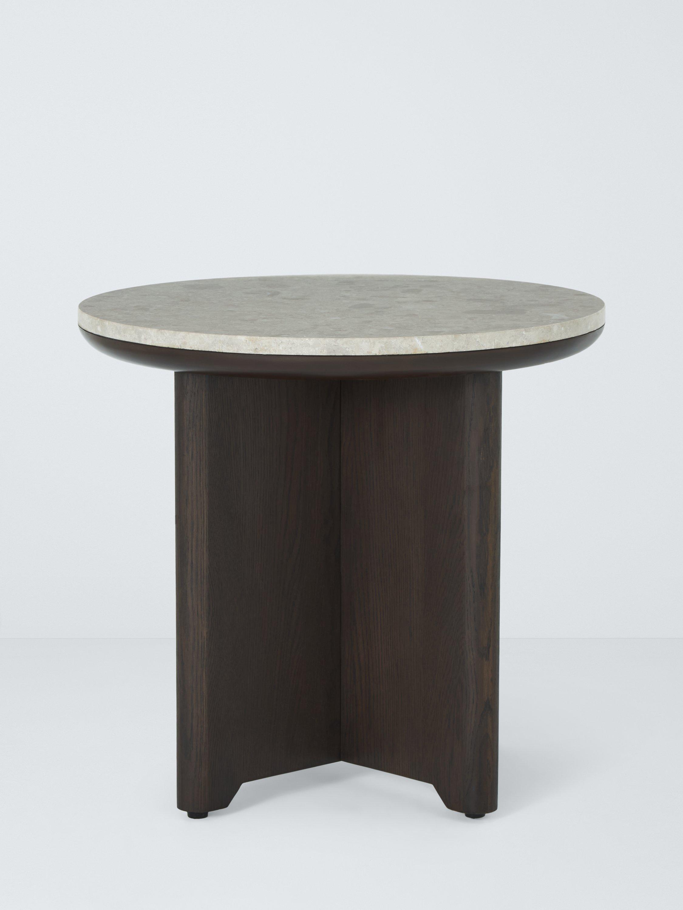 This round side table has a sturdy cross-shaped base and a smooth marble top that will vary with every piece, making it unique.