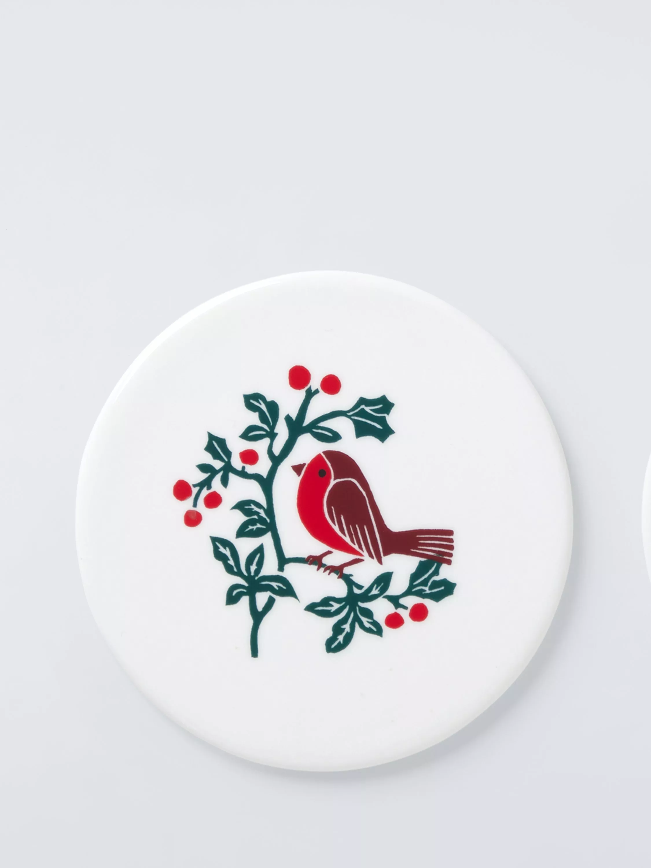 Festive round coaster with a folk art-inspired robin design in Christmas colours. Made of fine china, it's heat-resistant to protect table surfaces.